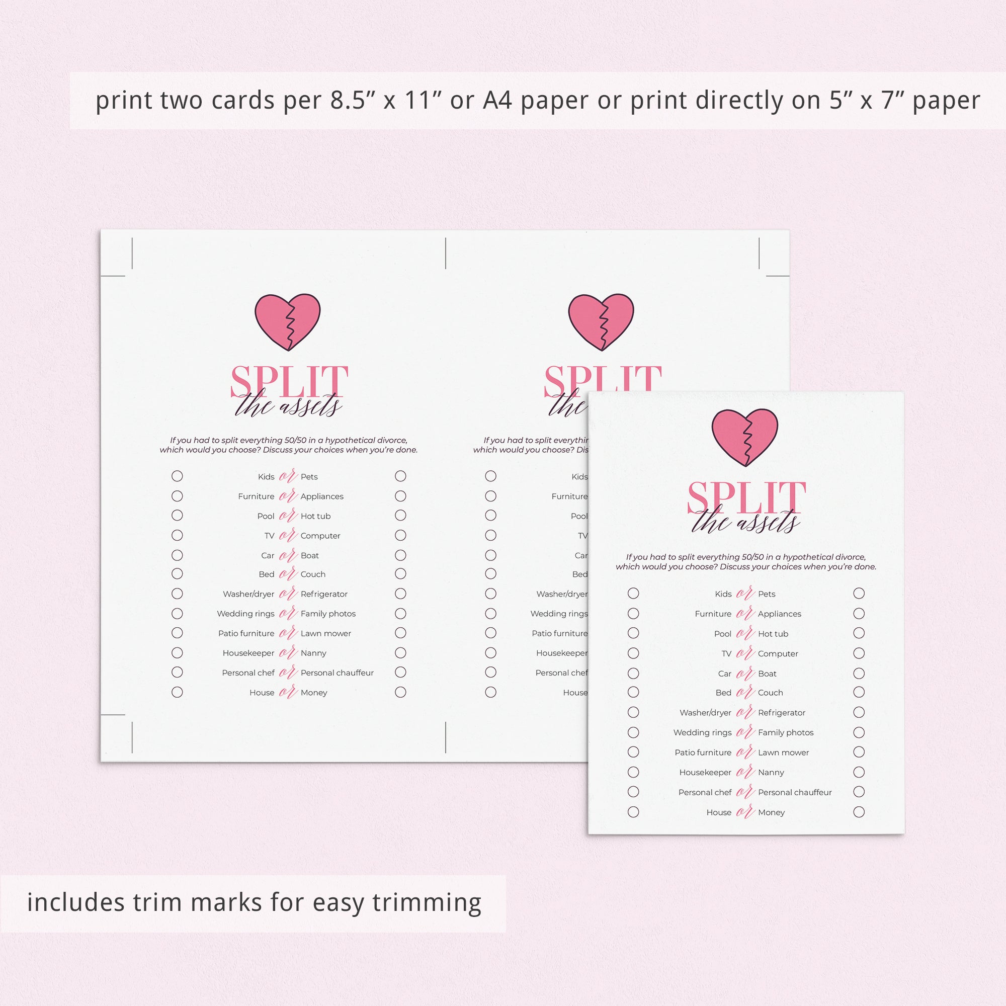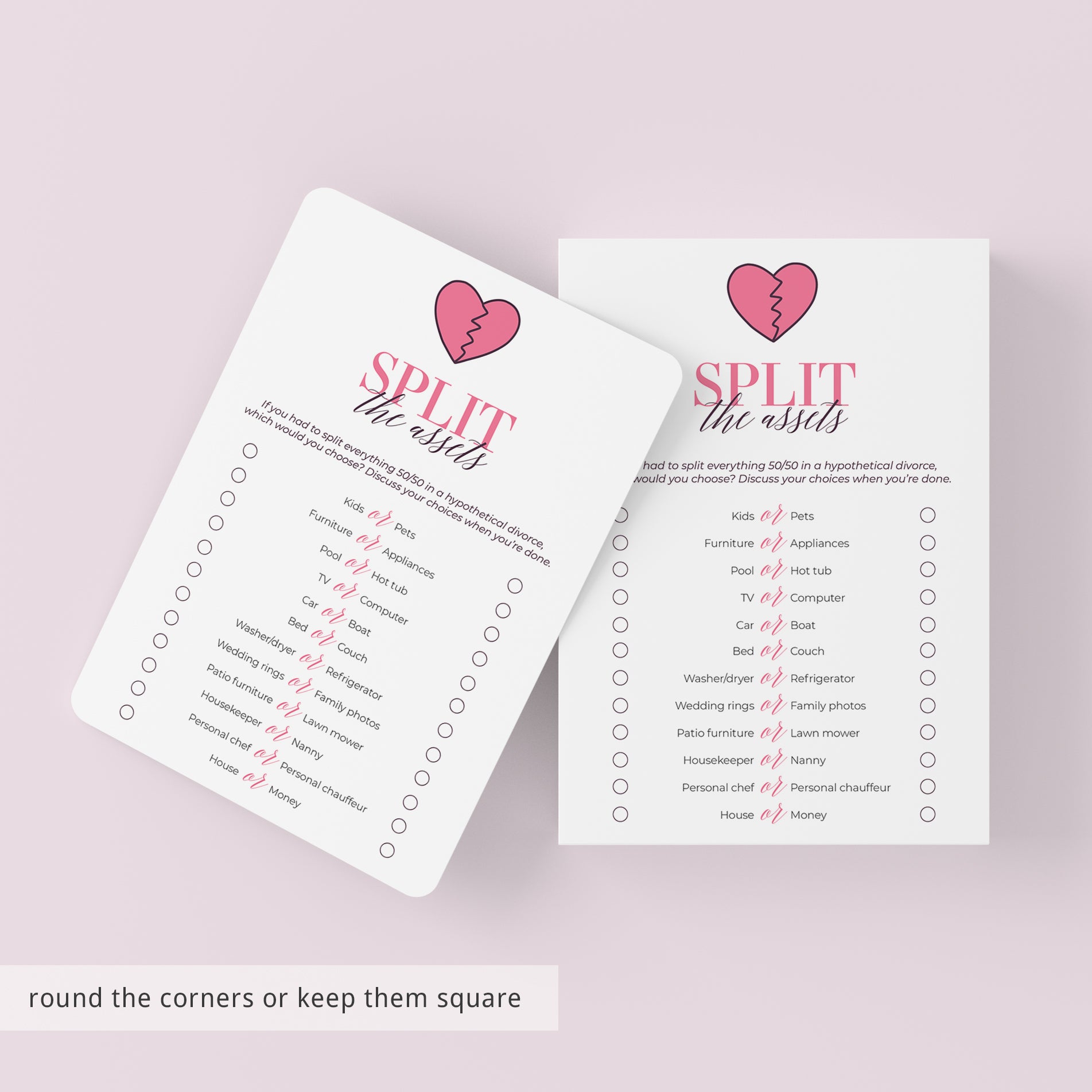 Are you looking for a fun icebreaker game for your split up party? Play Split The Assets. It's is a great conversation starter for your breakup party. If you had the split everything 50/50 in a hypothetical divorce, which would you choose?