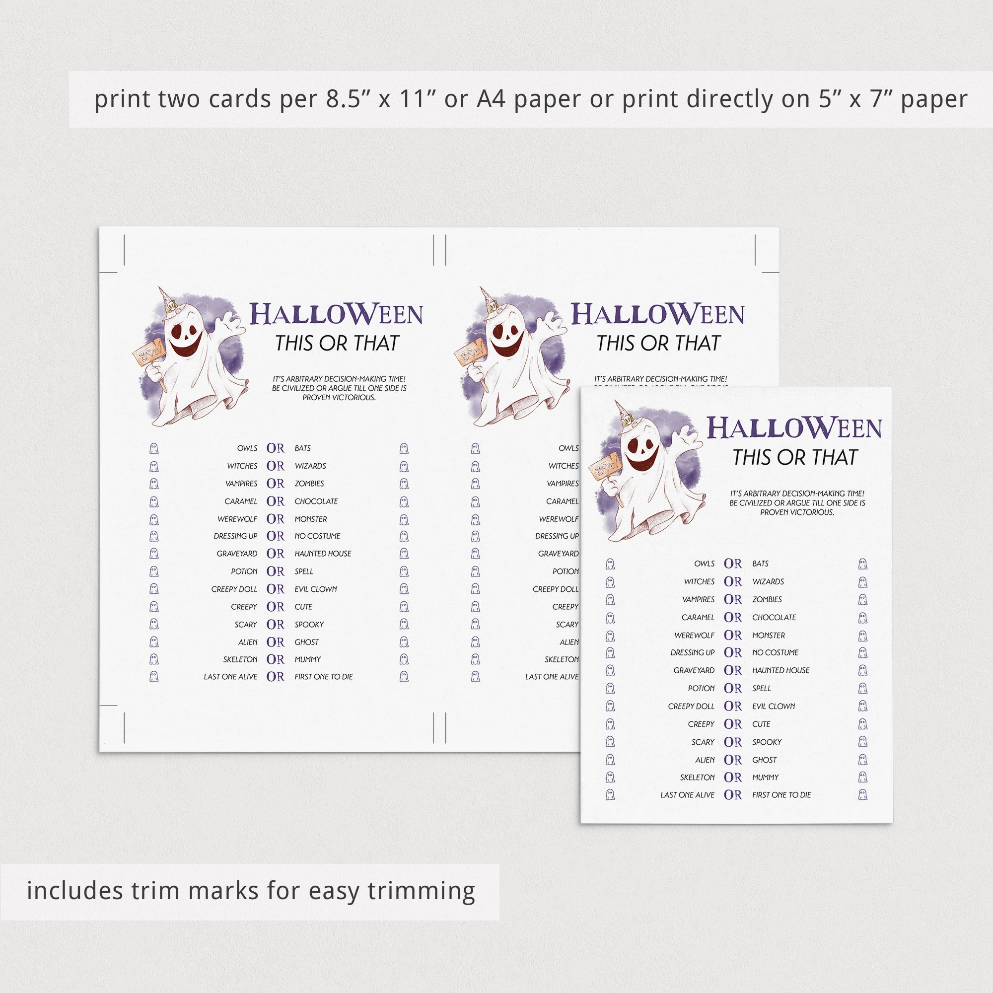 Are you looking for a fun icebreaker game for your Halloween party? Play This or That. It's is a great conversation starter and will definitely get your guests mingling and laughing. This Spooky Halloween This or That game has 14 Would You Rather questions. Have your guests pick their preferences and defend their choice. Would you rather be the last one alive or the first one to die...?