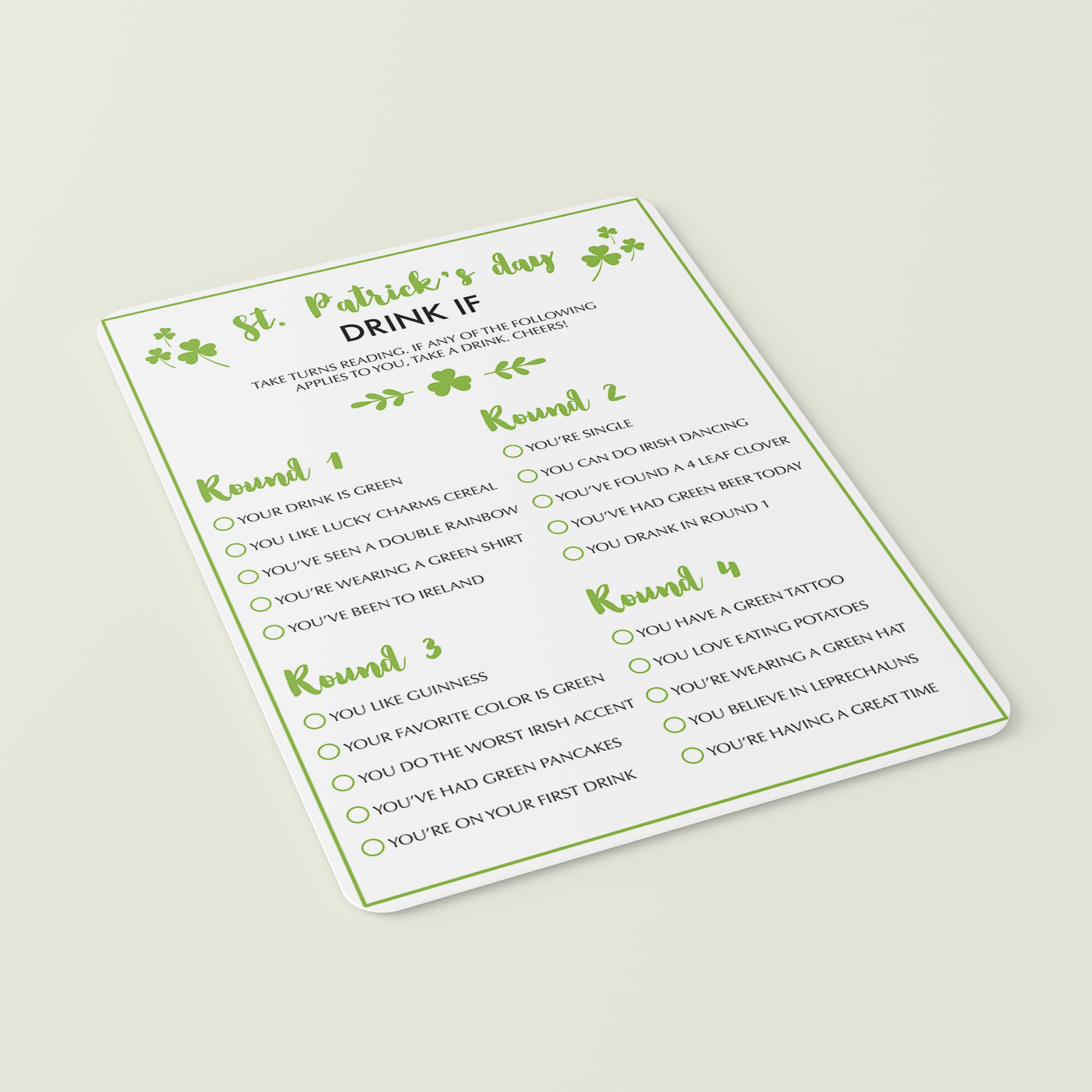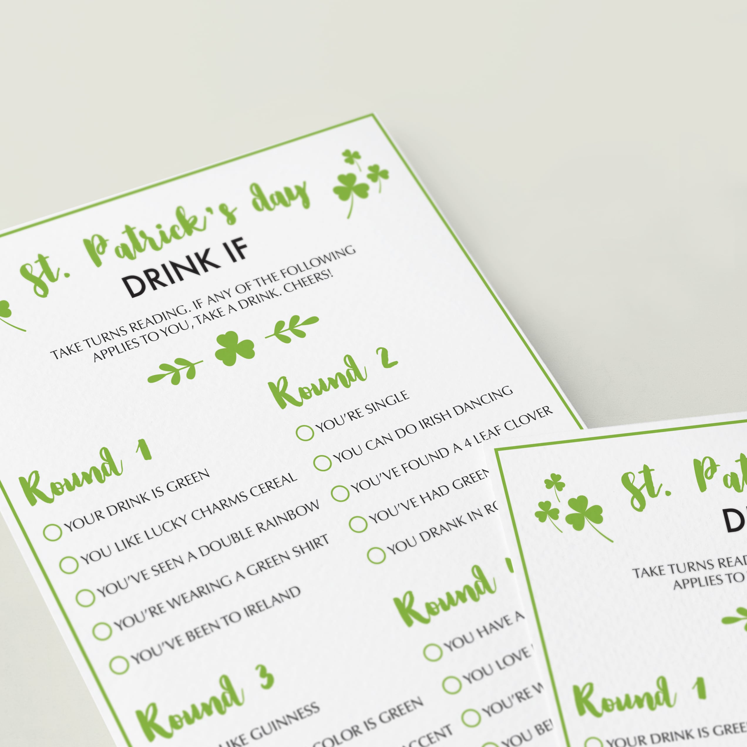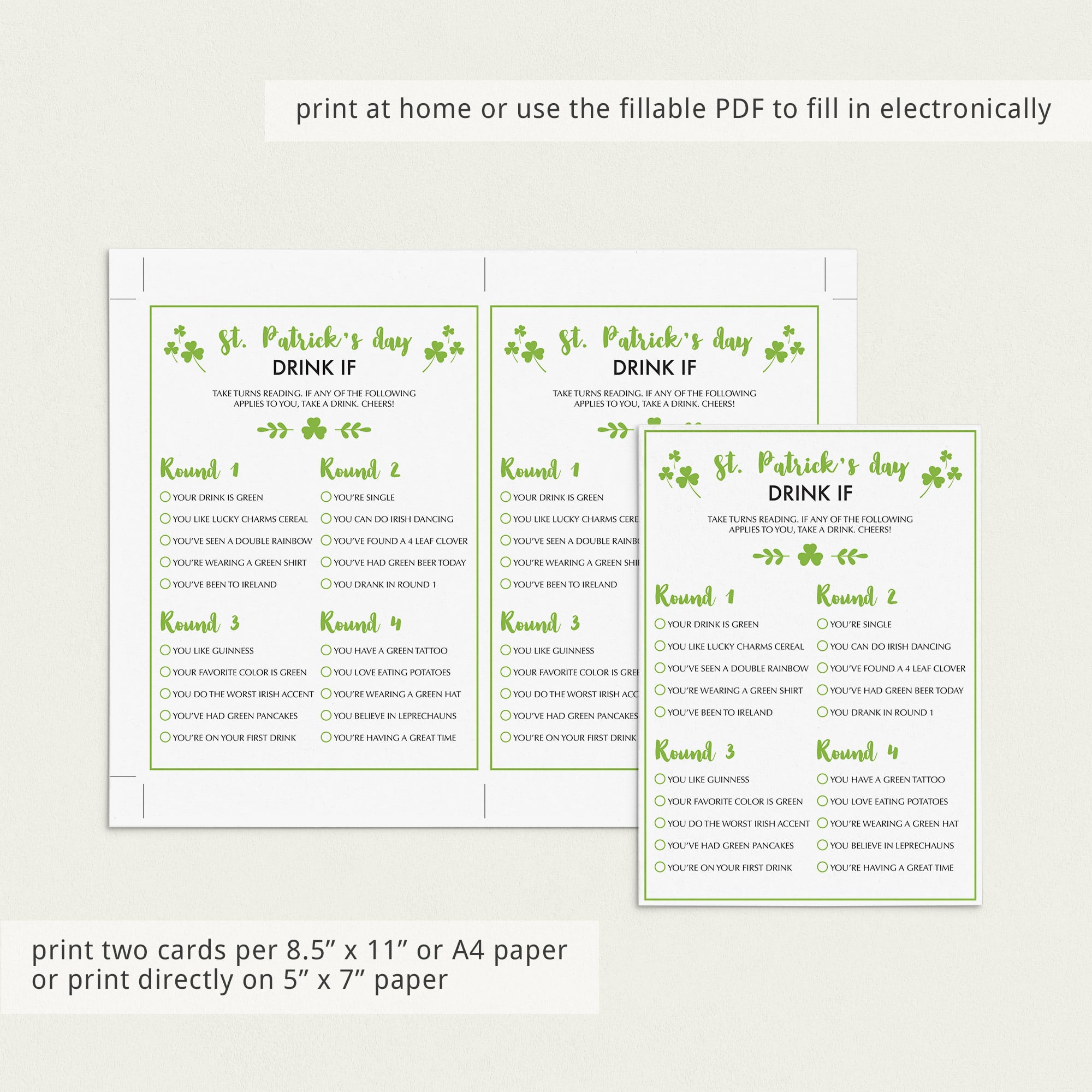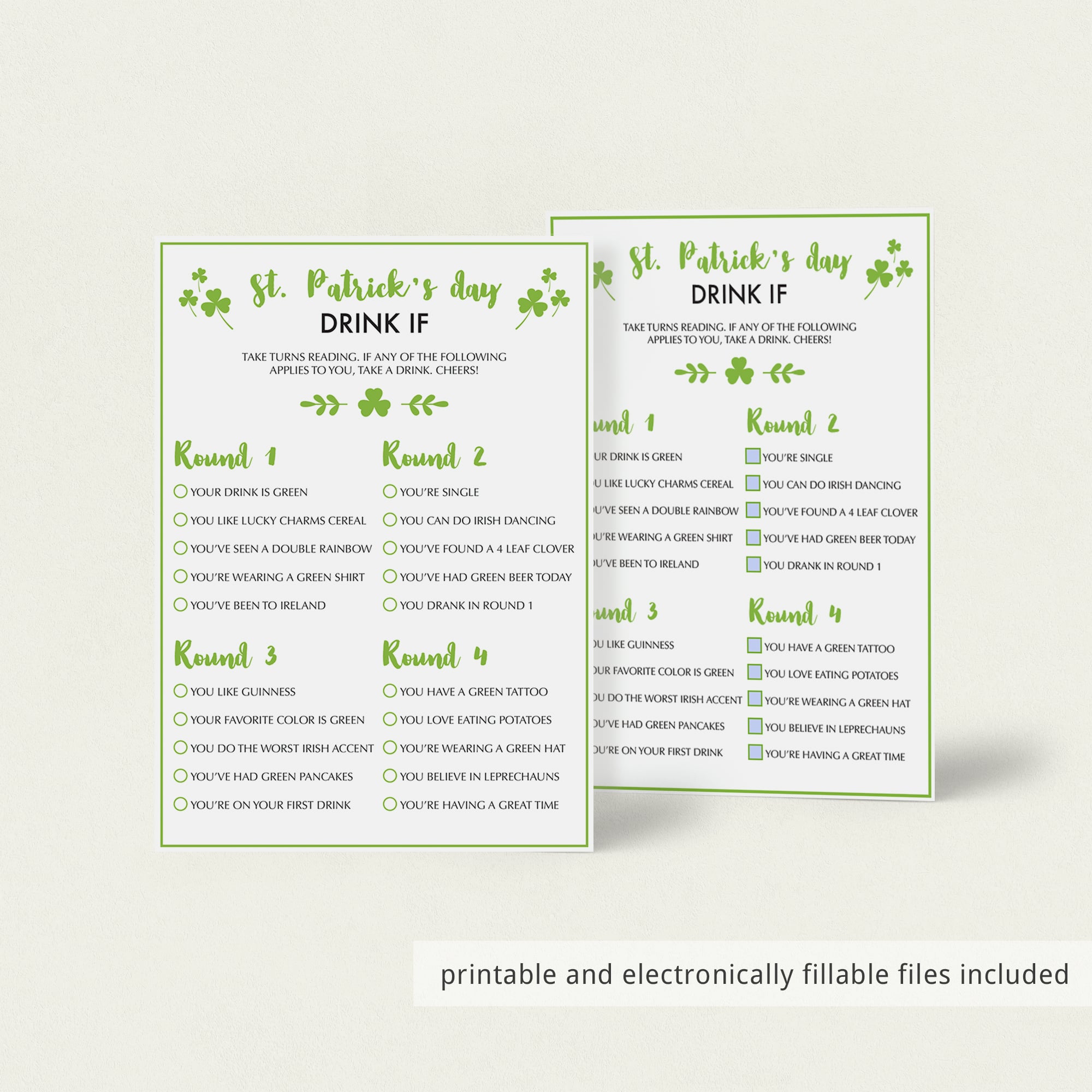 Printable and electronically fillable files are included, so even if you are celebrating a socially distanced St. Patrick's Day party this year, you can still play this fun drinking game.
