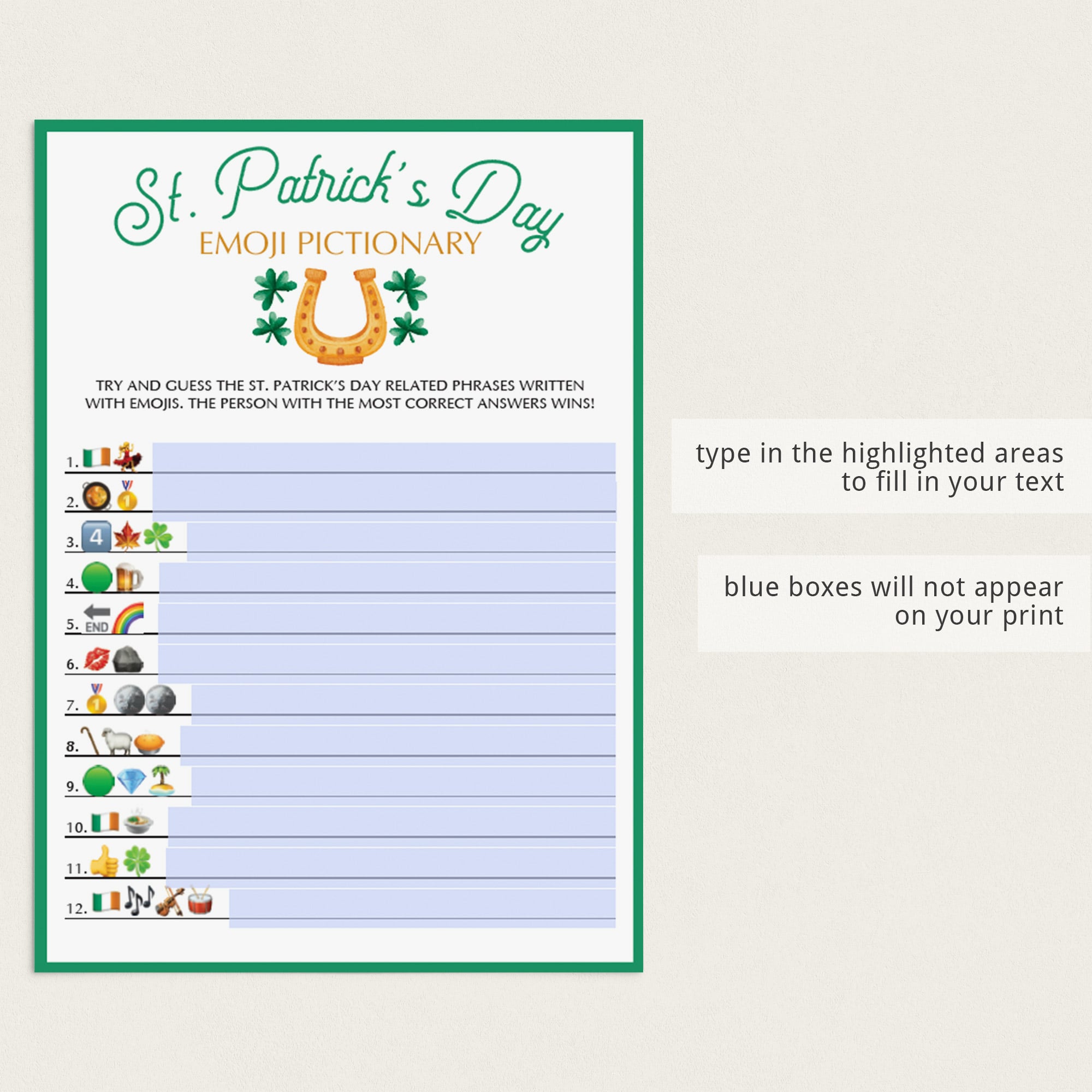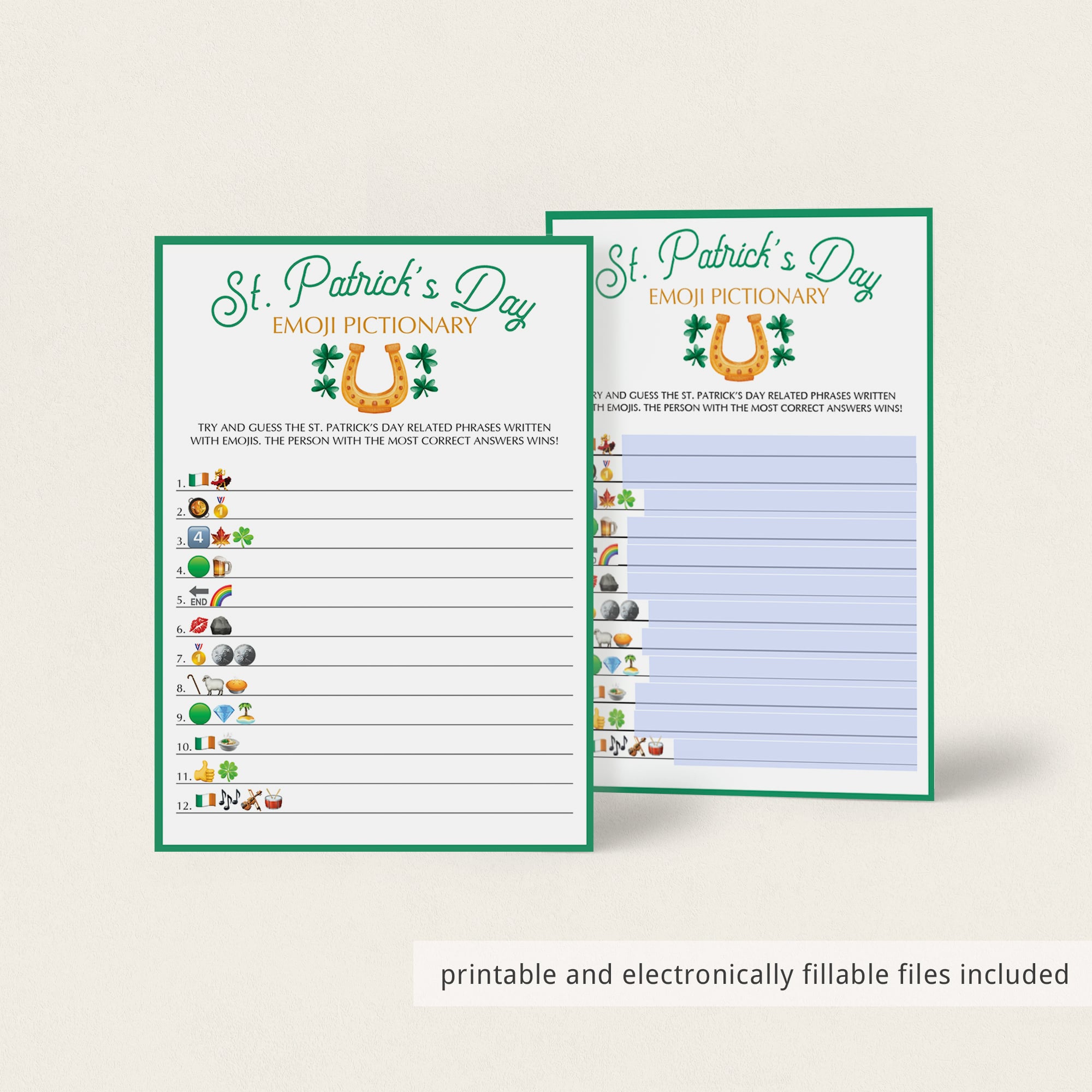 Printable and virtual fillable files are included, so that you can play this St. Patrick's Day emoji game in-person at home or on a video conference call app like Zoom or Teams.