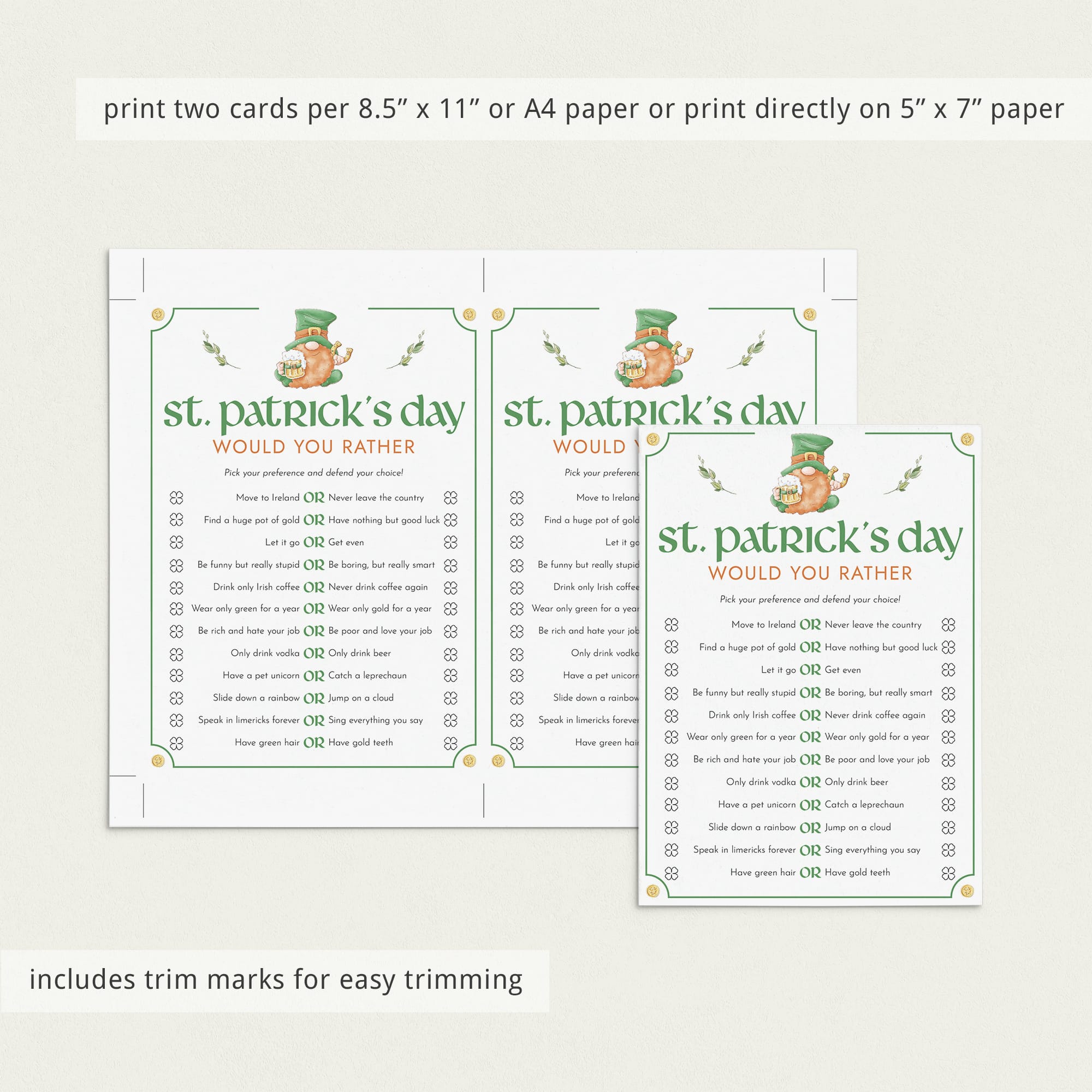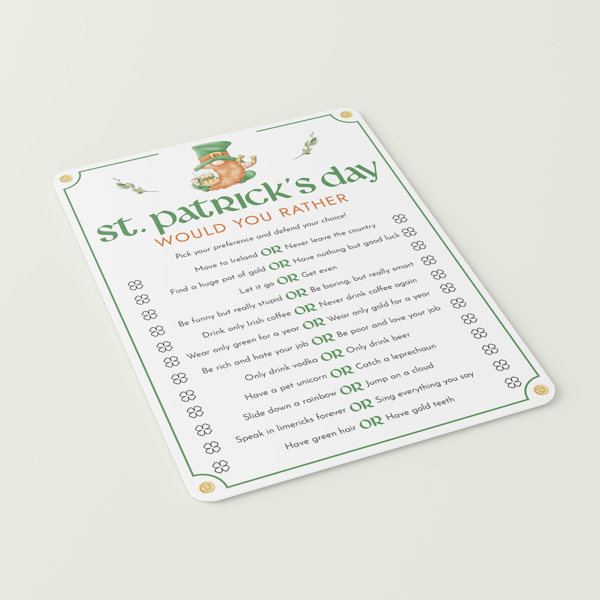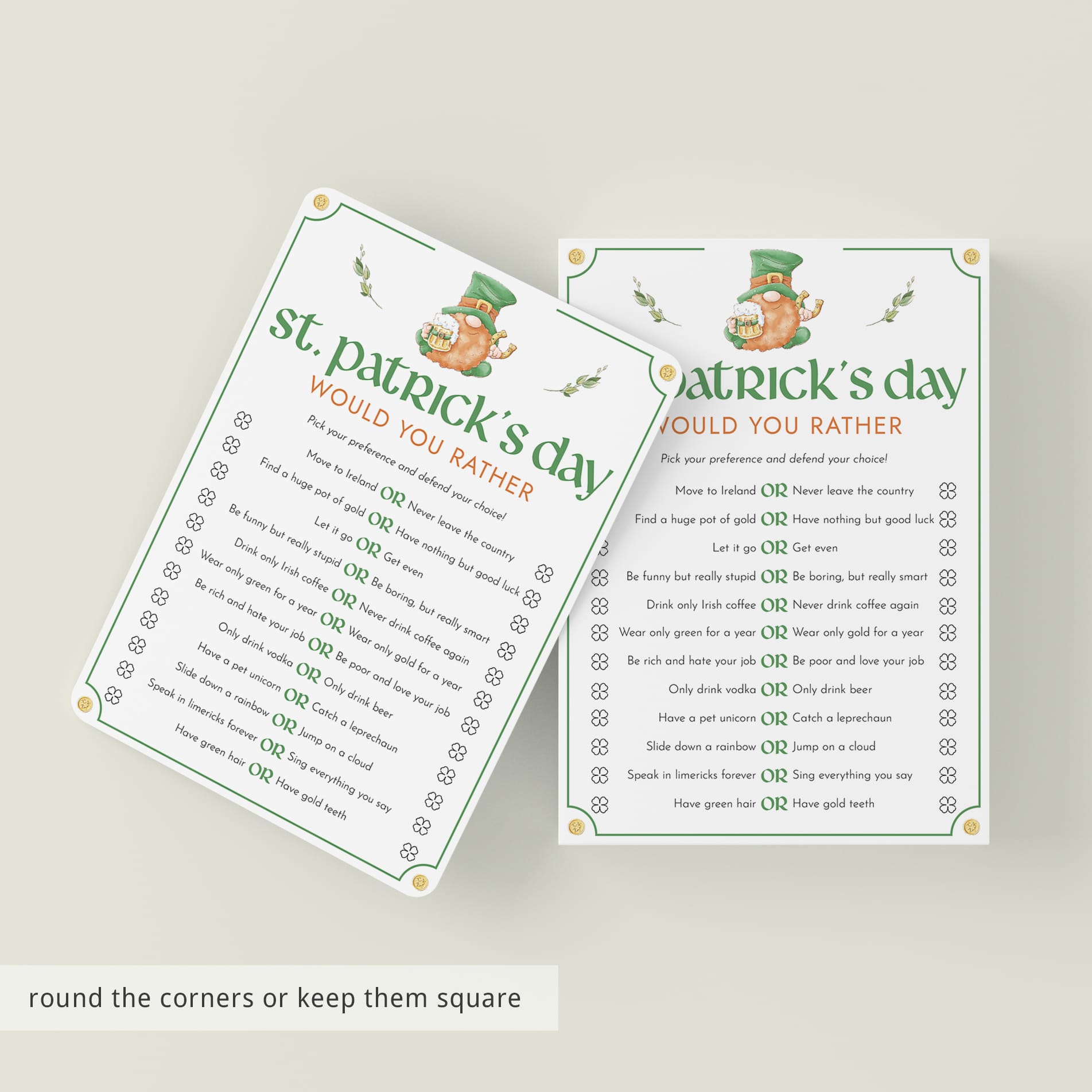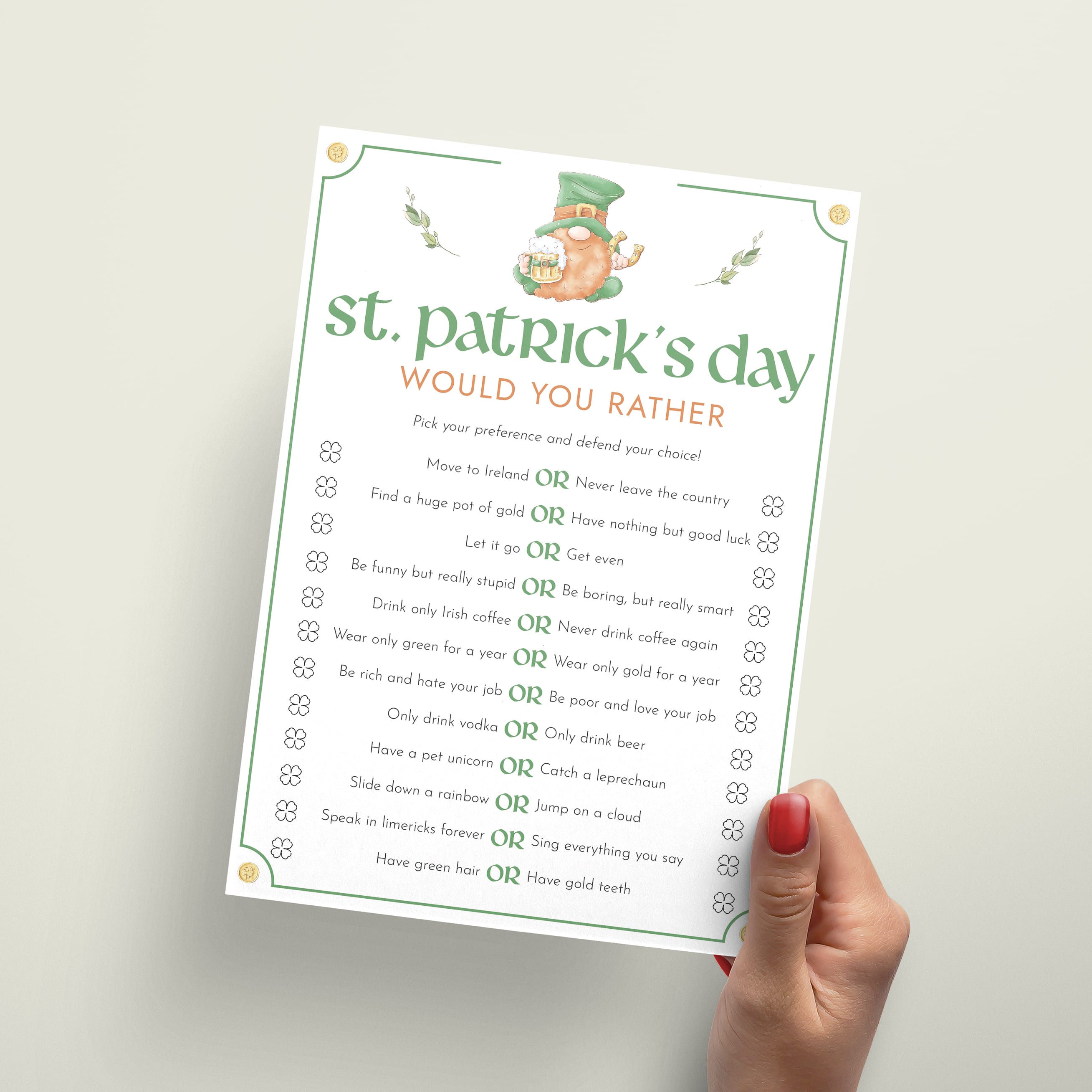 Are you looking for a fun icebreaker game for your St. Patricks Day party? Play This or That. It's is a great conversation starter. This fun St. Patrick's Day game has 12 Would You Rather questions. Have all your friends pick their preferences and defend their choice.