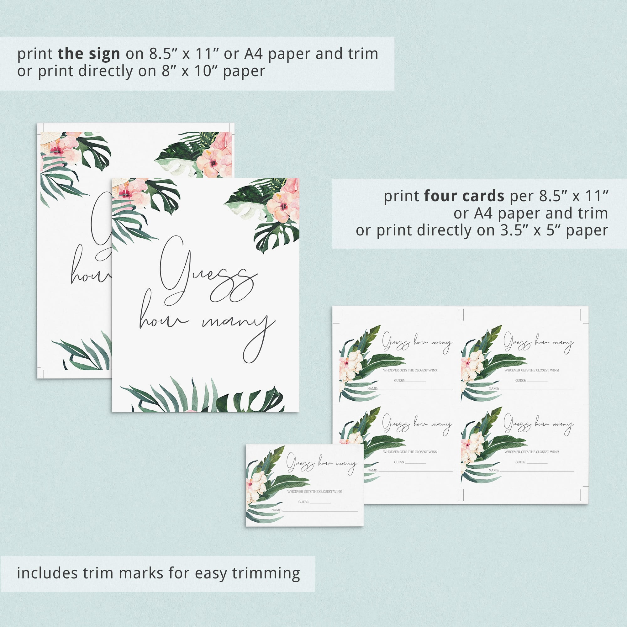 Guessing games are a huge hit at baby showers. Most people love the fun of guessing and the potential thrill of finding out they have guessed right. Kick off the fun and get your guests involved with this summer baby shower activities bundle with 3 guessing games. The tropical theme signs and matching guessing cards with botanical leaves and flowers are perfect for a summer baby shower.