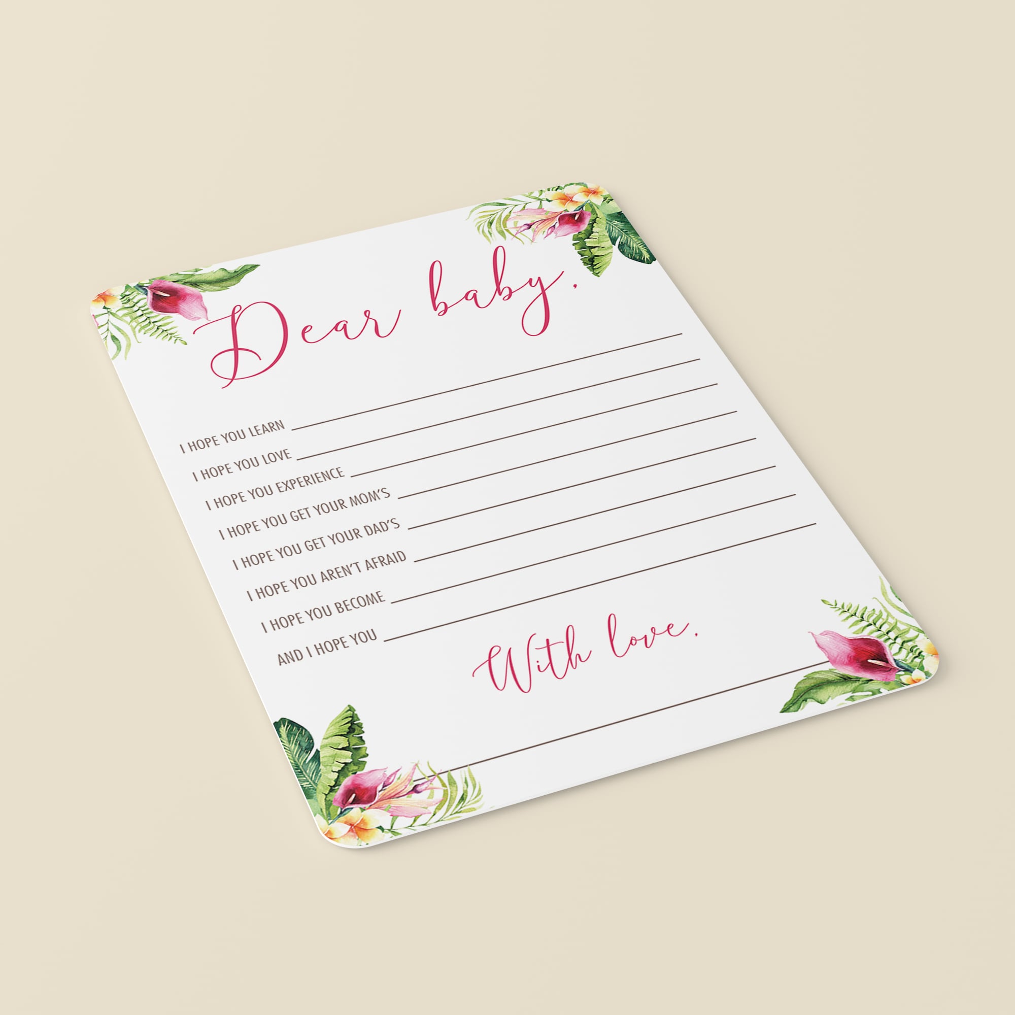 Are you hosting a baby shower in summer? Create a magnificent keepsake with this summer baby shower wishes for baby cards with tropical flowers. Let every baby shower guest write down their wishes for the little girl and collect the tropical cards for the lucky mom-to-be.