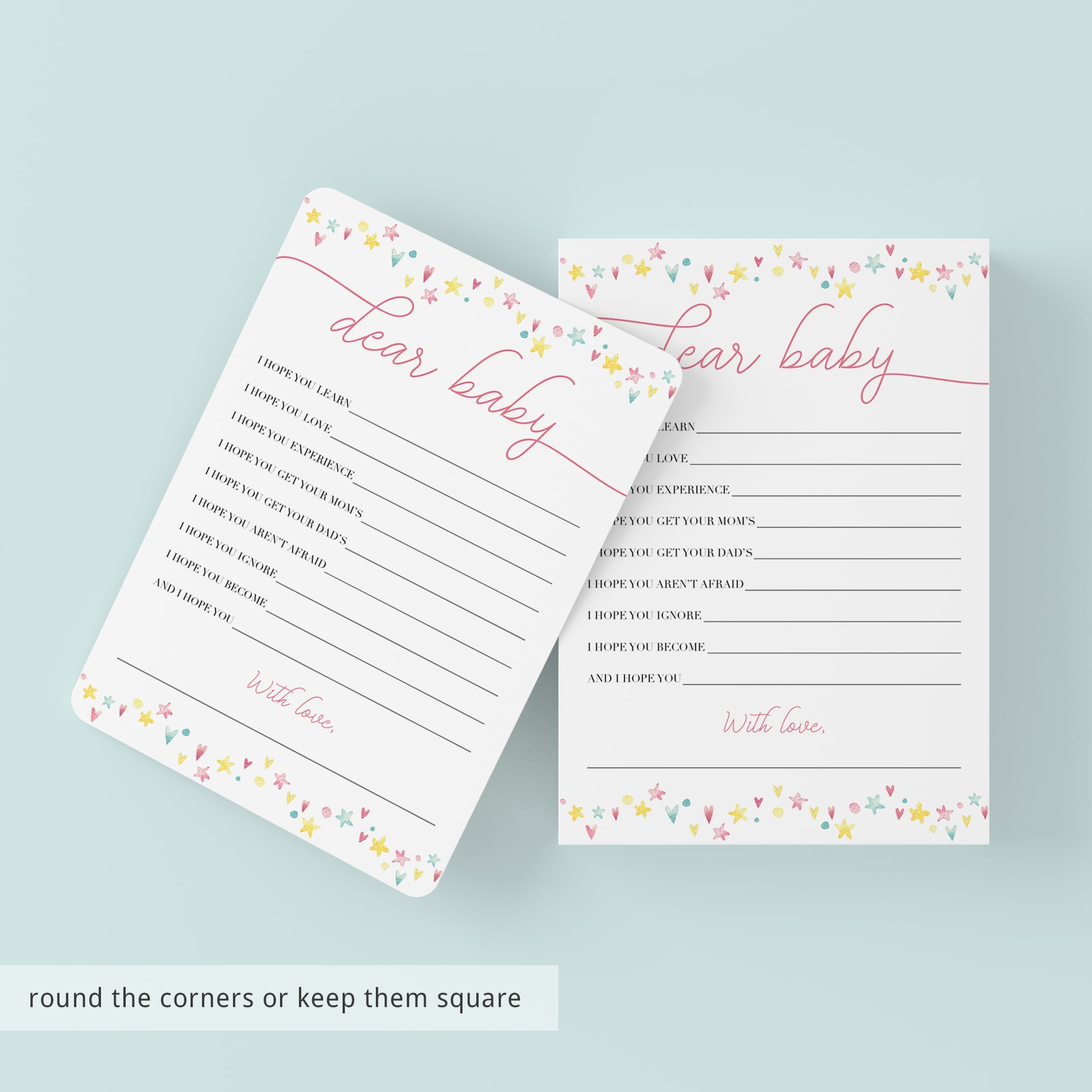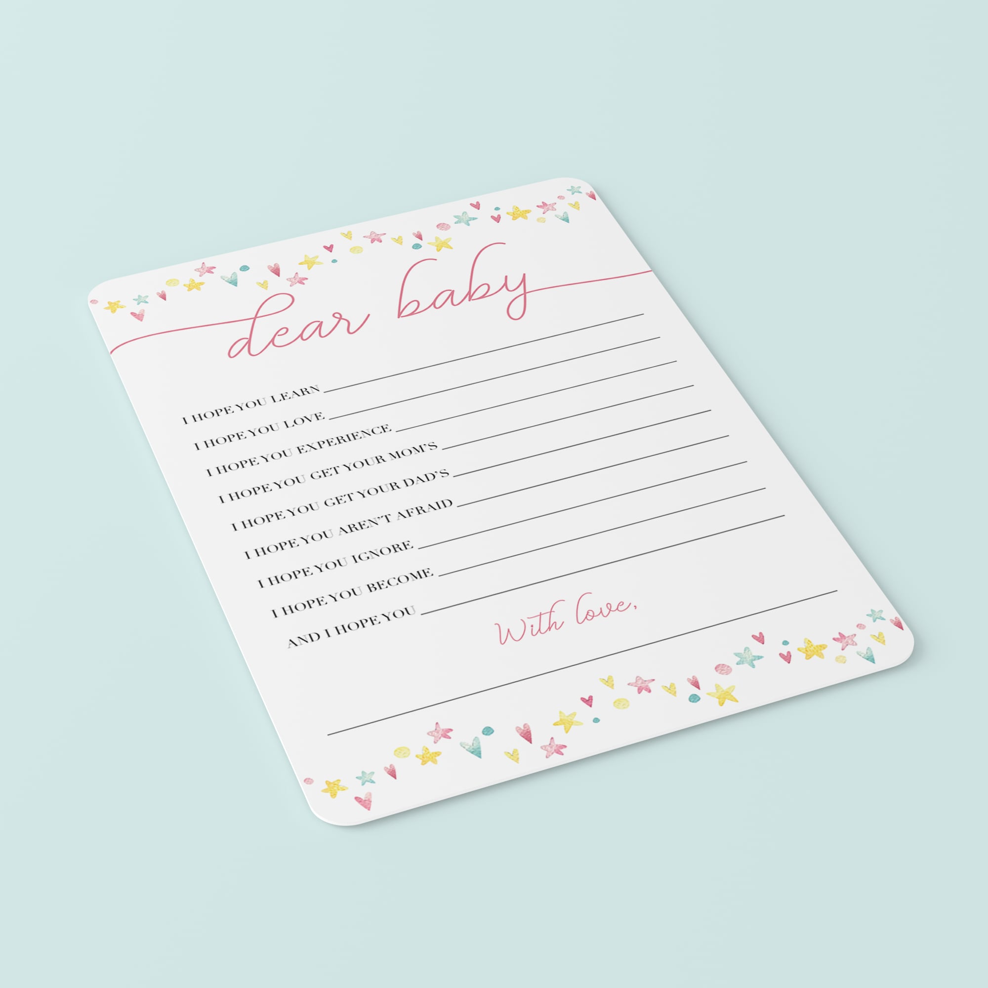Create a magnificent keepsake for the new mom with this sweet shower Wishes for Baby printable with hearts and stars. Let every baby shower guest write down their wishes for the baby and collect the cards for the lucky mom-to-be. This baby shower card is perfect to celebrate the arrival of a little girl.