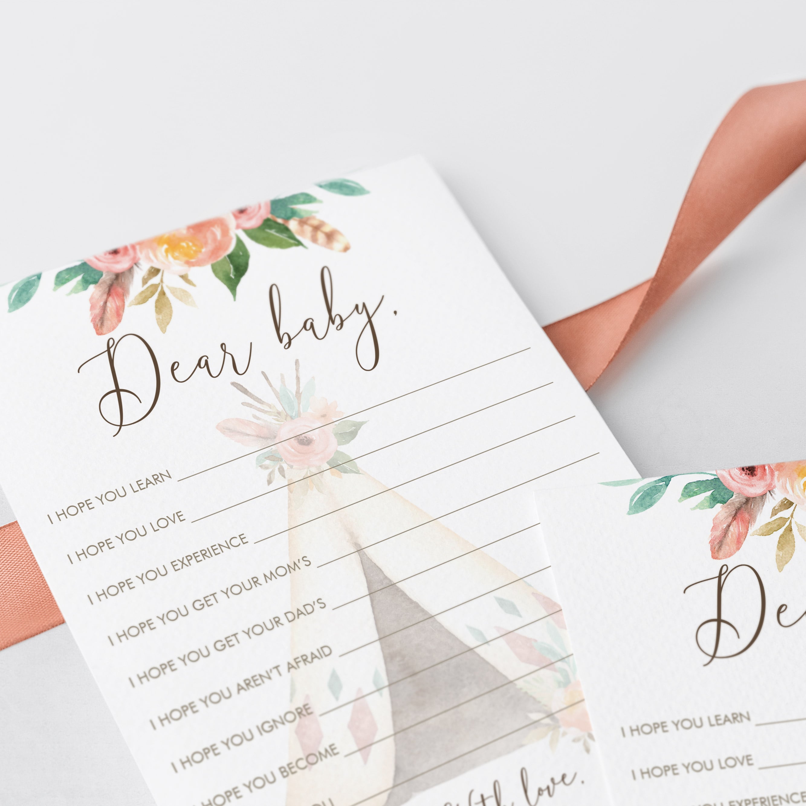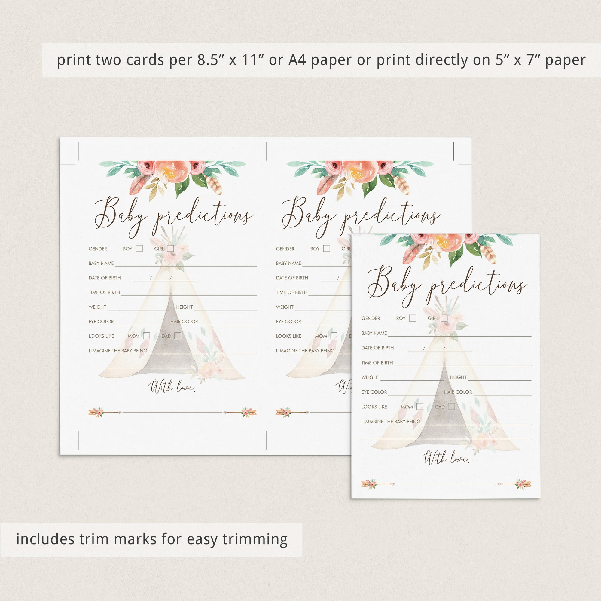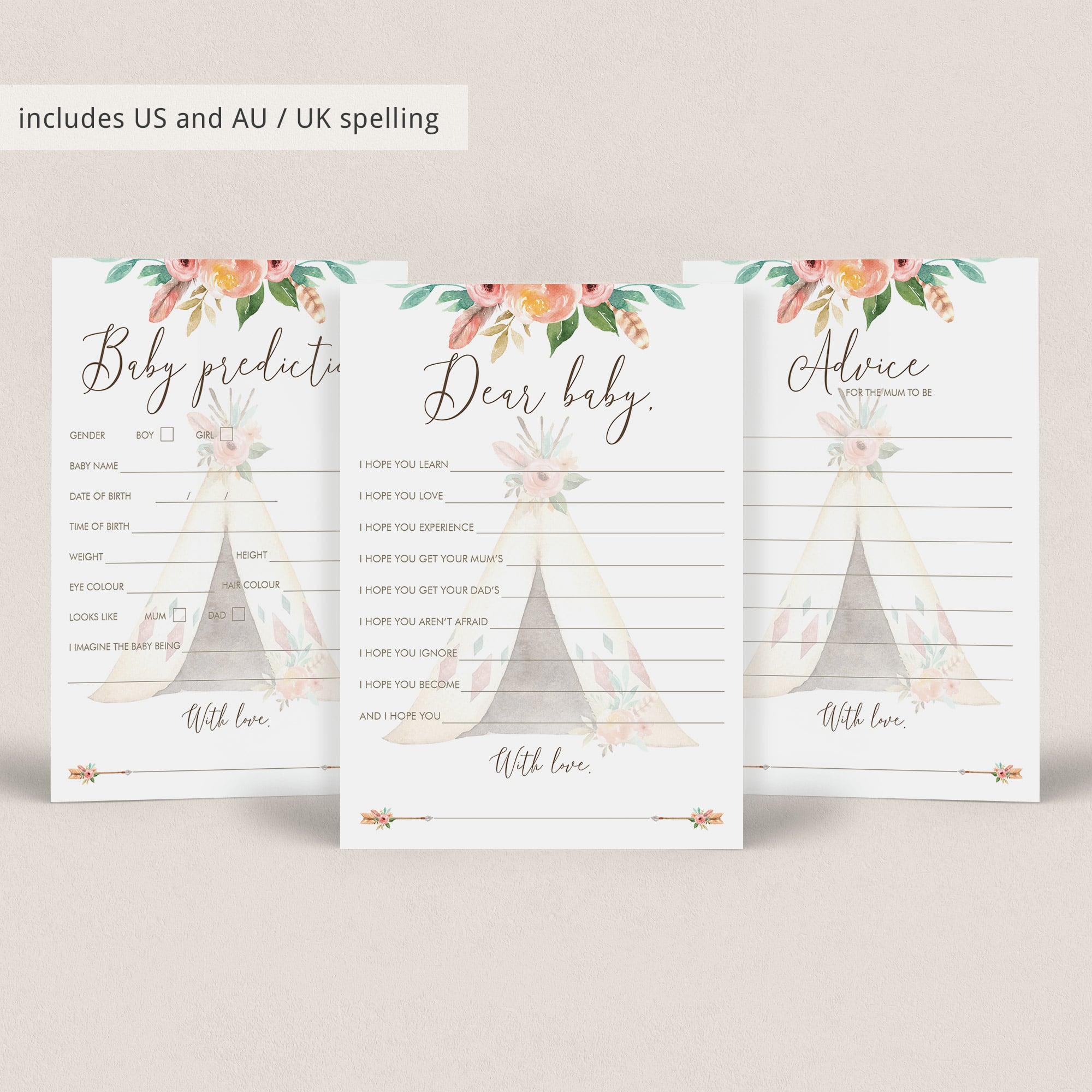 Create meaningful keepsakes with this gorgeous bundle of tribal baby shower games with watercolor flowers and teepee. The set includes everything you need to engage your baby shower guests during the celebration and it makes a beautiful keepsake for the mom-to-be afterwards.