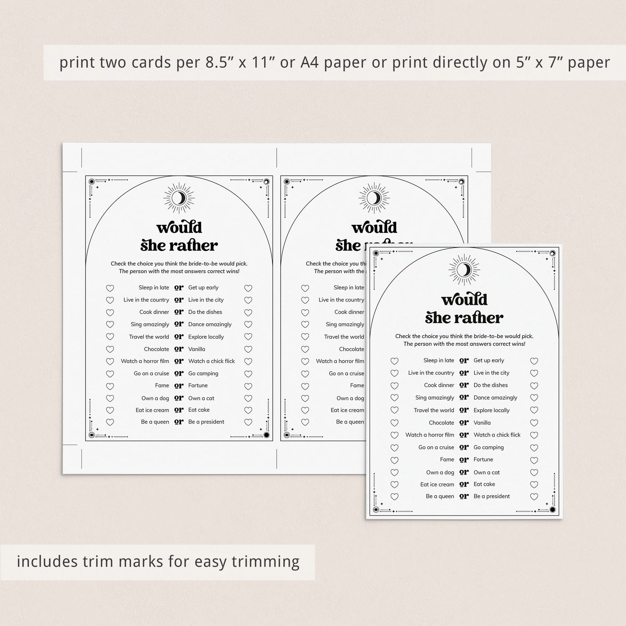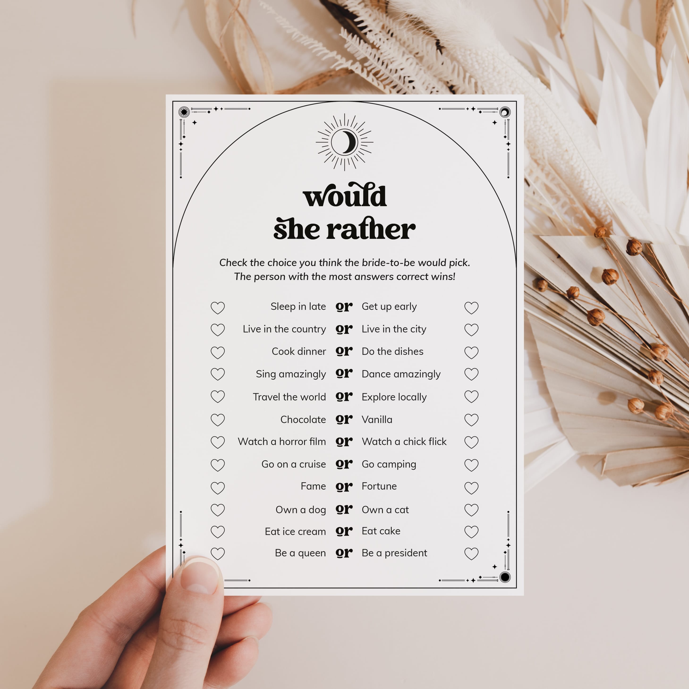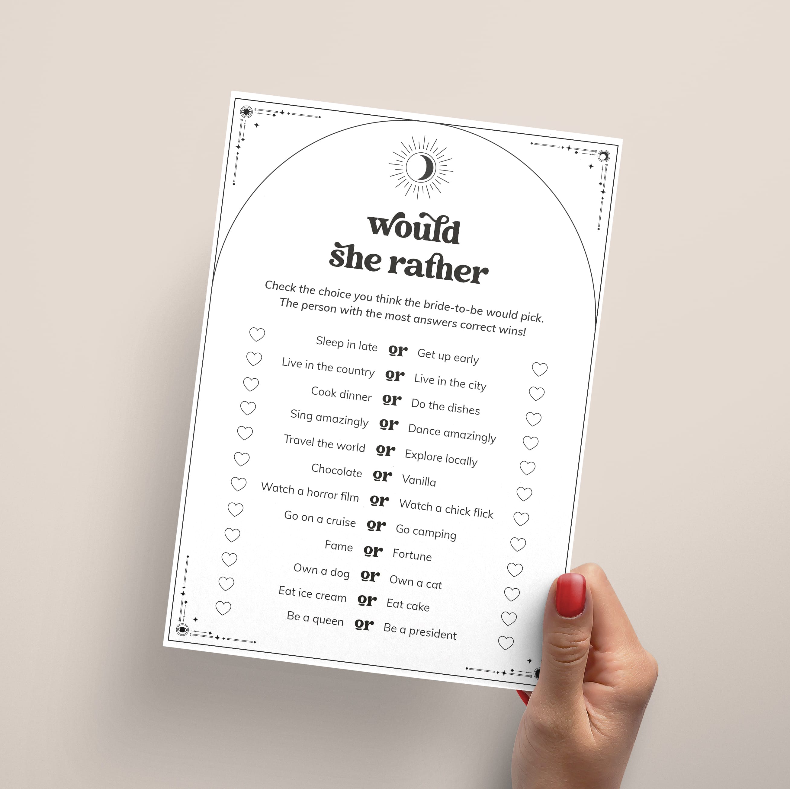 Who knows the bride-to-be best? Figure it out with these The Coven Theme bridal shower "Would She Rather" game cards. These game cards would be perfect for a celestial bridal shower.