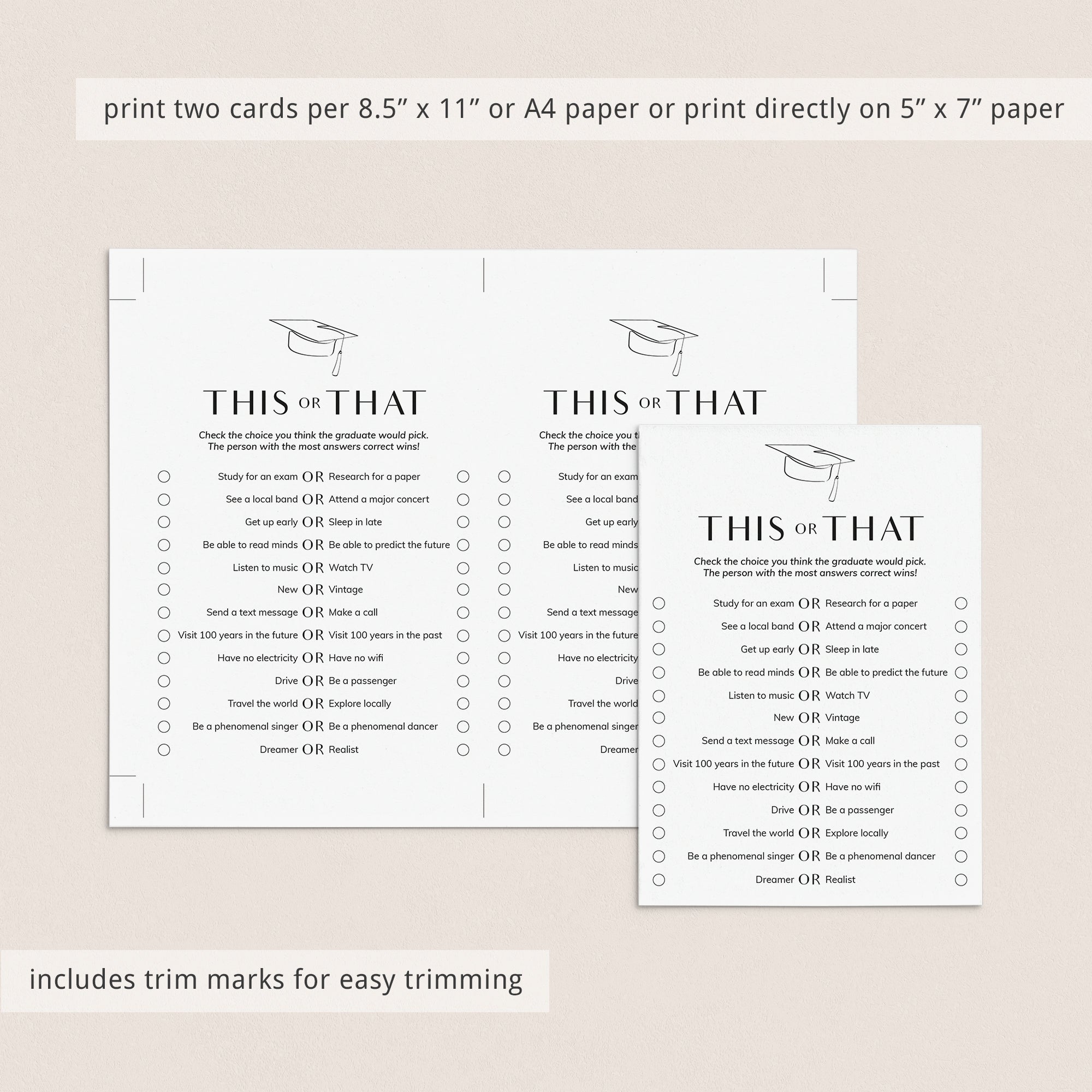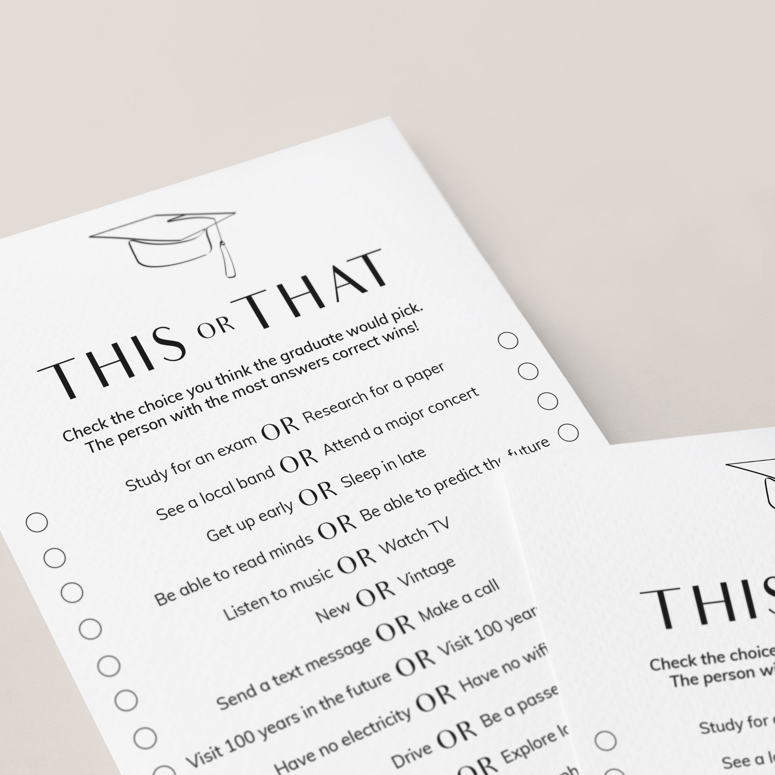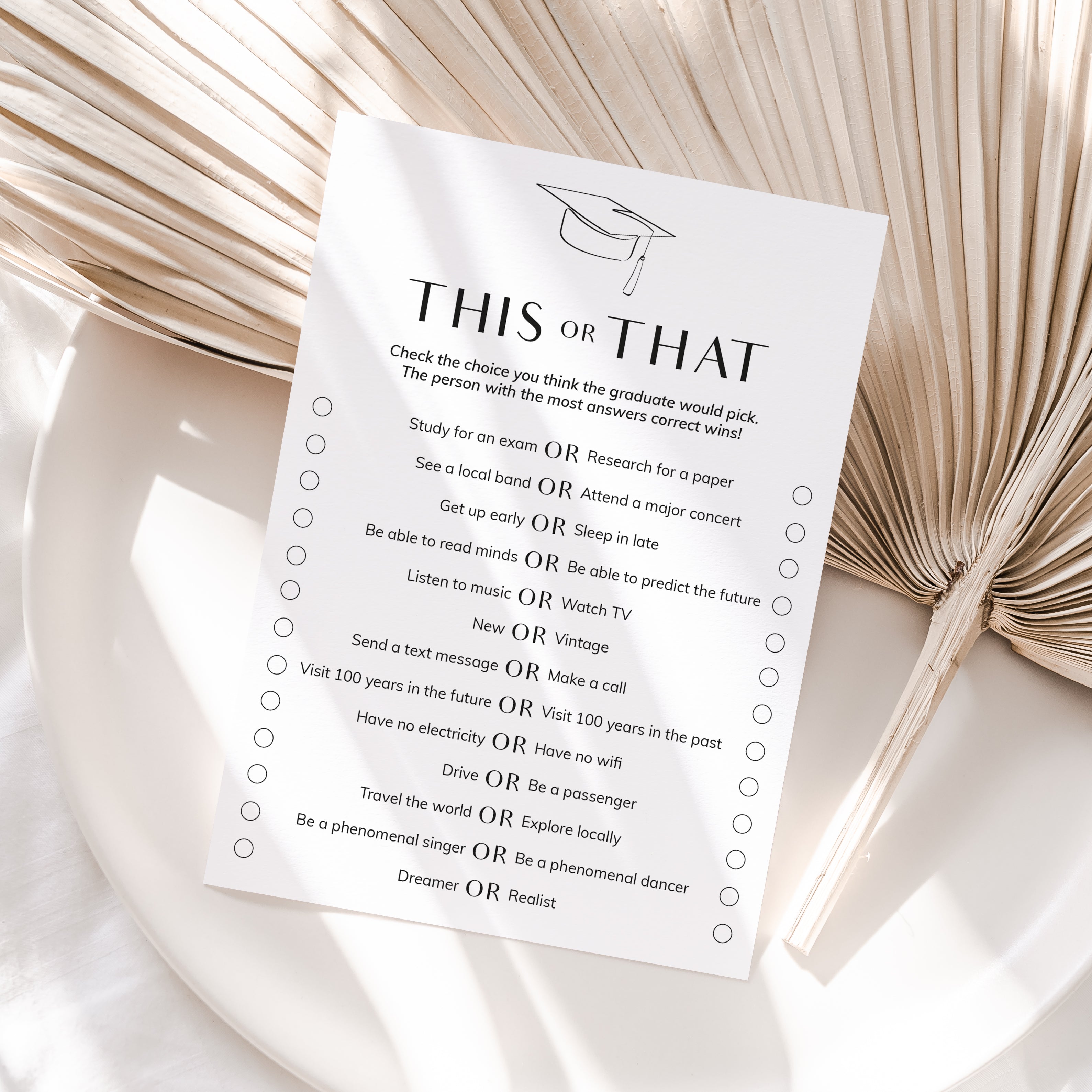 Are you looking for the perfect icebreaker to get people talking and in the party mood for your grad party? Play This or That! After all, your guests have one thing in common: you know the graduate. This modern minimalist This or That graduation game is the perfect addition to your grad party.
