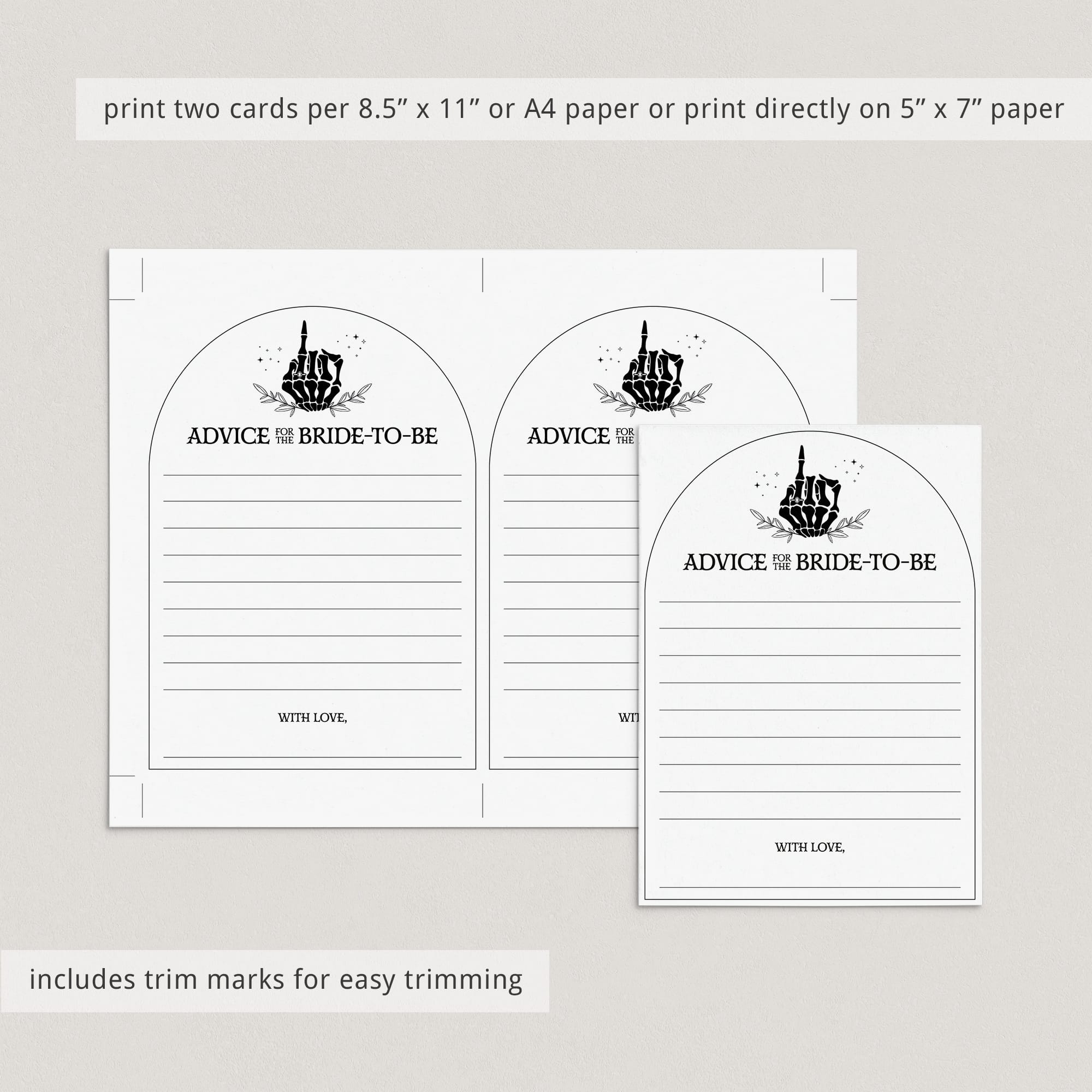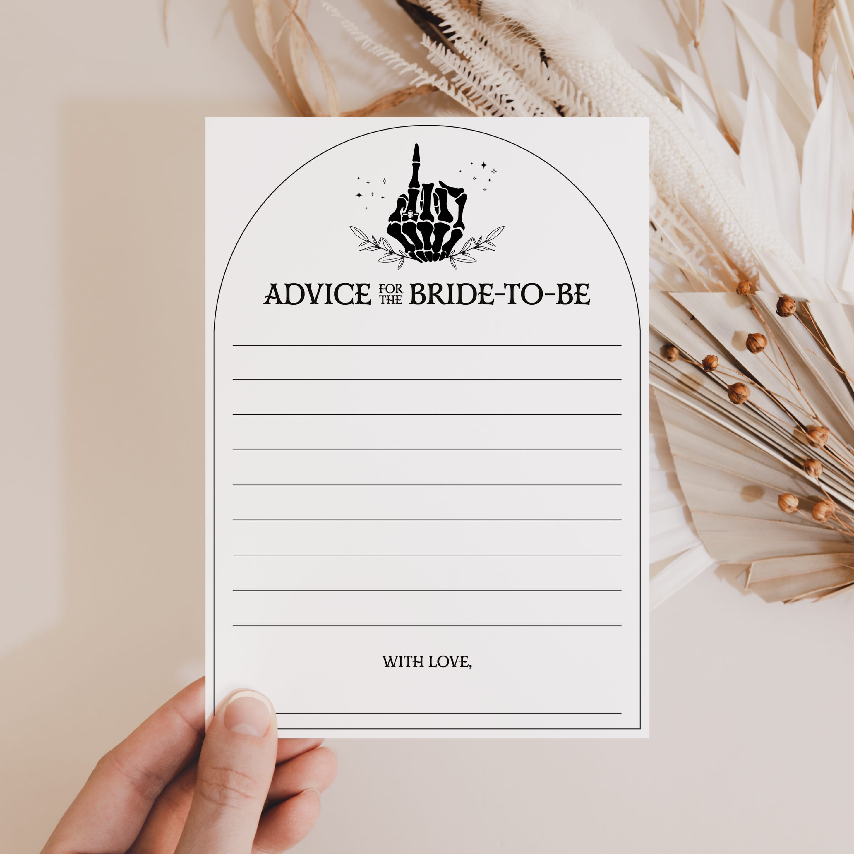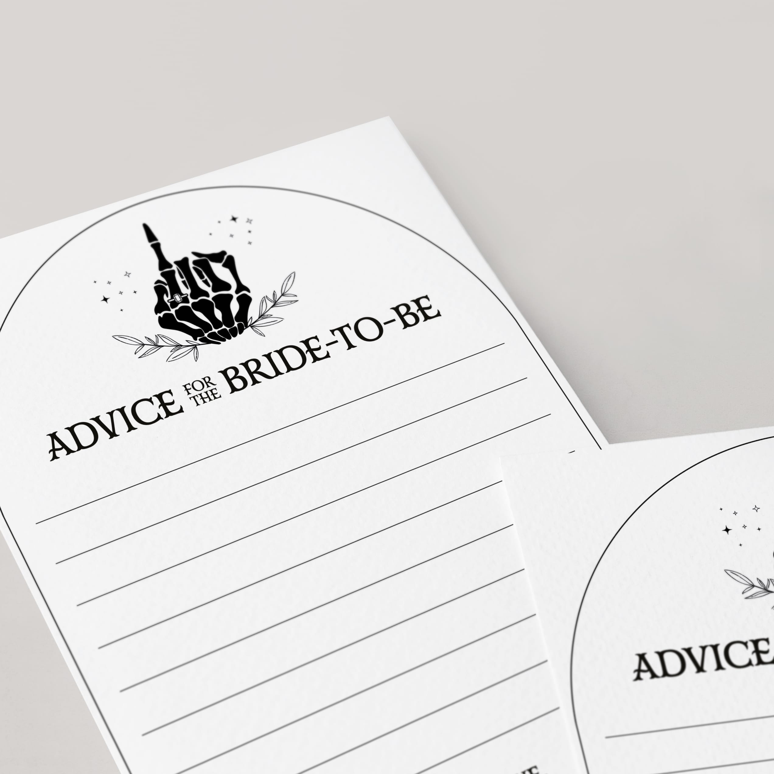 Create a meaningful keepsake for the bride to be with these Till Death Do Us Party theme advice for the bride-to-be cards. The Bride or Die advice card is the perfect addition to any gothic bridal shower or Halloween wedding. Let every guest write down their advice for the new bride and collect the cards for the lucky soon-to-be-Mrs.