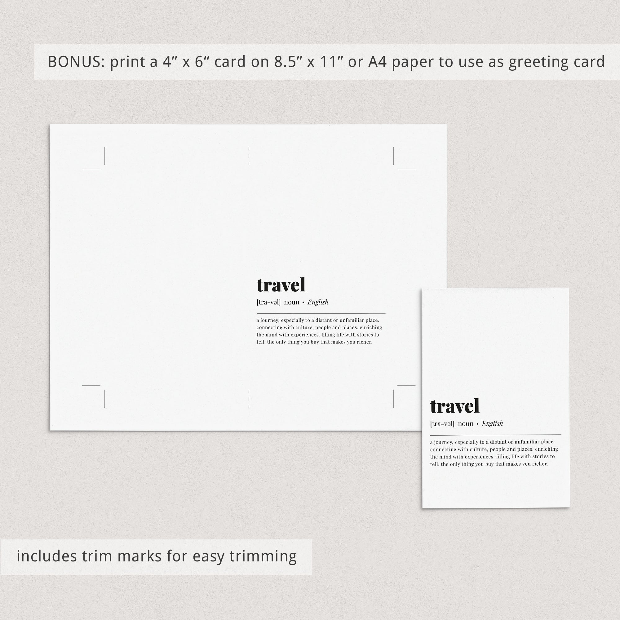 BONUS: an 8.5" x 11" sized JPG-file with trim marks for a folded 4" x 6" greeting card is included as well. Simply print on card stock, trim and fold in half.