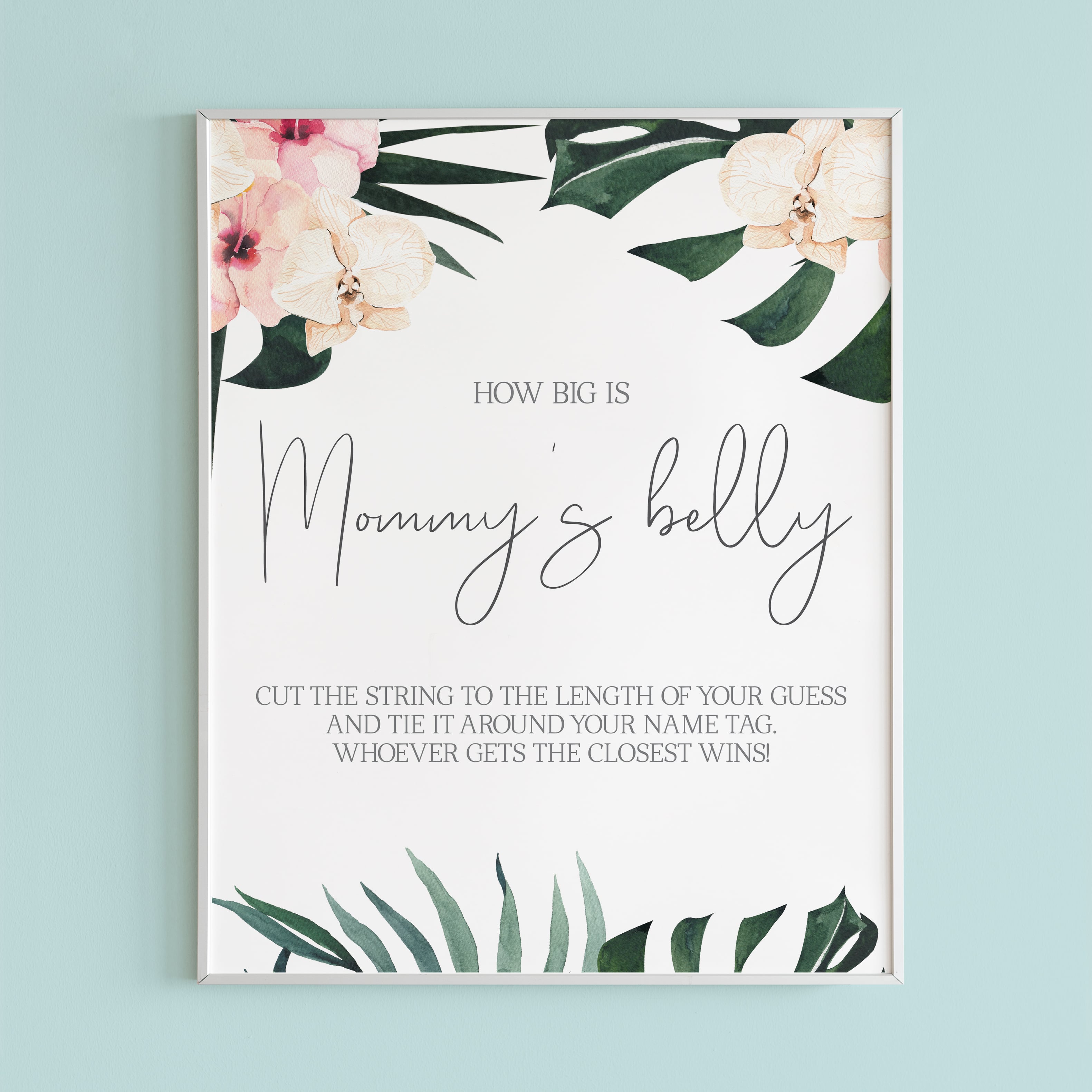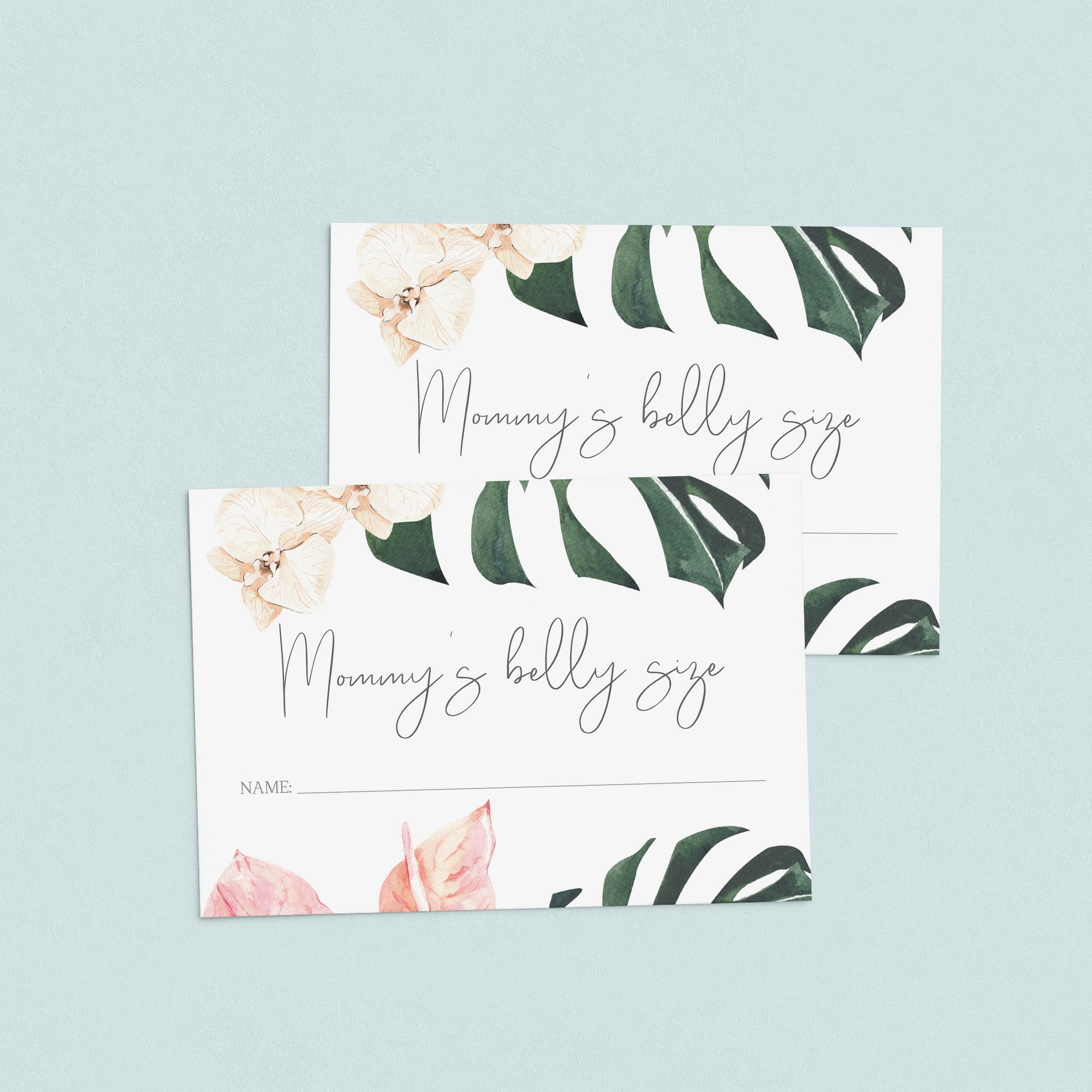 Kick off the fun at your tropical theme baby shower with this easy to set up activity: Guess The Bump Size. All you need is this How Big Is Mommy's Belly game sign with botanical leaves, the matching bump size cards, string or yarn and scissors.