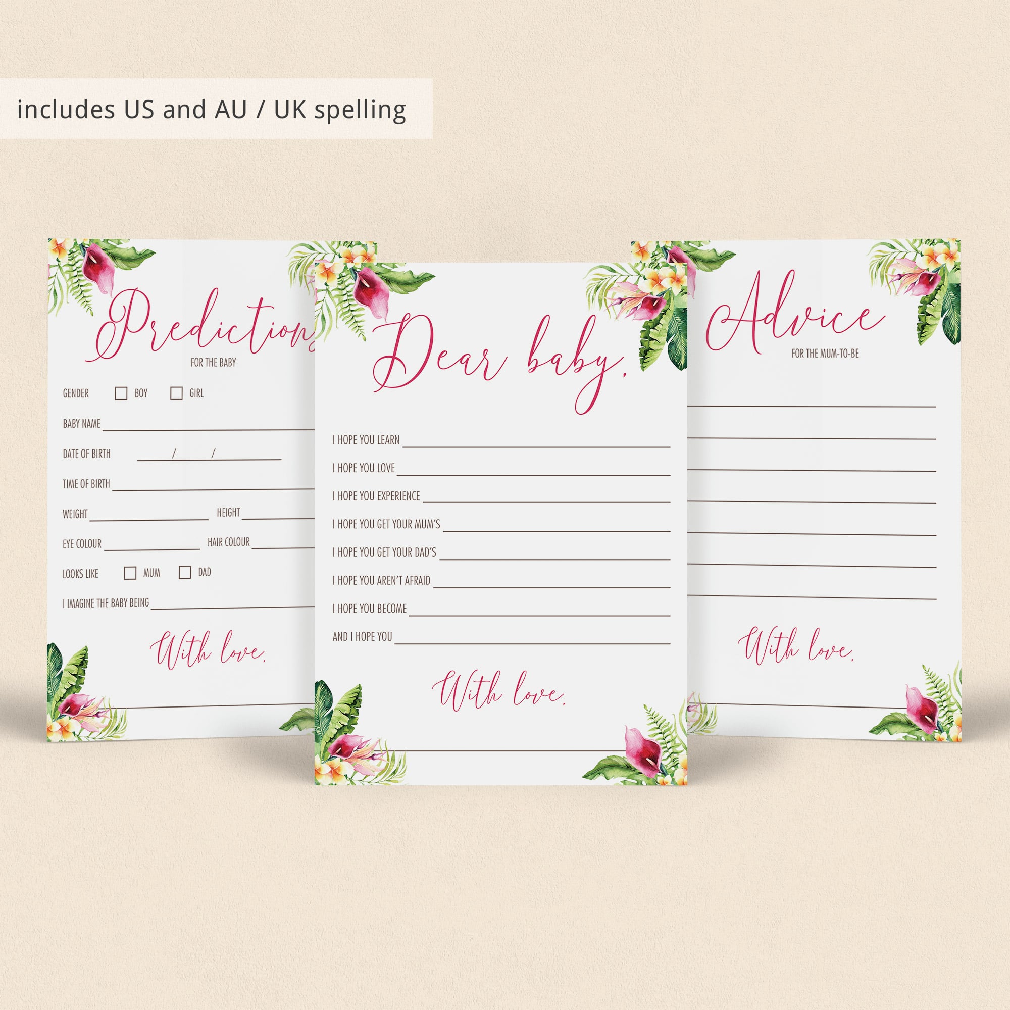 This tropical flora baby shower games pack includes the following popular baby shower keepsakes: