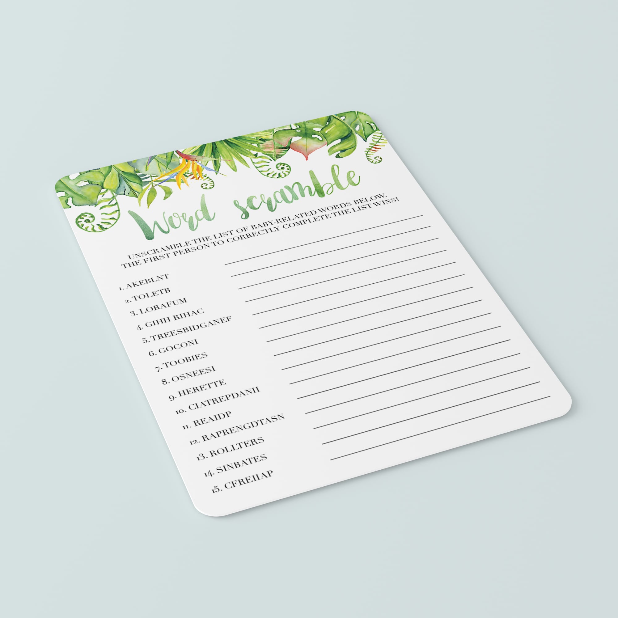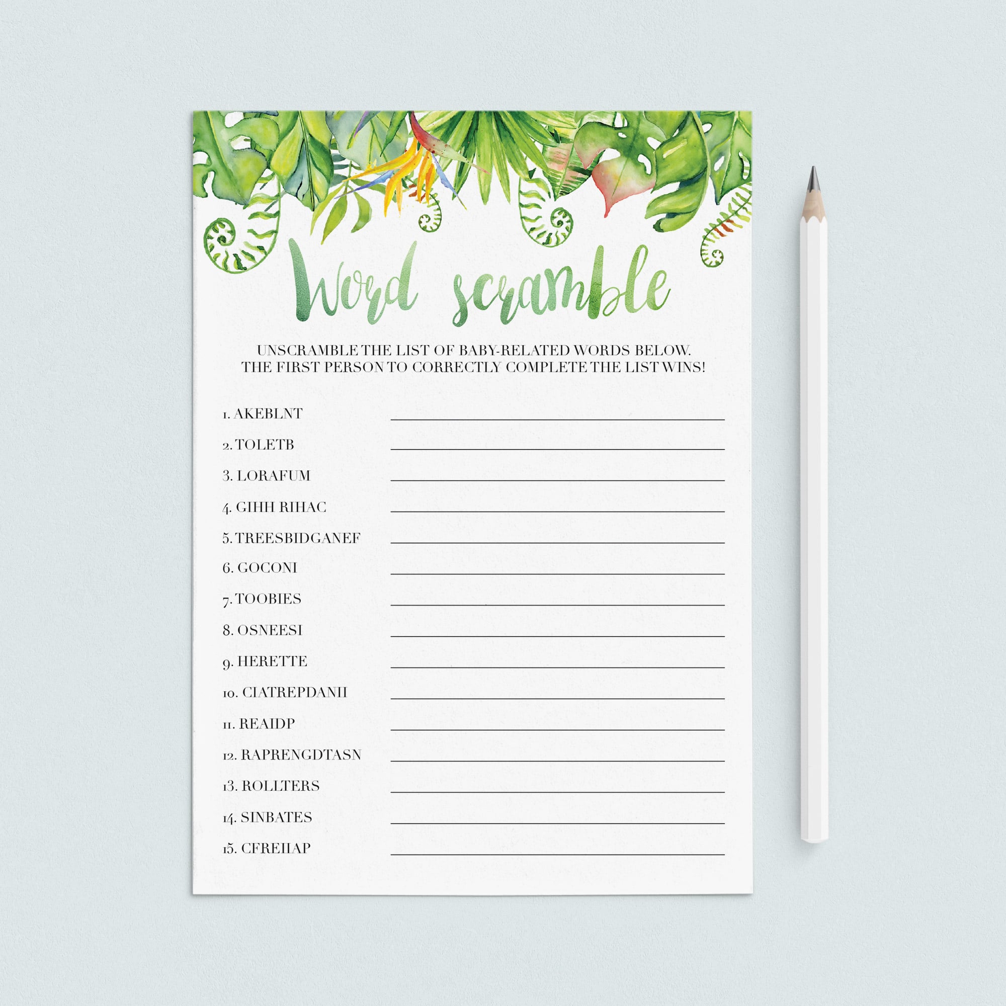 Play Word Scramble at your tropical themed baby shower with these tropical flora Baby Word Scramble game cards. The gender neutral cards would be perfect for a summer baby shower and will create a fun and enjoyable moment for all of your guests.