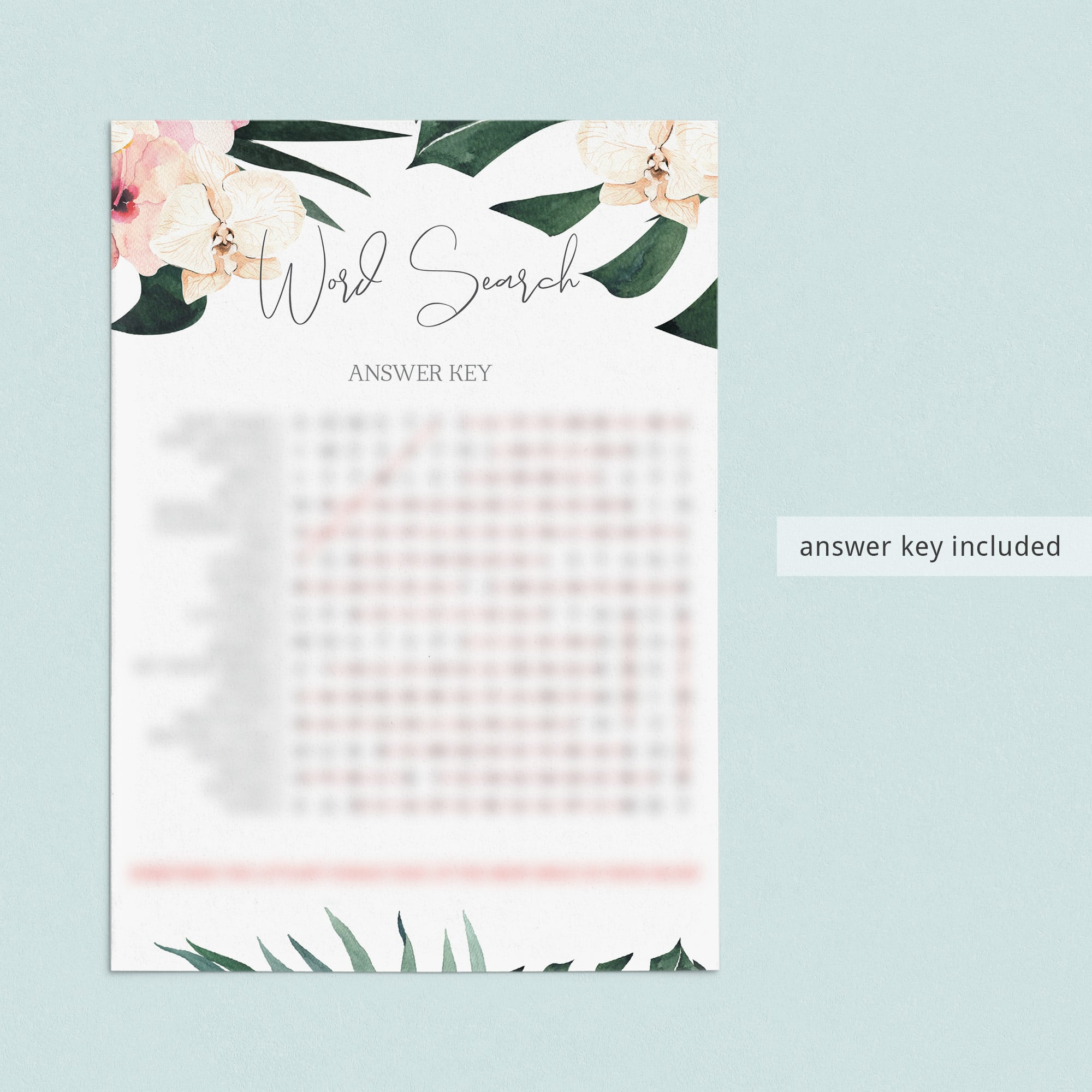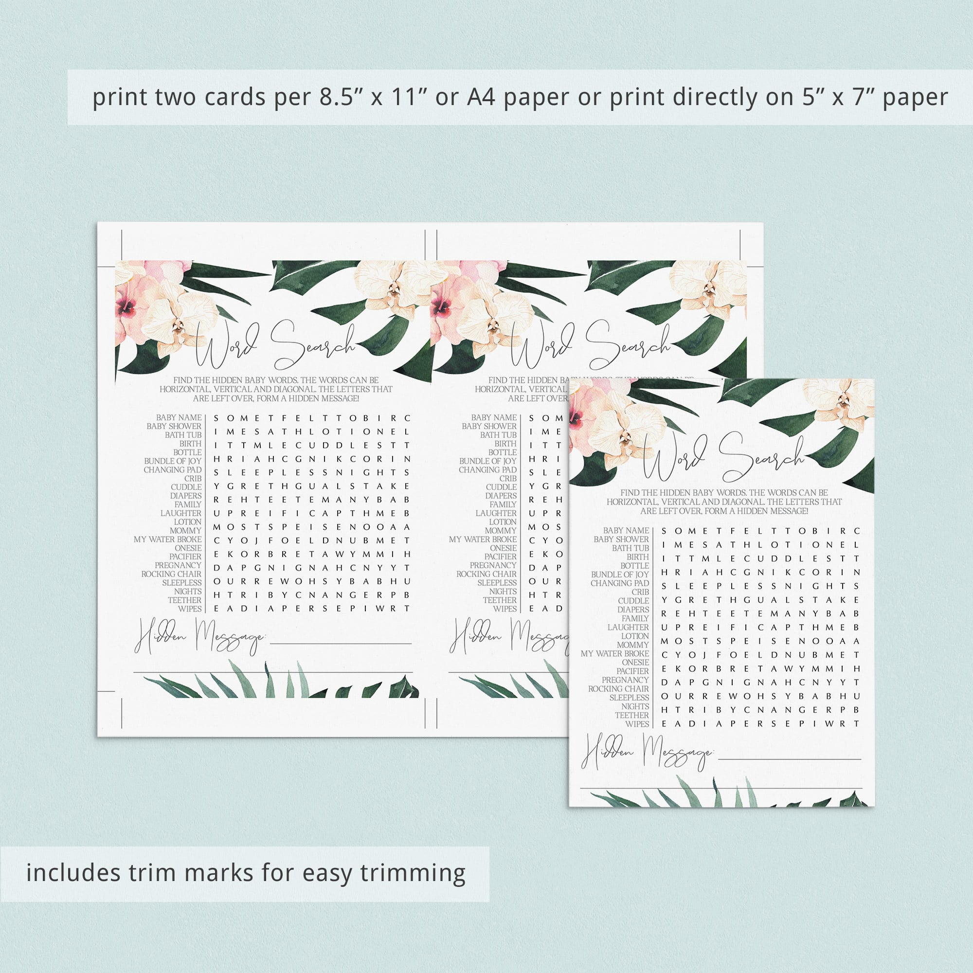 Are you looking for a fun and easy game to play at your tropical theme baby shower? Play Word Search with this gorgeous game card with watercolor flowers and tropical leaves. Let your guests search for all baby related words that are listed on the game cards. The words can be found horizontally, vertically and diagonally.