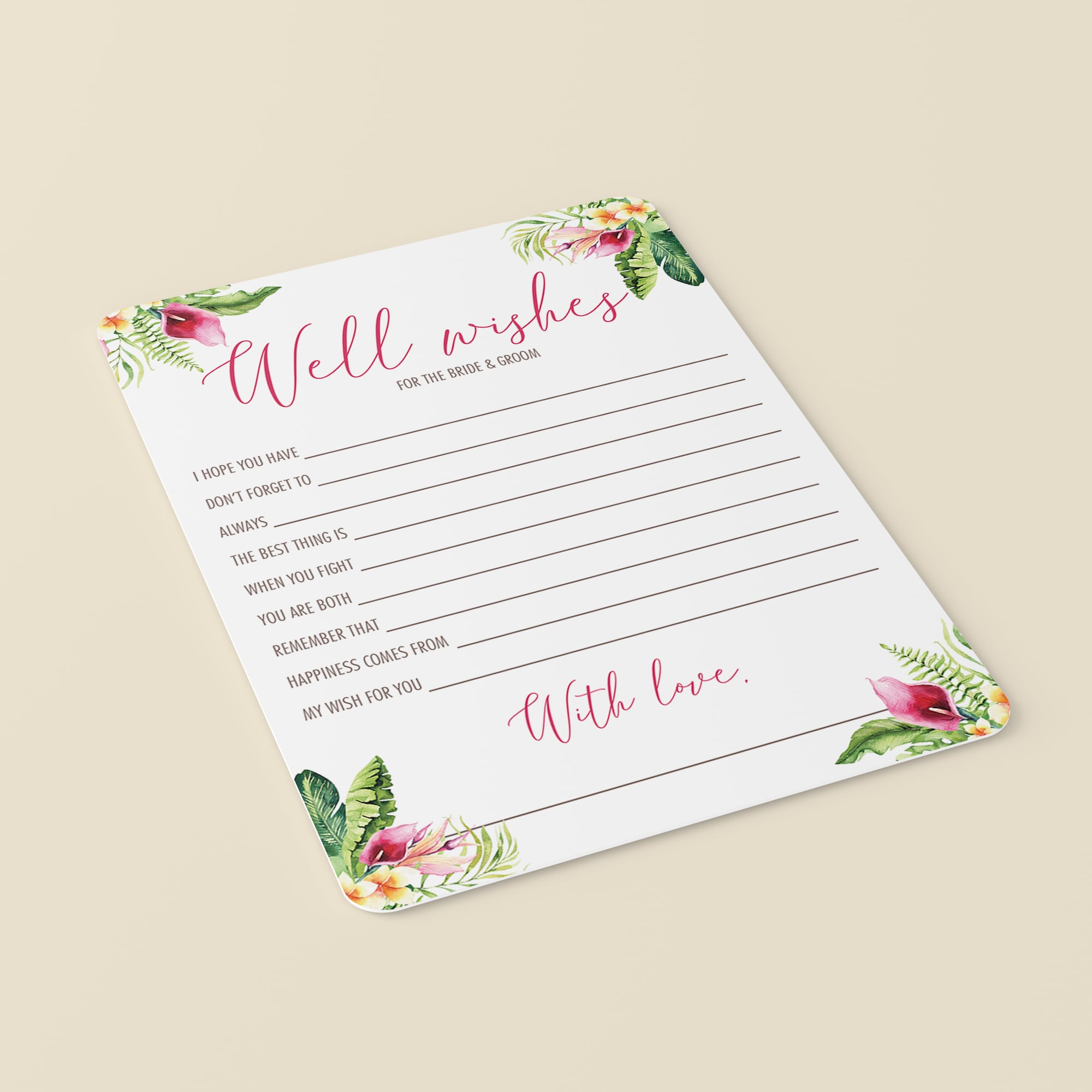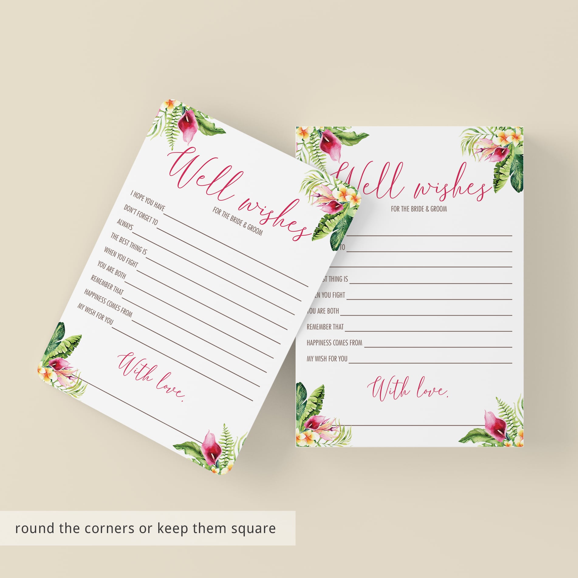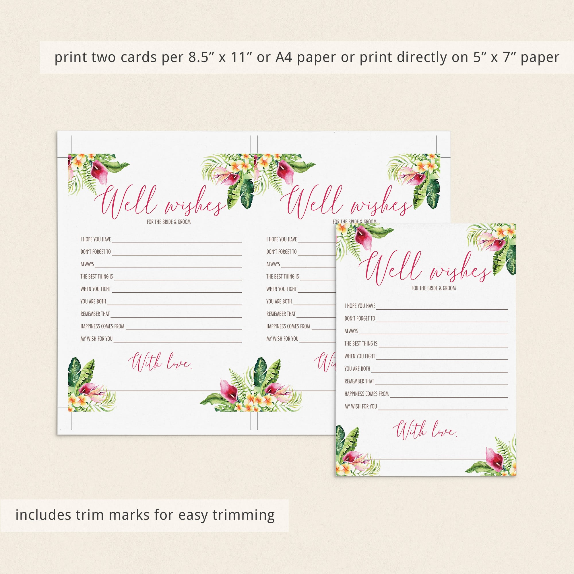 Create a gorgeous keepsake with this tropical themed well wishes for the bride and groom cards with banana leaves and watercolor flowers. It's the perfect addition to any tropical bridal shower or summer wedding. Let every guest write down their advice and wishes for the soon-to-be-weds and collect the cards for the happy couple.