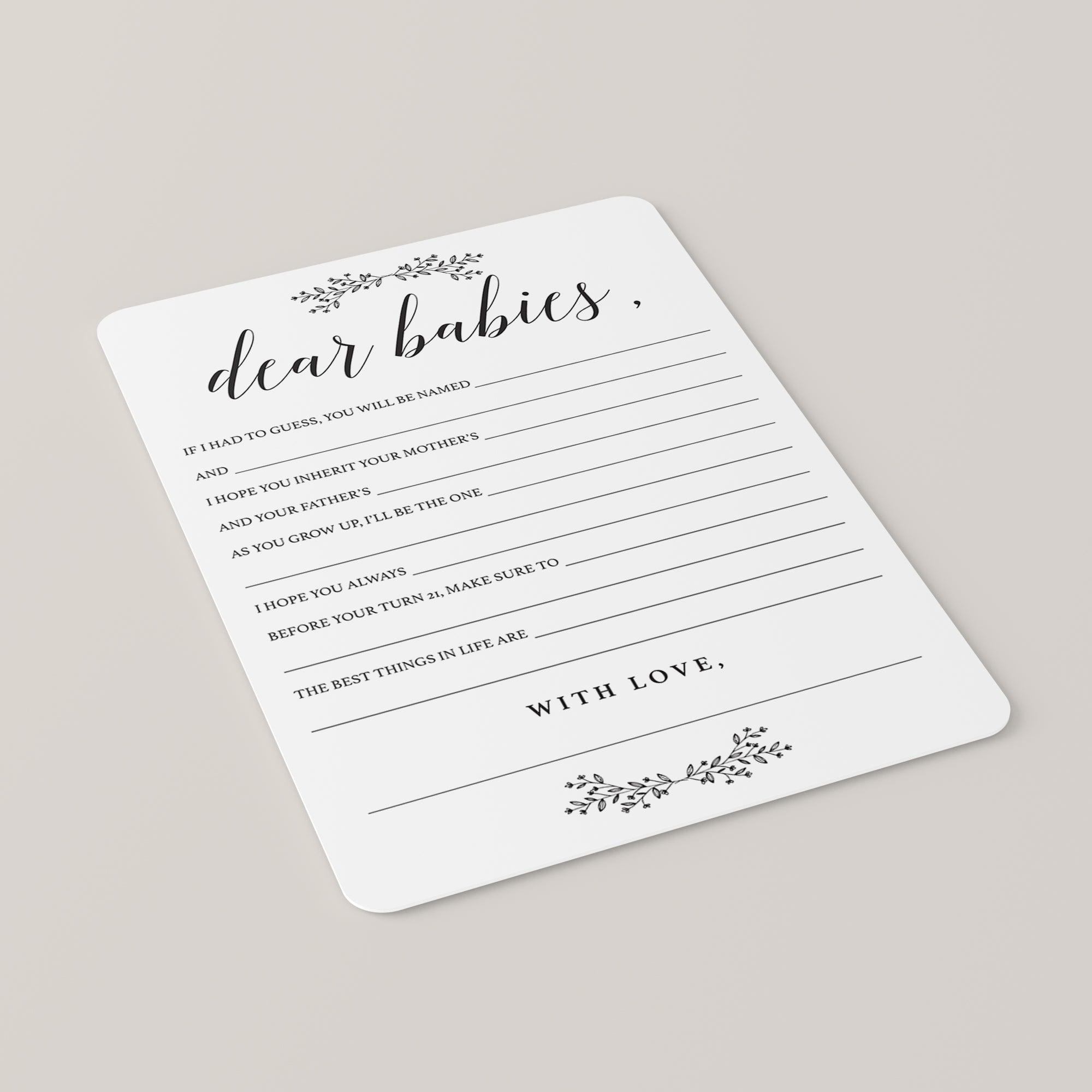 This minimal twin baby shower wish card with calligraphy script and black and white leaves is an instant download. After purchase you will receive a download link immediately on screen. Also within minutes of your order and payment, an e-mail will be sent to you with a link for your download.