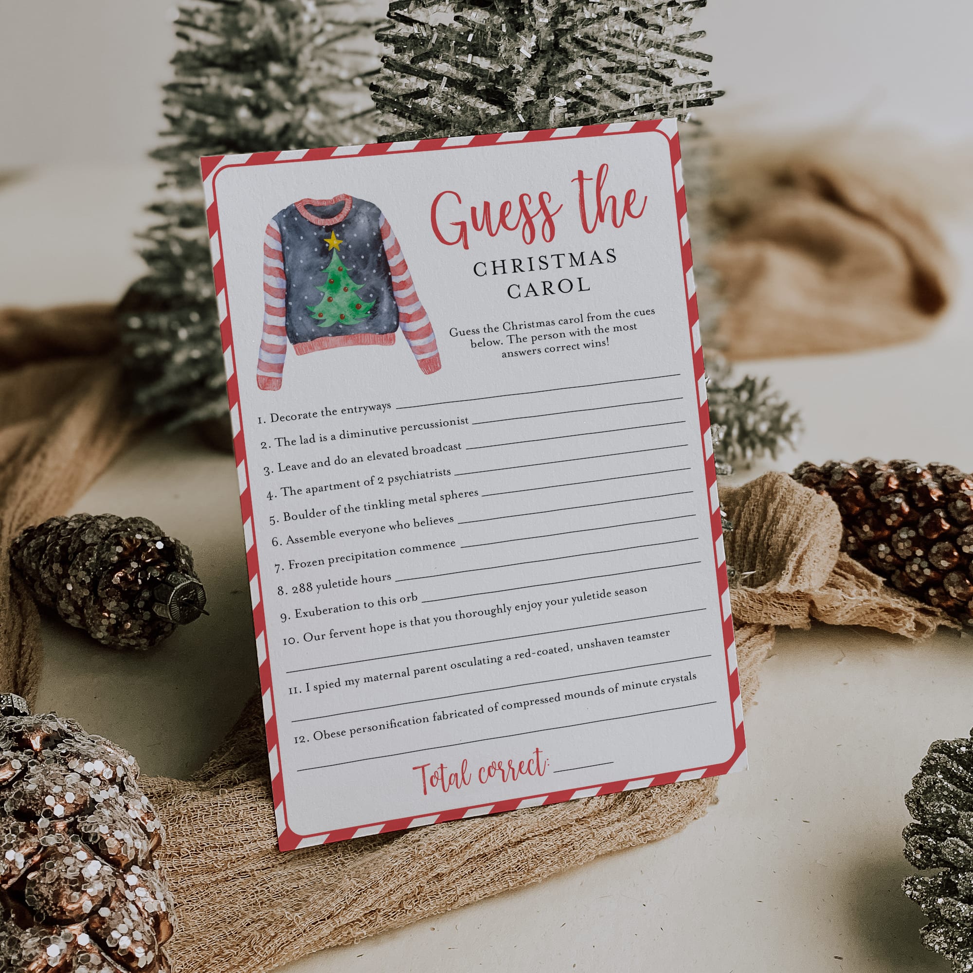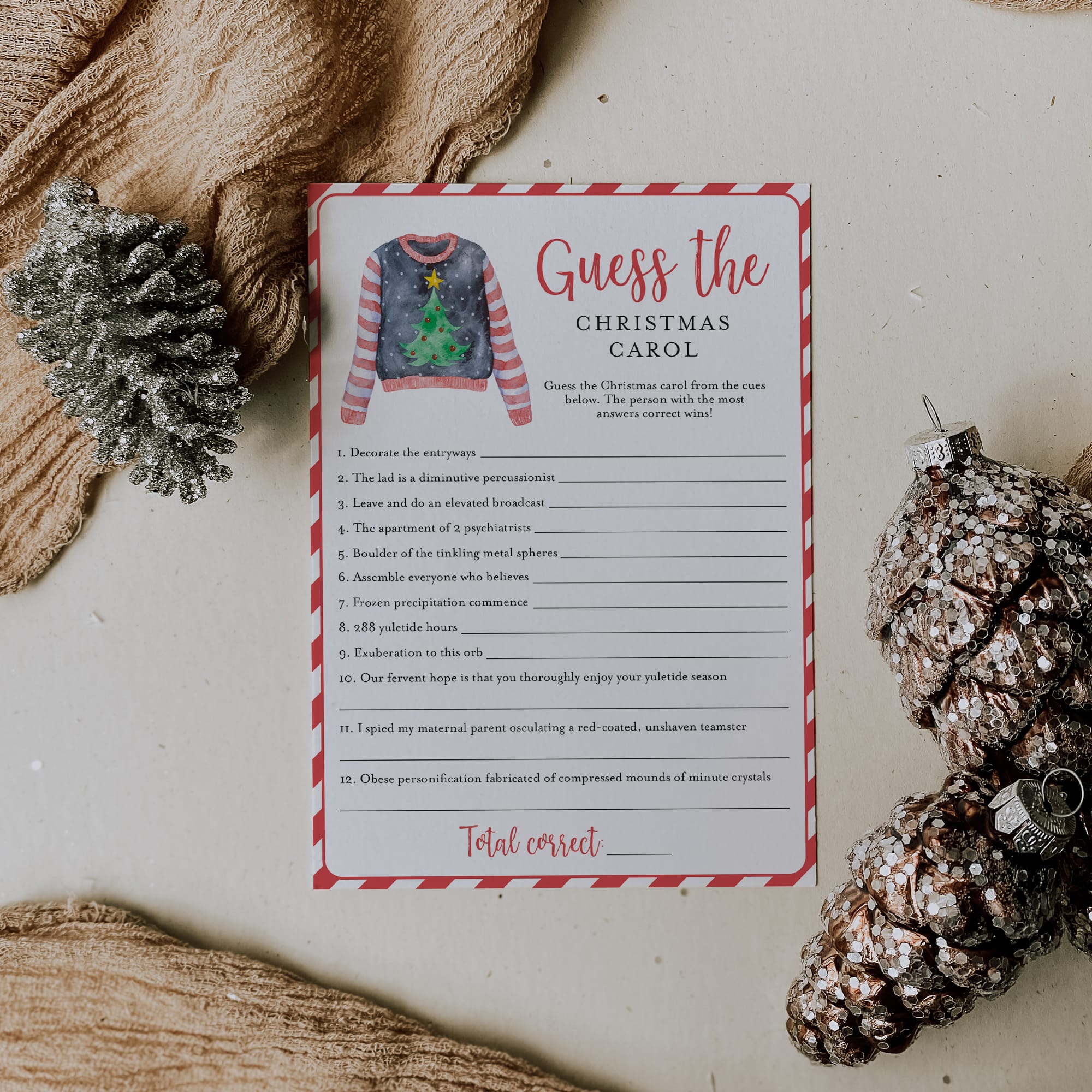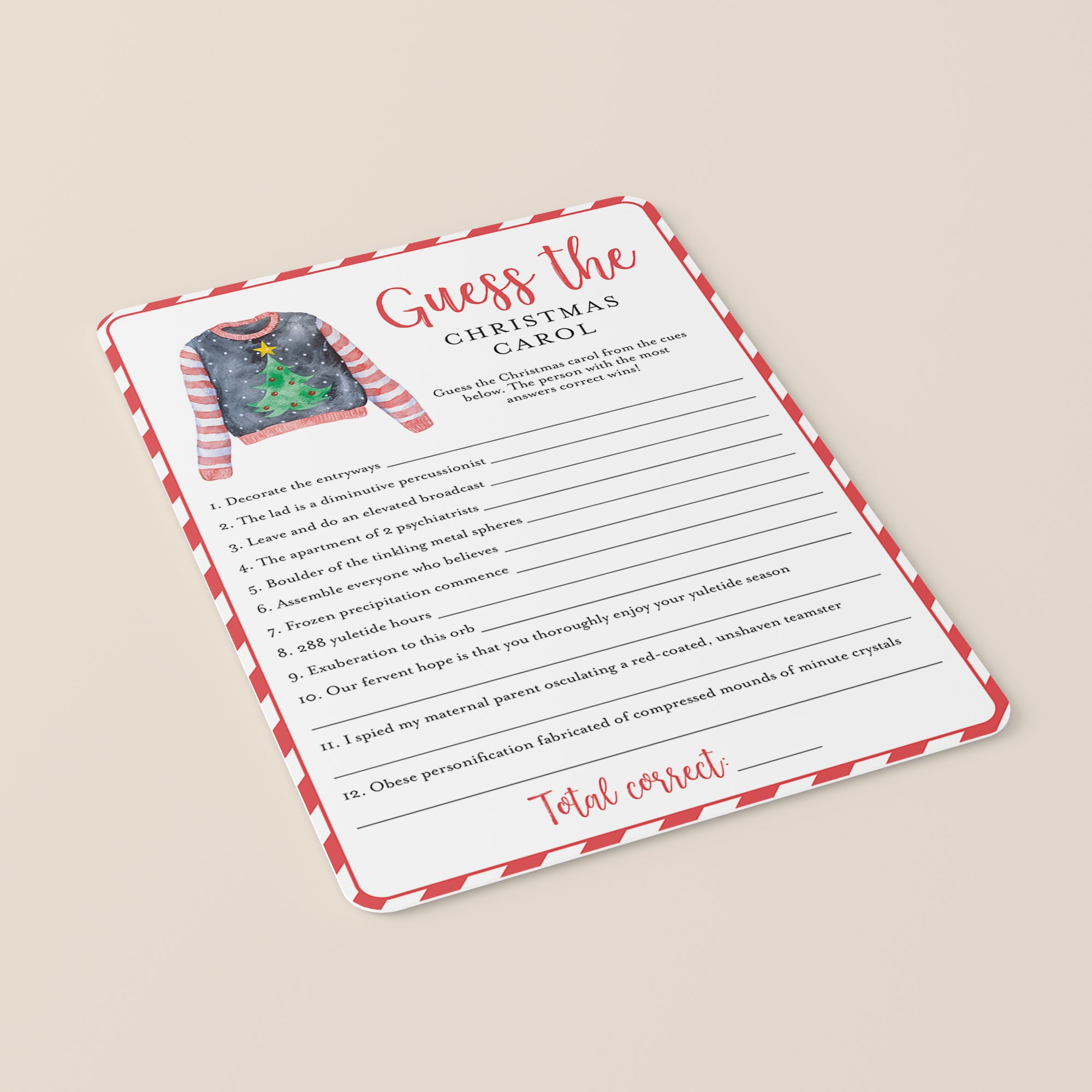 This Ugly Sweater Christmas Trivia game is a fun holiday party game that involves guessing a popular Christmas carol by clue titles synonymous with the original titles. Some clues are easier than others, but it’s a fun game to start your party off with. For example “Decorate the entryways” is the Christmas song “Deck the halls”.