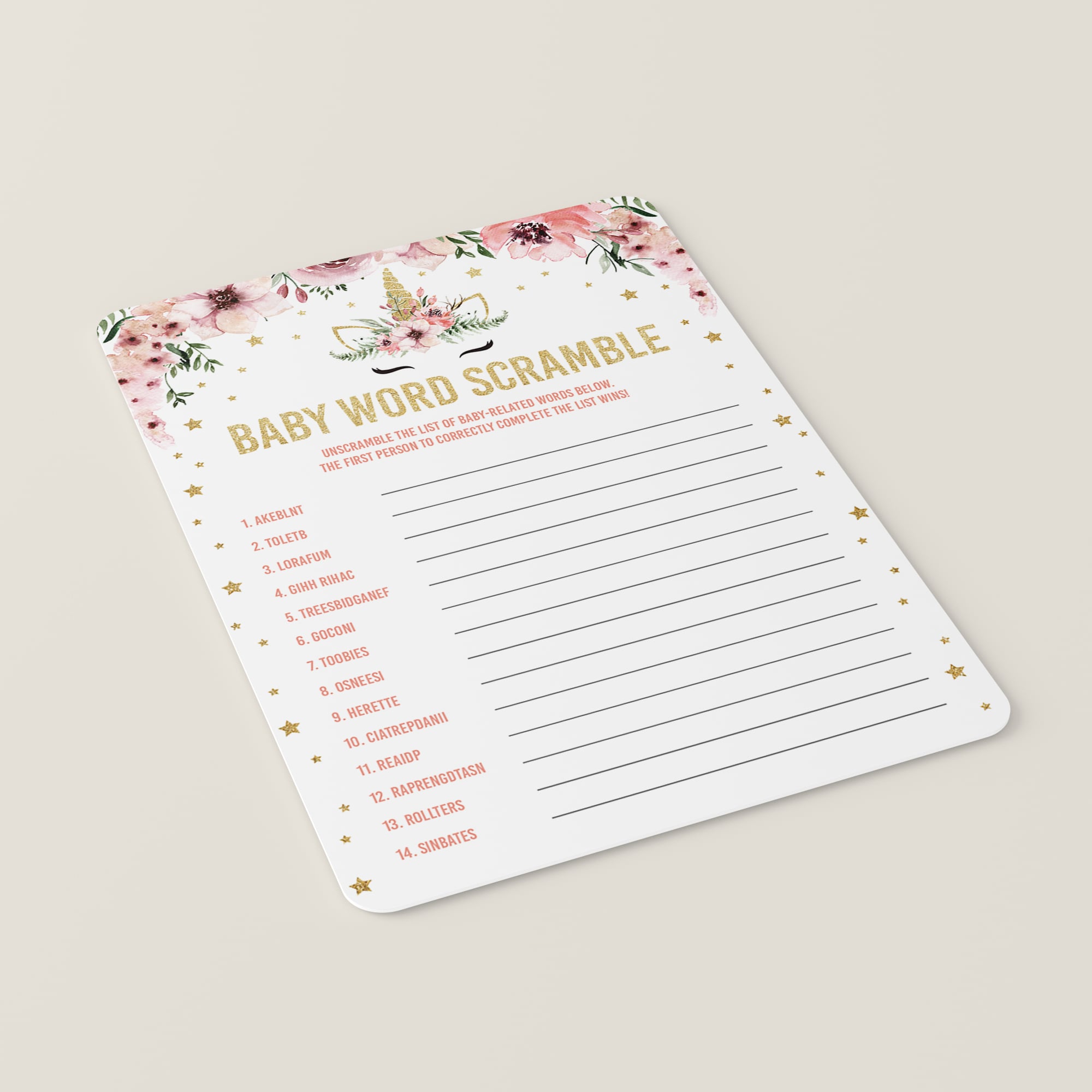 Play "Baby Word Scramble" at your unicorn themed baby shower with this pink and gold game card with gorgeous watercolor flowers. The unicorn game cards would be perfect for a girl baby party and will create a fun and enjoyable moment for all of your guests.