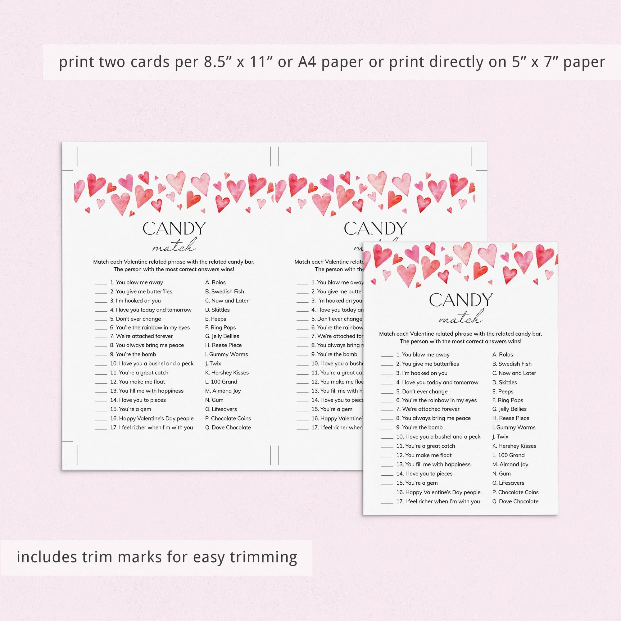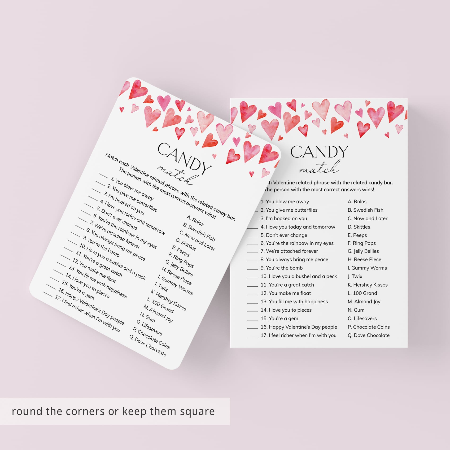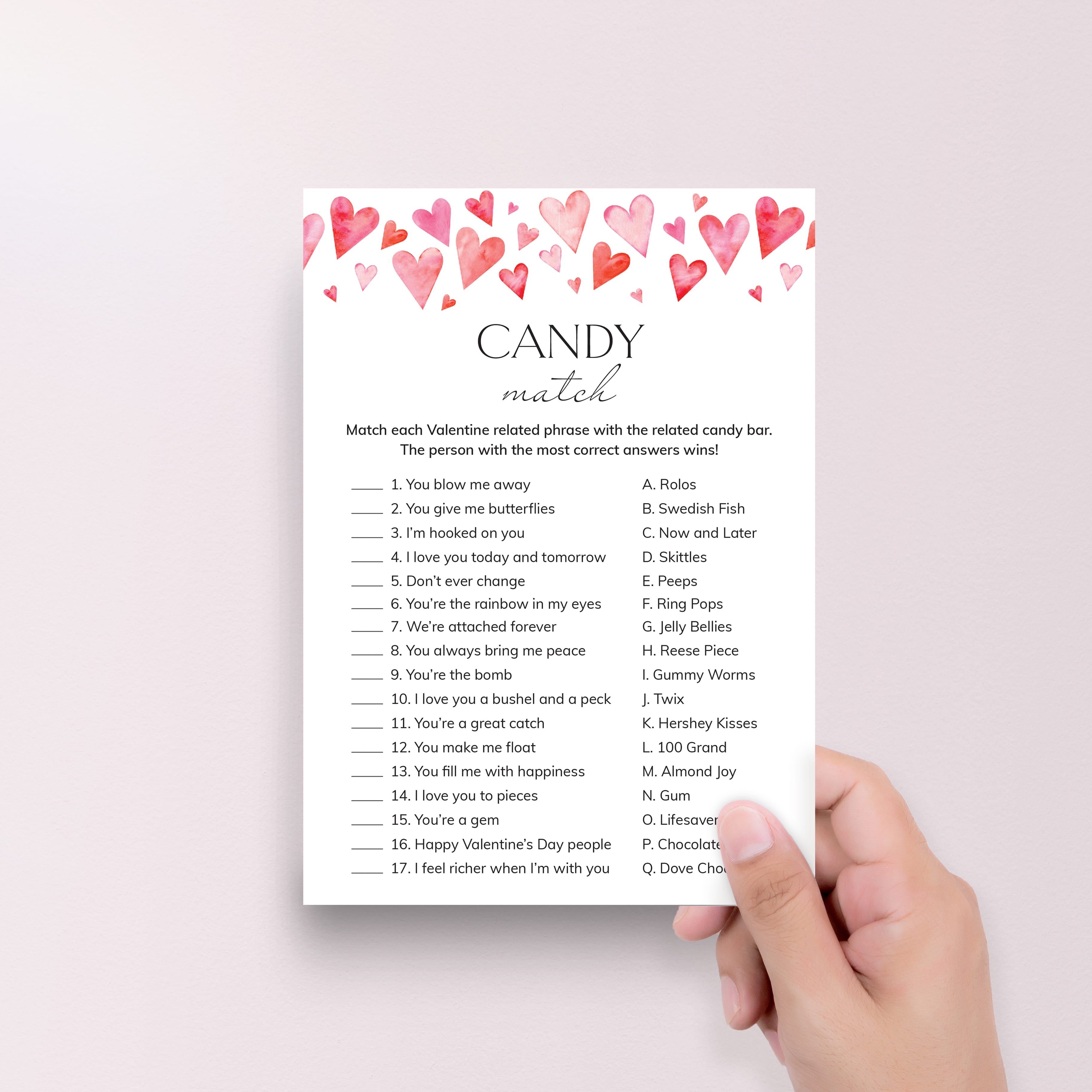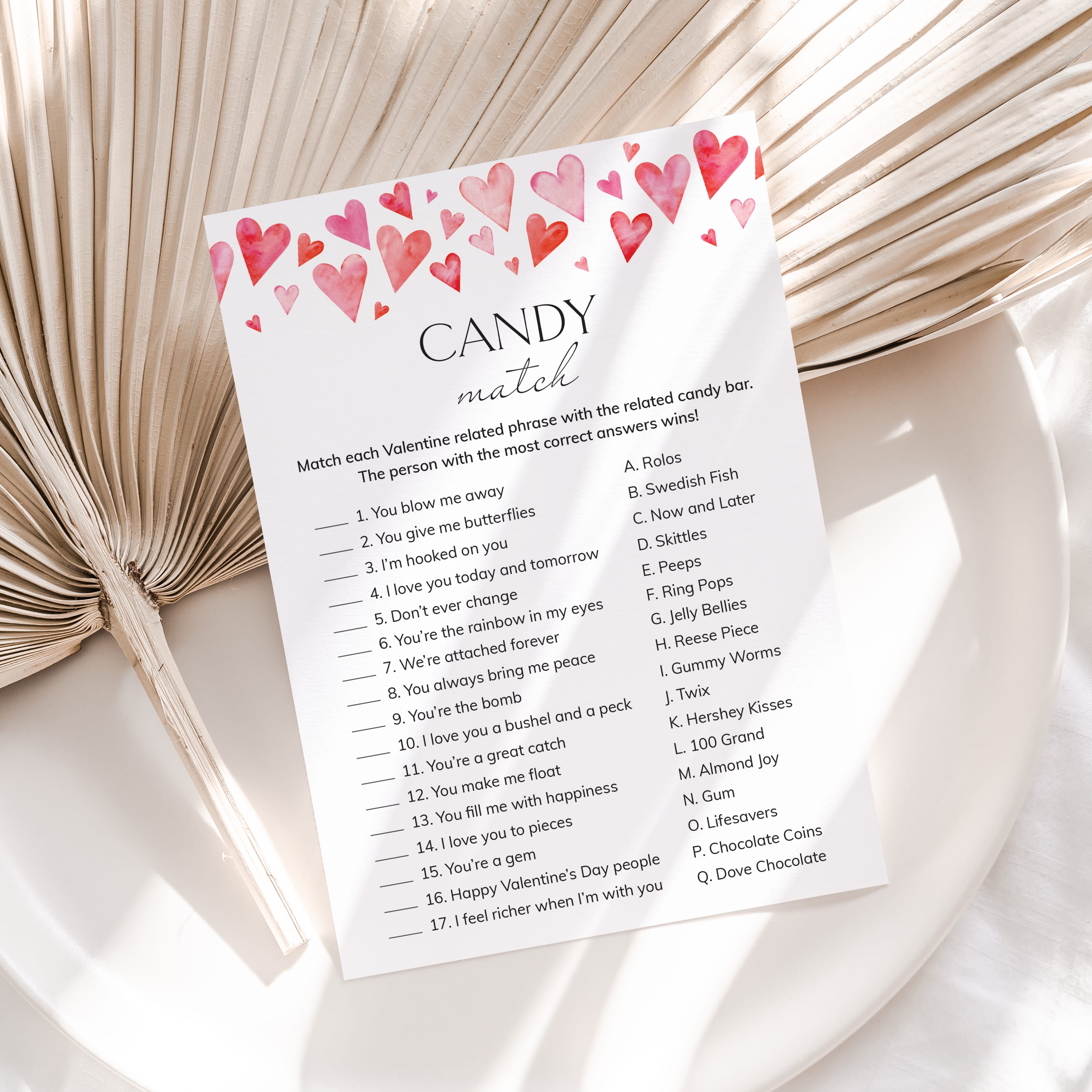 Are you hosting a Valentine's Day party? Encourage talking and laughter with this fun Candy Match game, featuring cute watercolor pink hearts. It's is a great way to entertain your guests and get everyone involved. Guests will have to match popular candy bar names with Valentine's-related things.