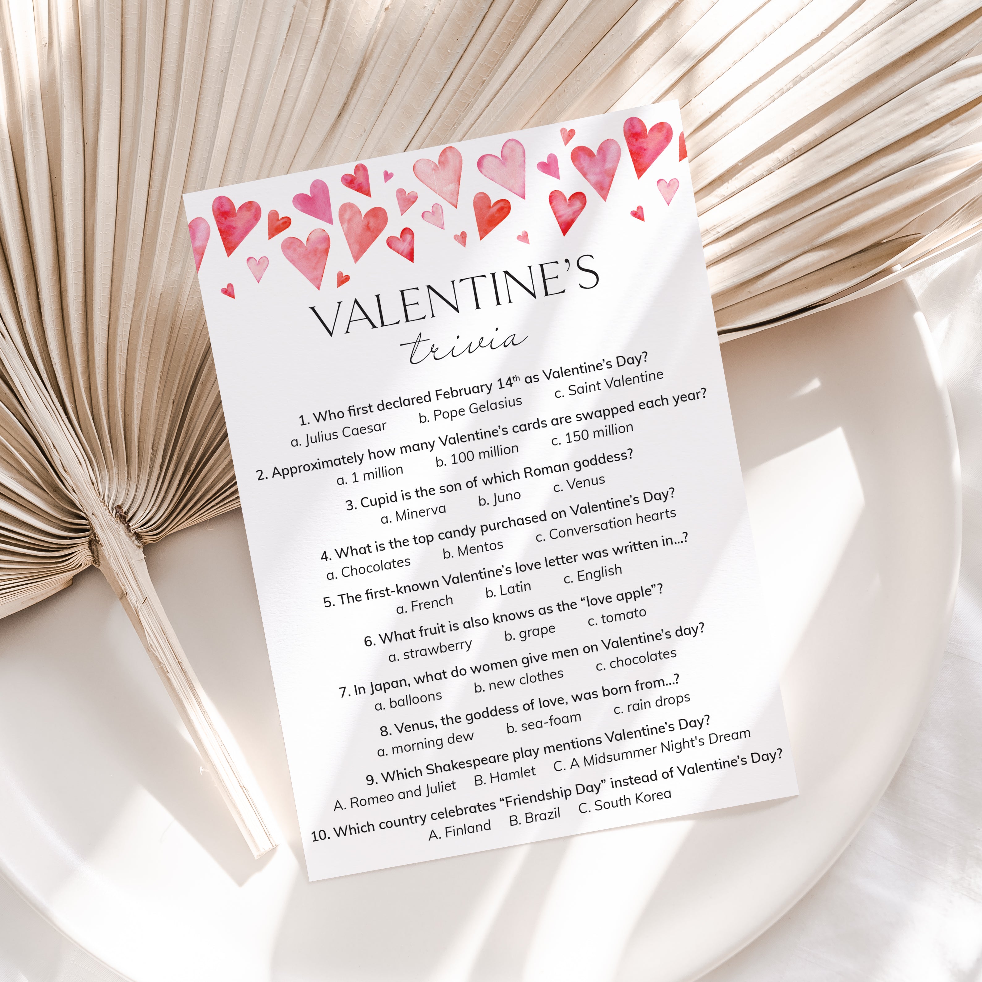Are you hosting a Valentine's Day party? Test your guests knowledge of this romantic holiday with this Valentine Trivia game with 10 multiple choice questions. The quiz is a great addition to a Valentine's Day party with couples or Galentine's Day Party with just your BFF's and you will learn some fun Valentine's Day facts. Just in case you are having trouble figuring out the answers, an answer key is included.