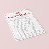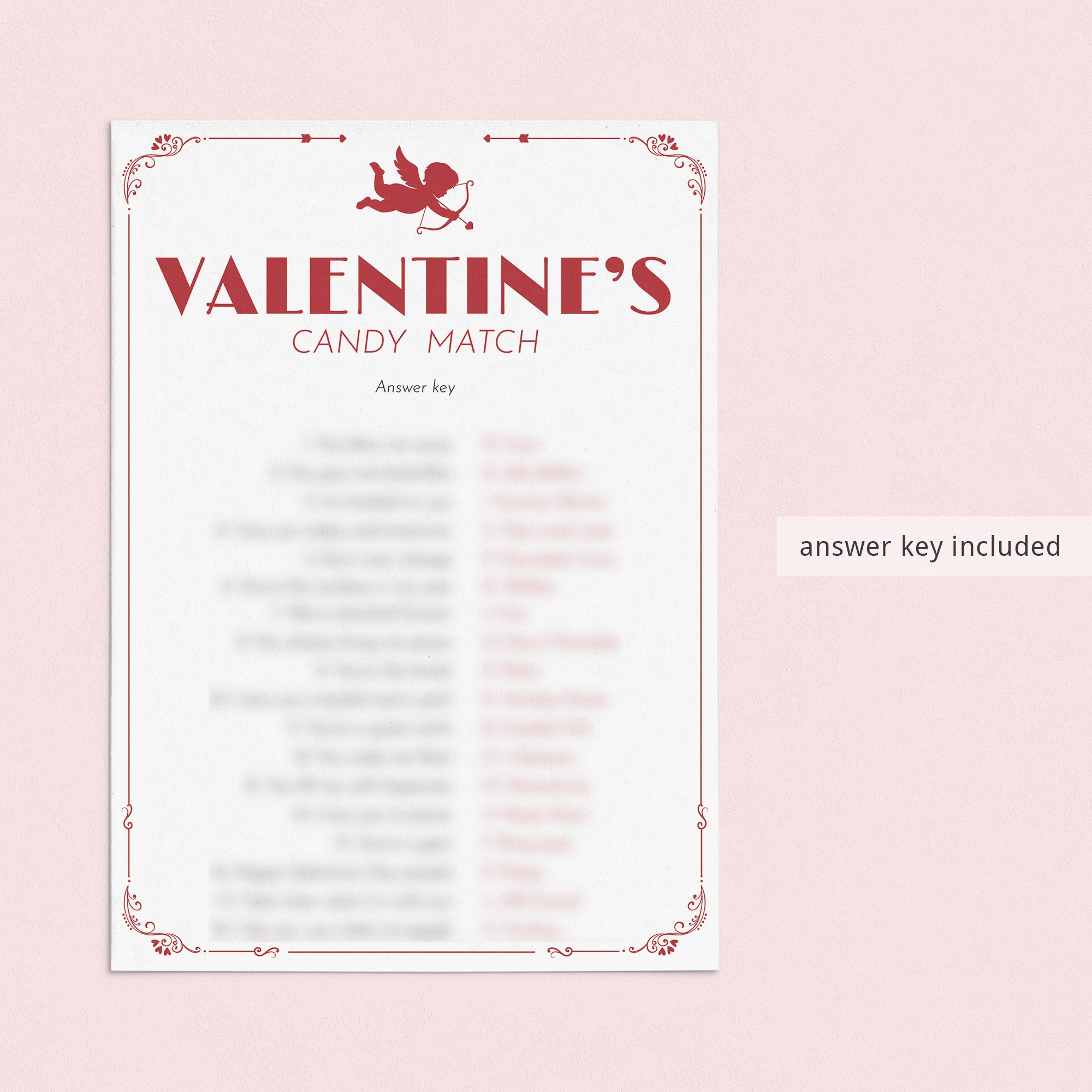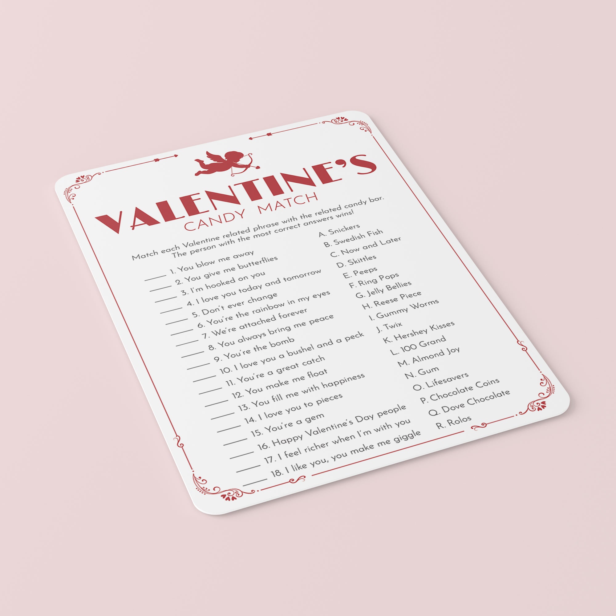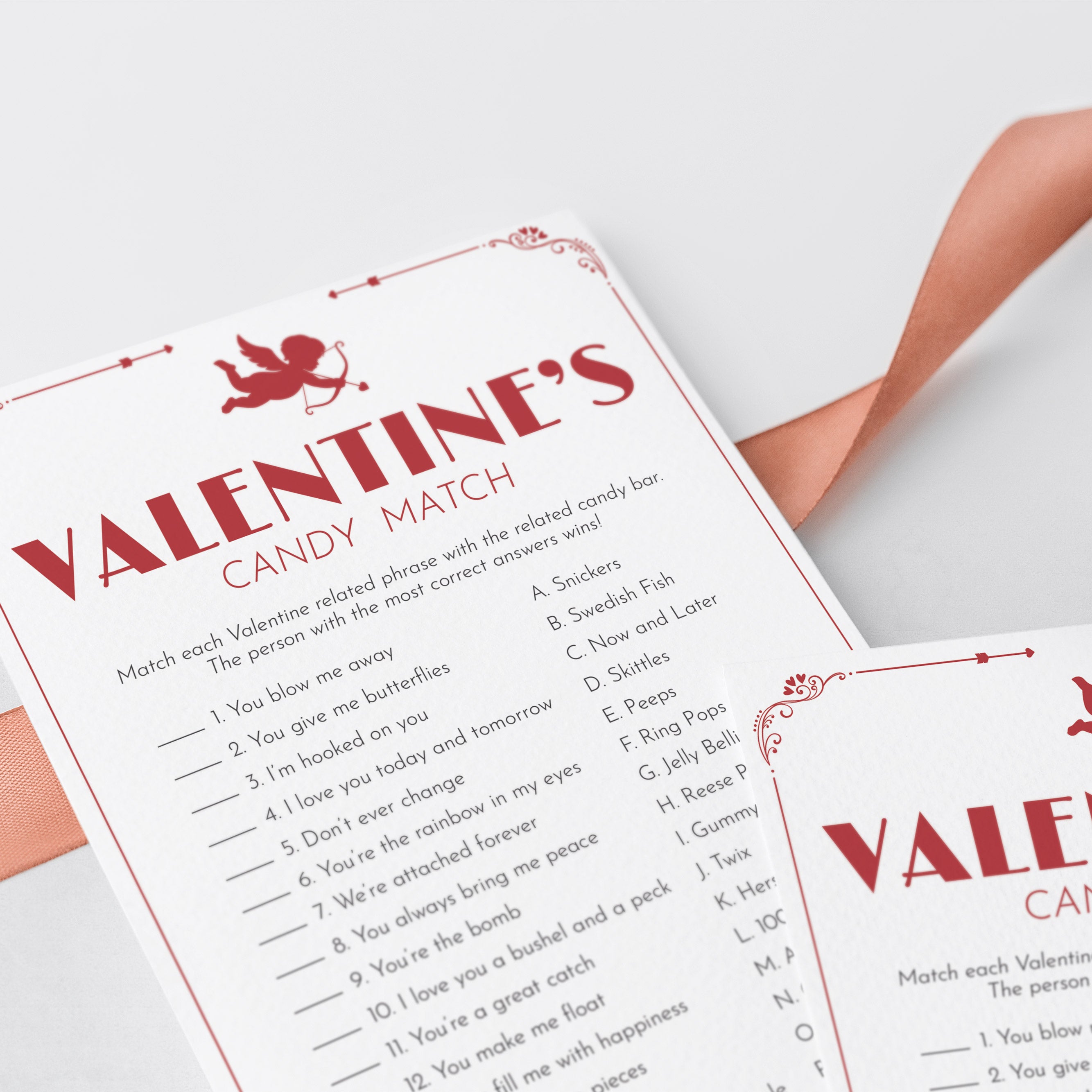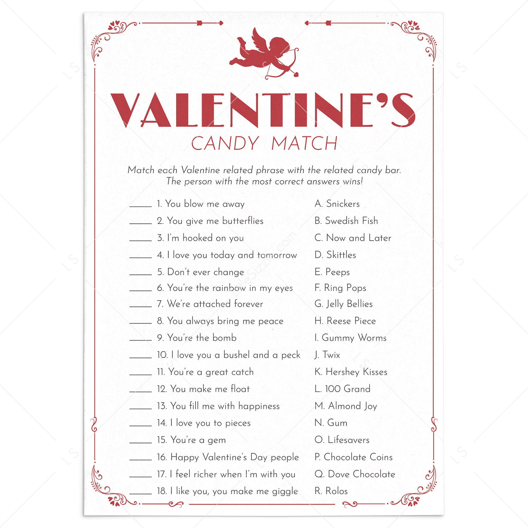 This vintage themed Valentines Candy Bar Match game with cupid silhouette has a list of 19 candies and Valentine's-related sayings that go along with each candy. For example, “We're attached forever” is a match with a “Twix”. The person with the most correct answers wins some tasty treats.