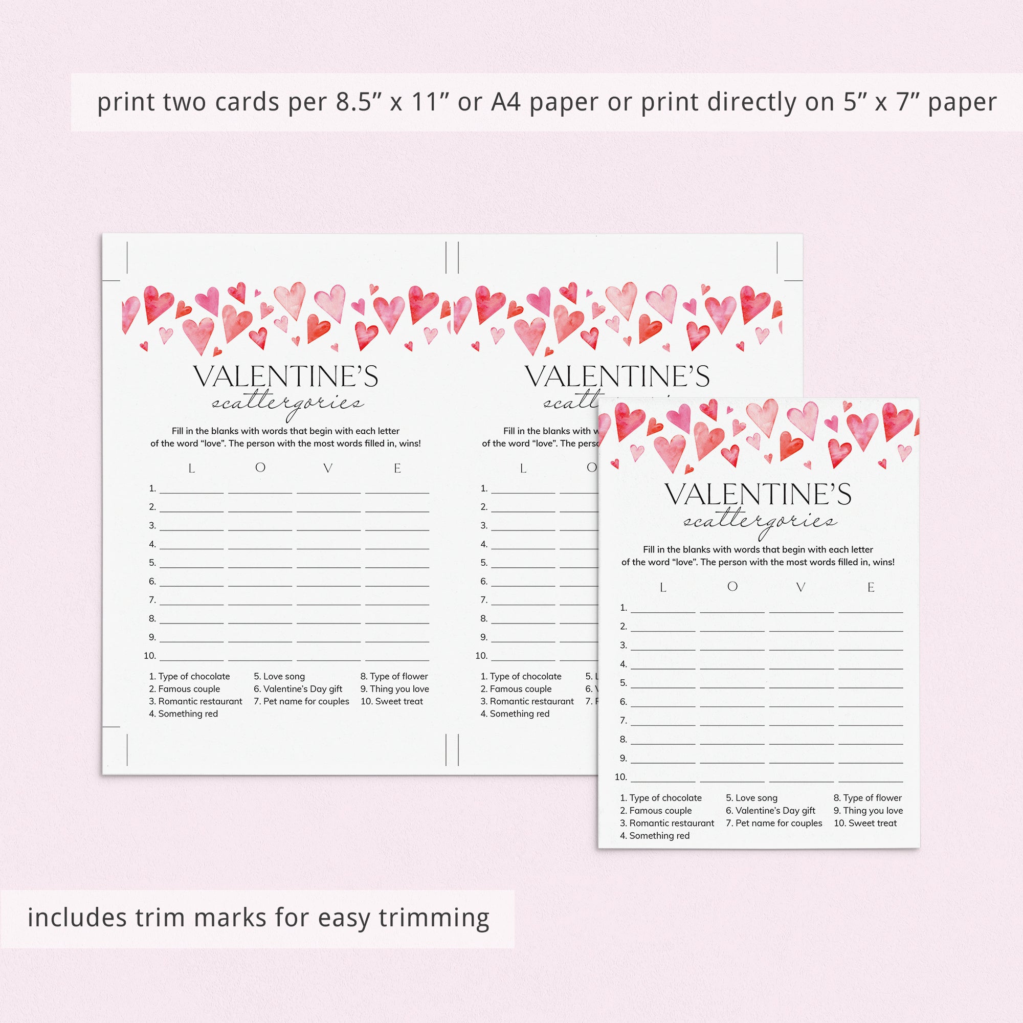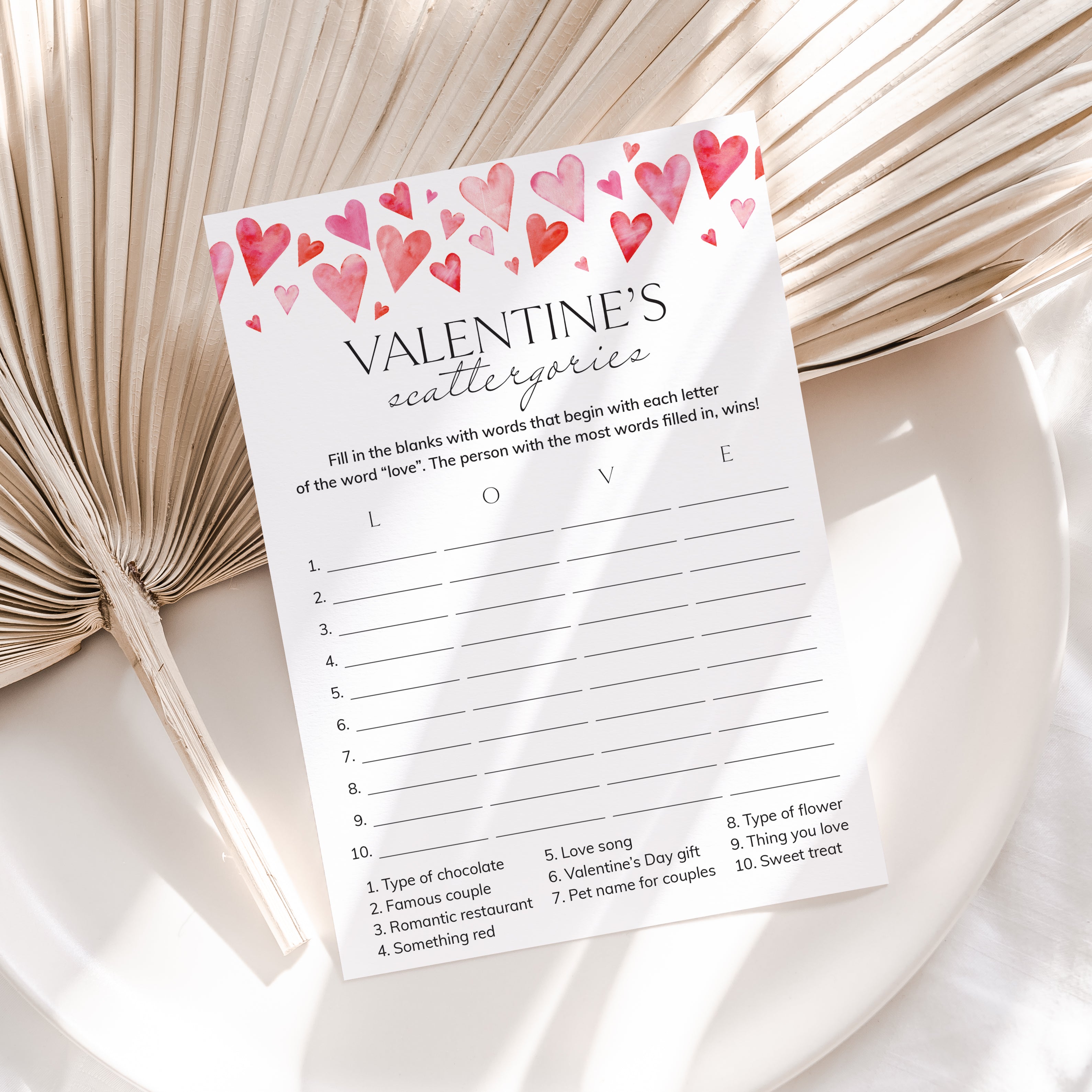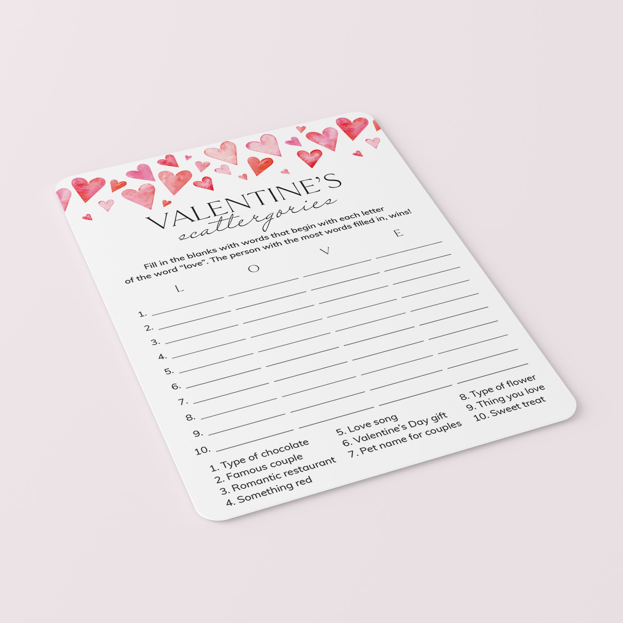 How many words can you fill in with the letters "L", "O", "V" and "E"? Play Scattergories with this cute game card with watercolor hearts. It's a great Valentine's Day game for the office. Lots of fun and laughter guaranteed.