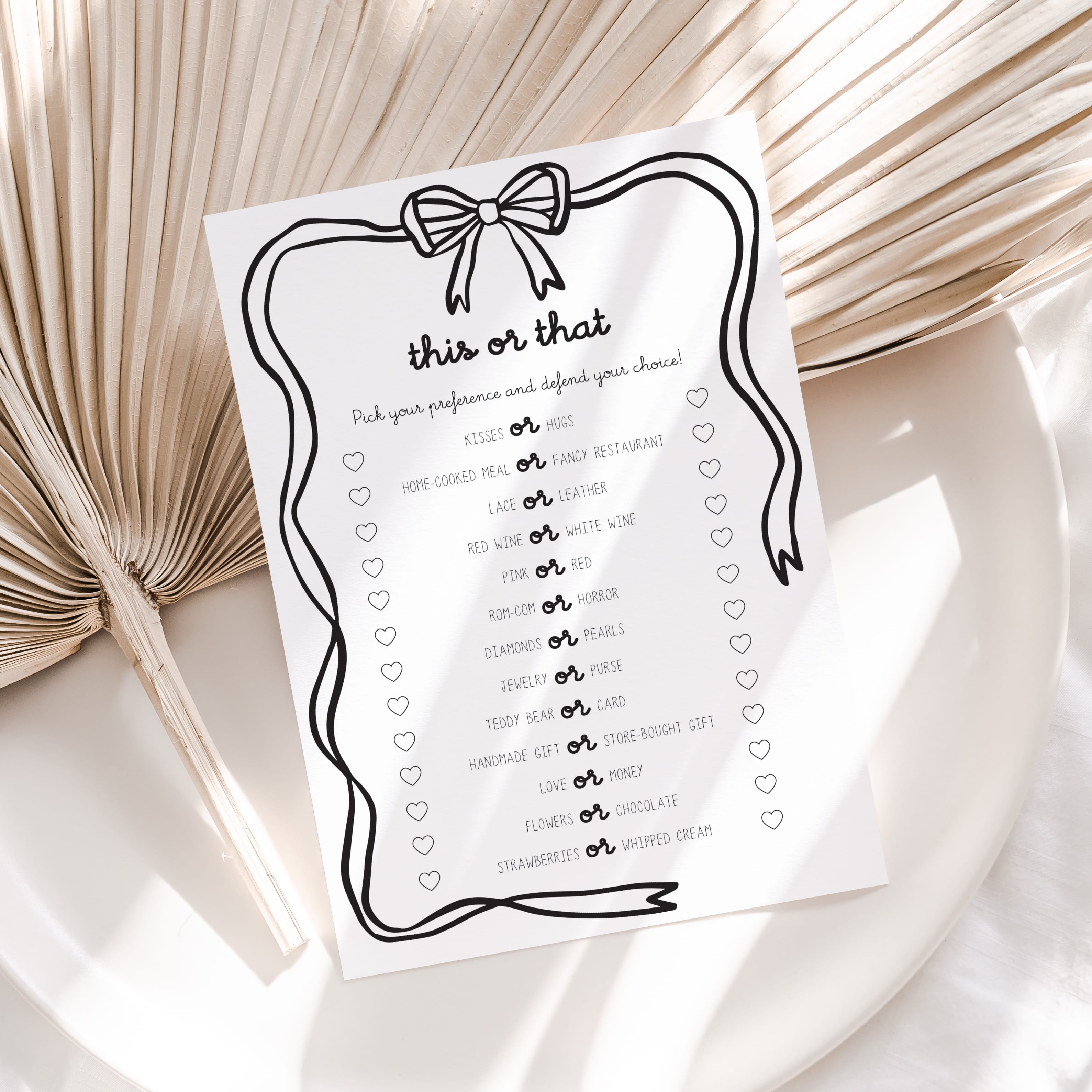 This charming game, featuring a playful wavy border topped with a sweet black bow, has 13 Valentine's Day This or That questions. Pick your preferences and defend your choice.