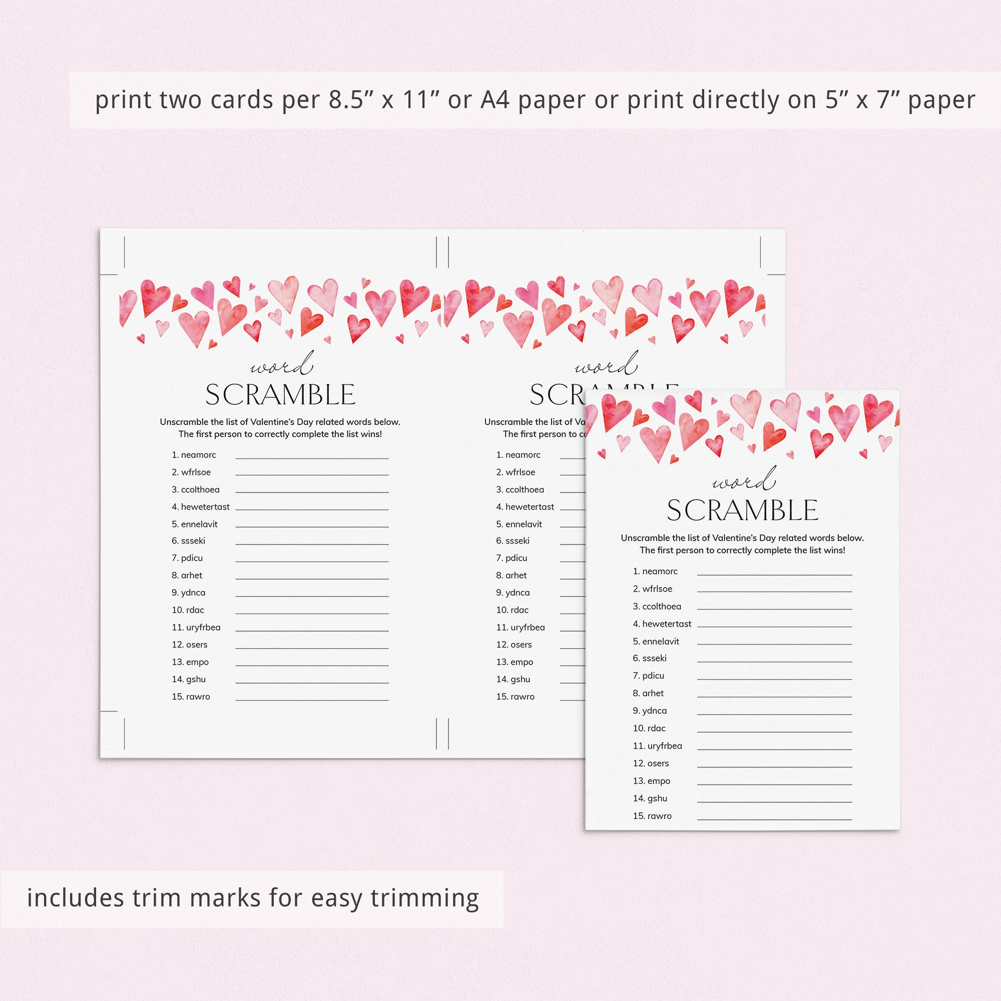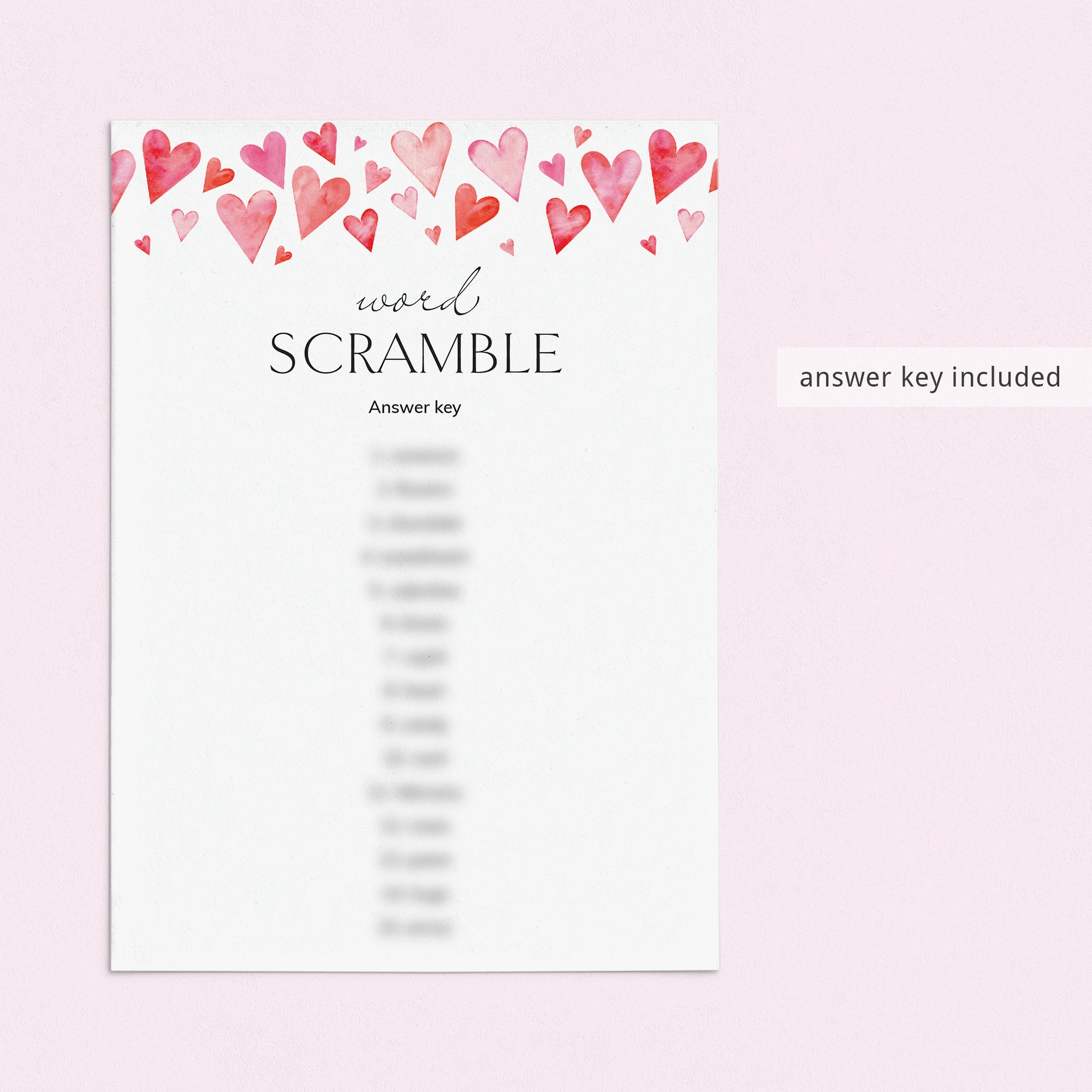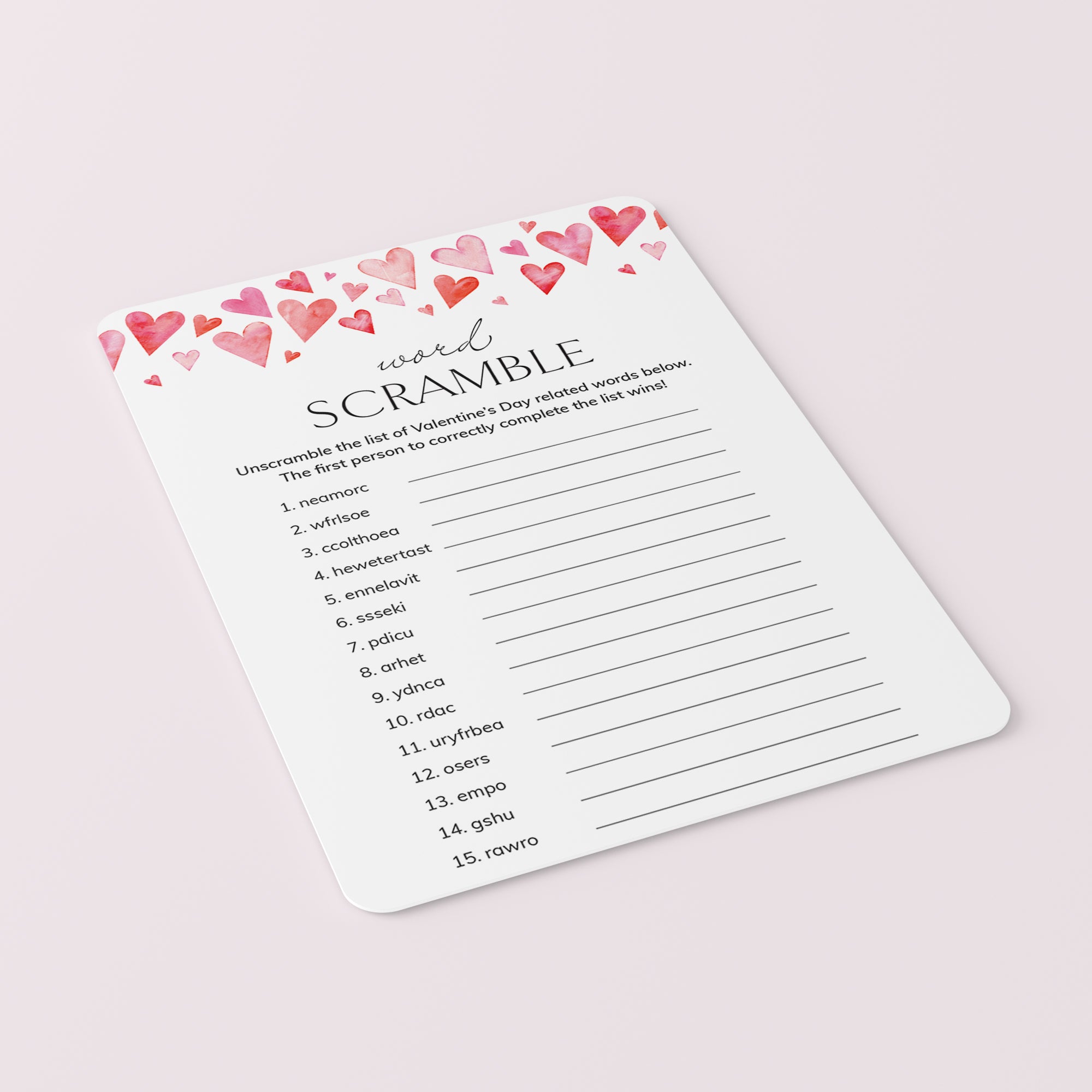 This Valentines Day Word Scramble game is an instant download. After purchase you will receive a download link immediately on screen. Also within minutes of your order and payment, an e-mail will be sent to you with a link for your download.