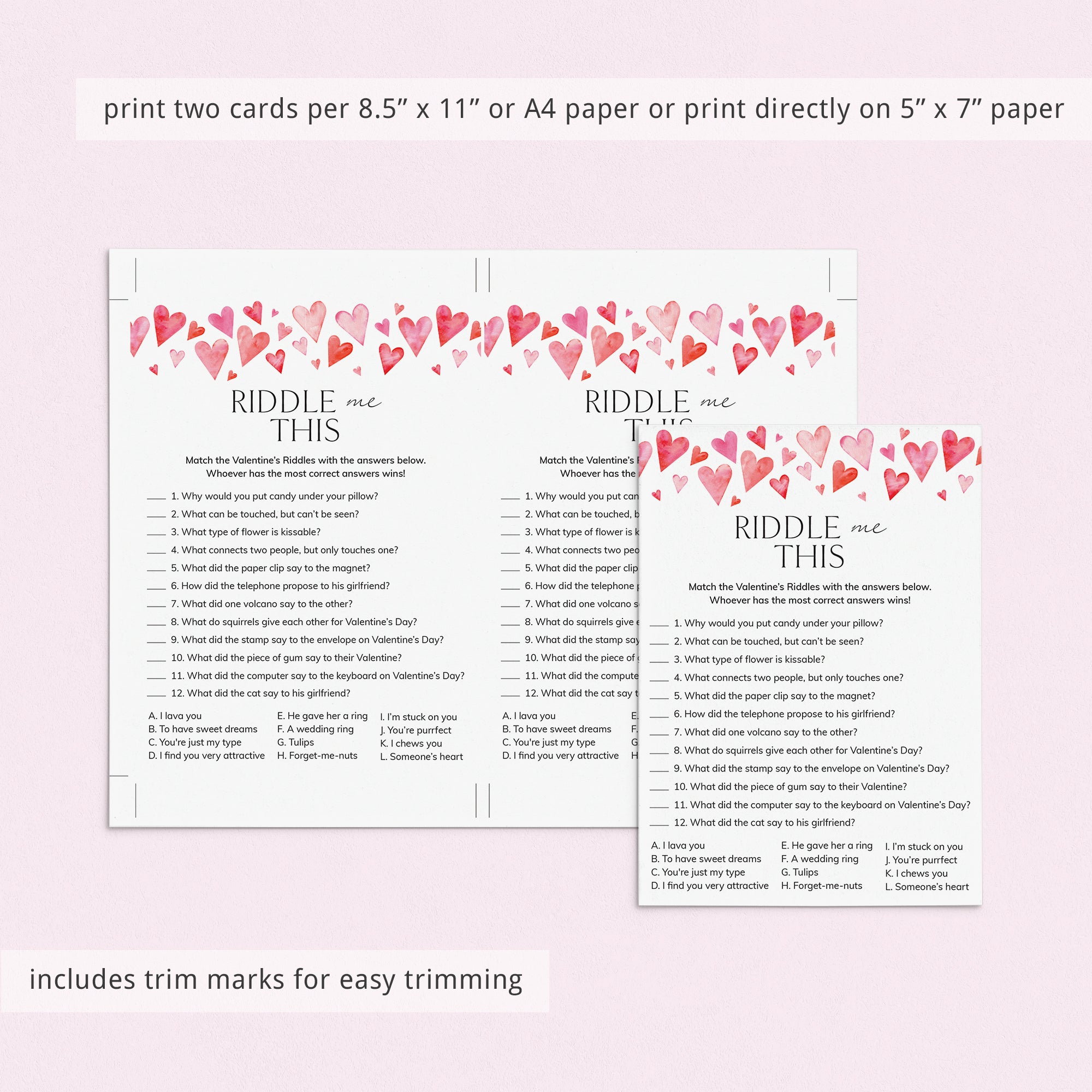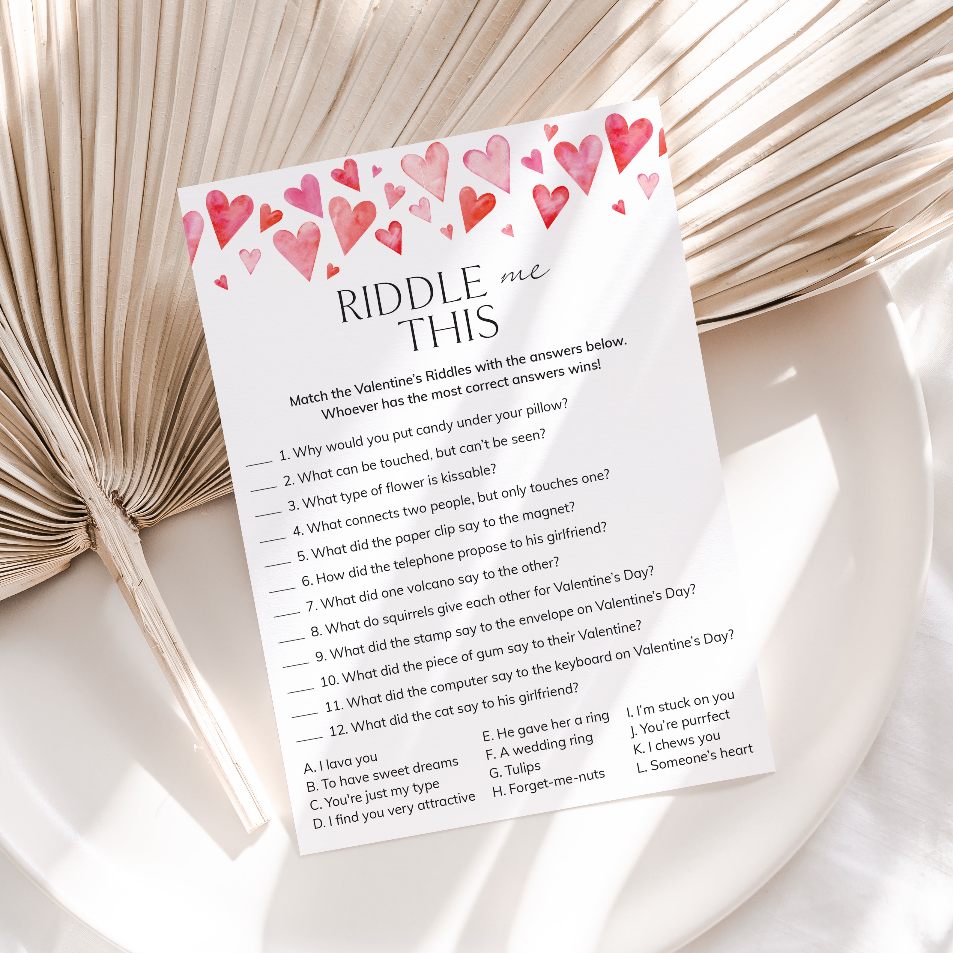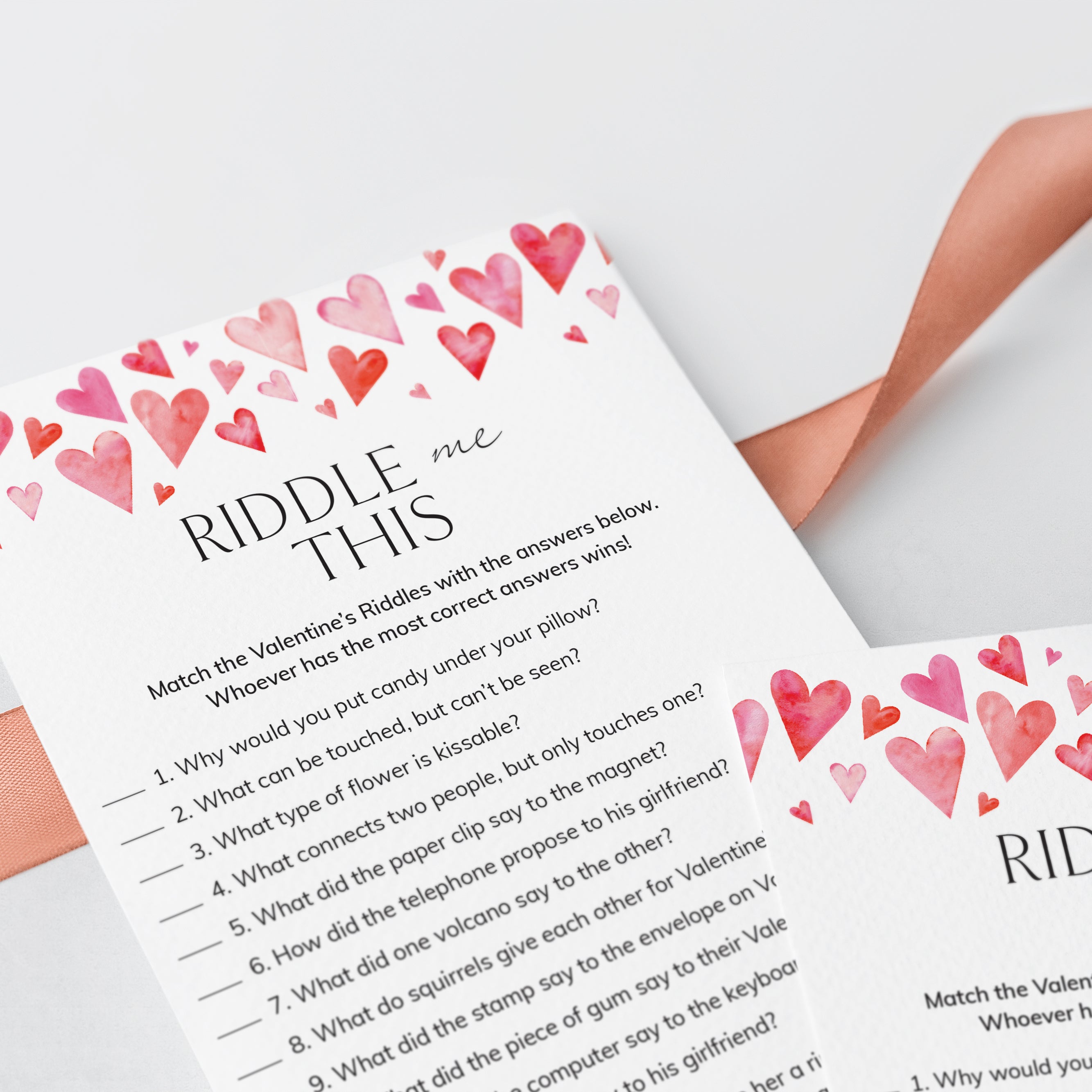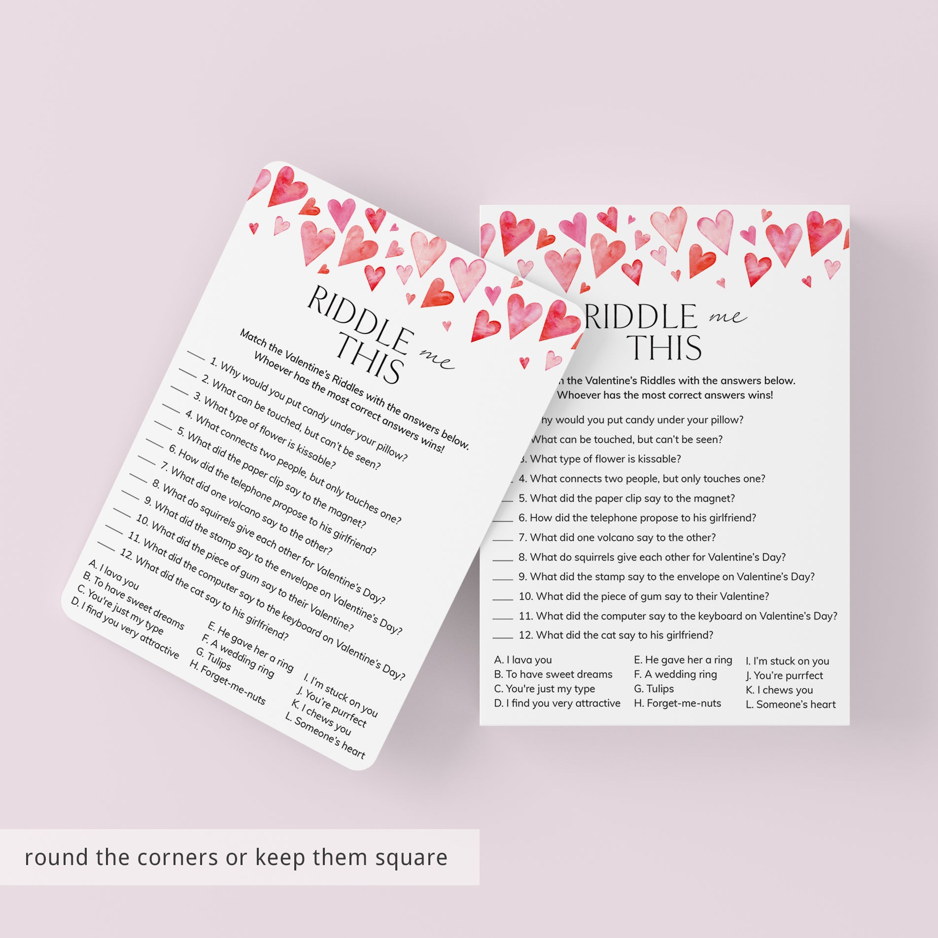 Do you think you have what it takes to solve these 12 funny and sweet Valentine's Day riddles? This printable Valentine's Day Riddle Me This game is the perfect addition to your Valentine's Celebration. It's a great activity for the whole family, kids and adults of all ages will love it.