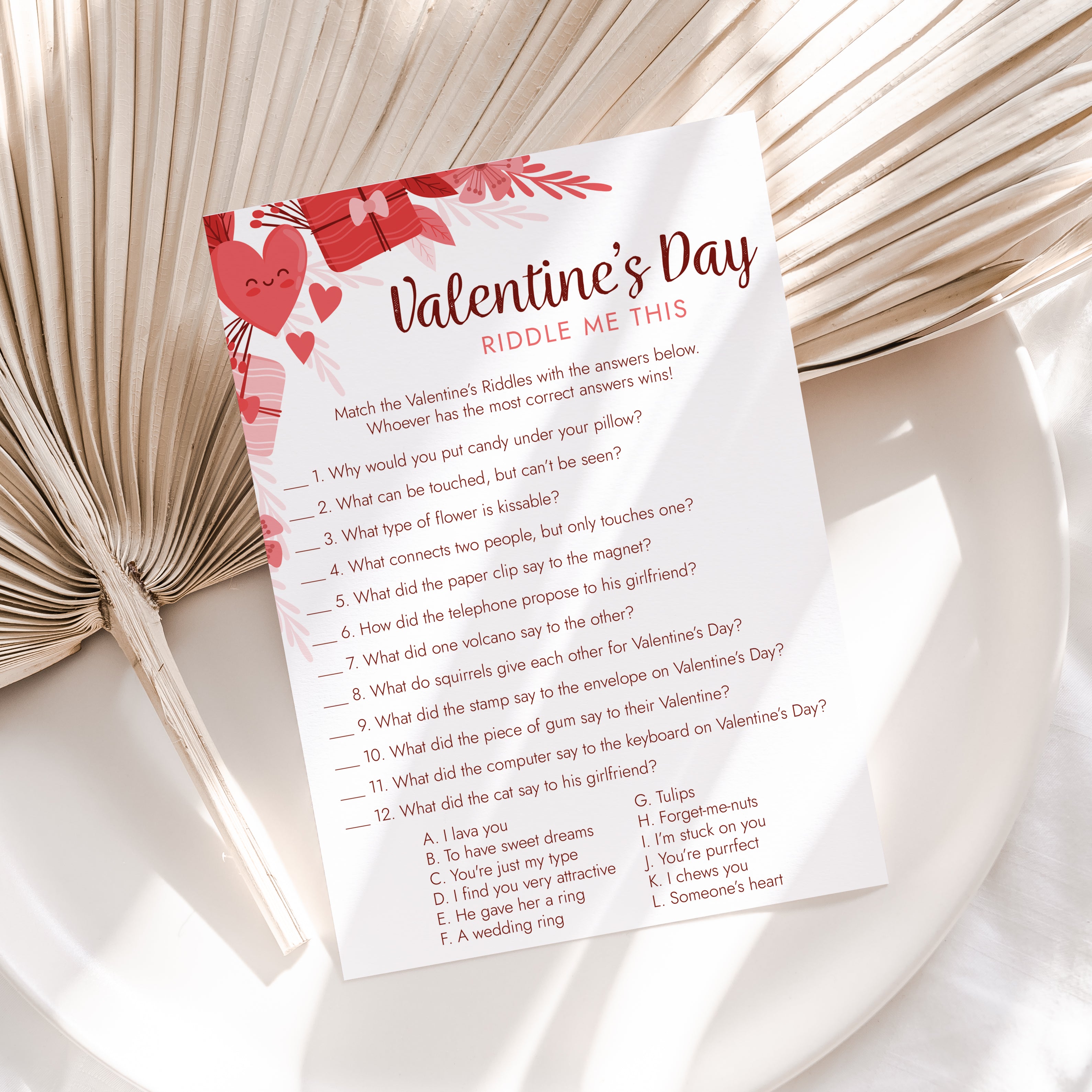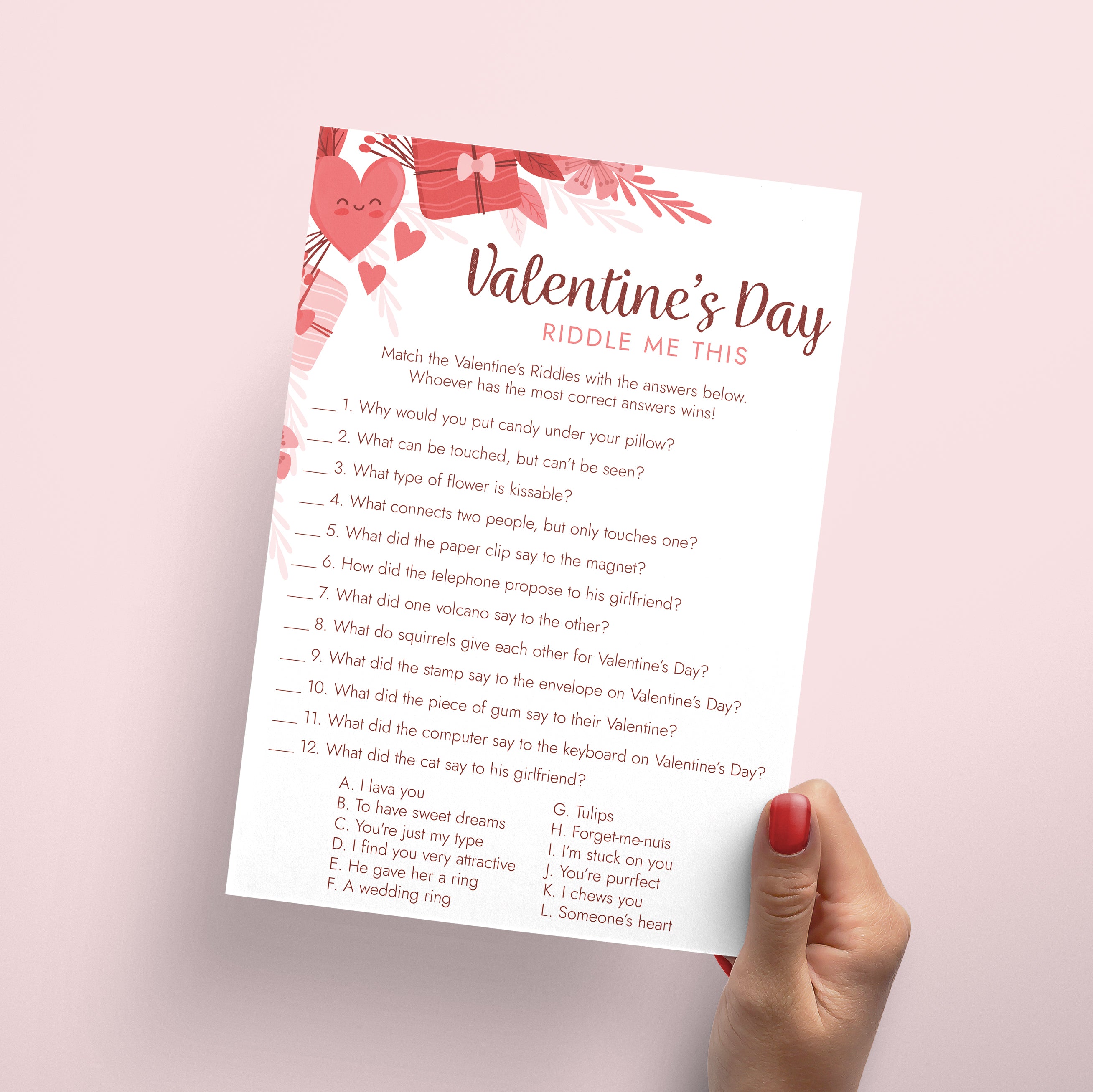 Do you think you have what it takes to solve these 12 funny and sweet Valentine's Day riddles? This printable Valentine's Day Riddle Me This game is the perfect addition to your Valentine's Celebration. It's a great activity for the whole family, kids and adults of all ages will love it.