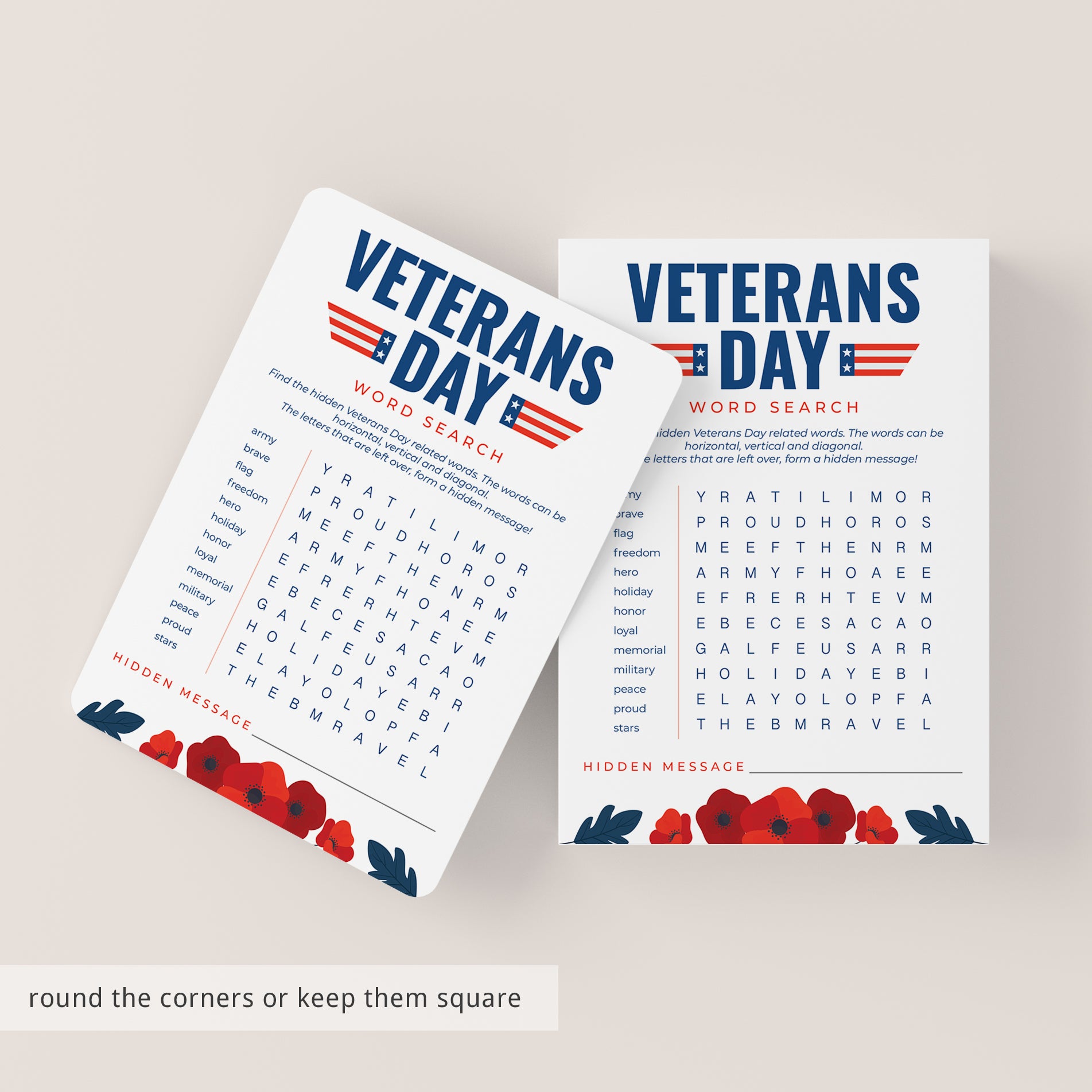 Let everyone search for all Veterans Day related words that are listed on these blue and red patriotic game cards with red poppies. The words can be found horizontally, vertically and diagonally.