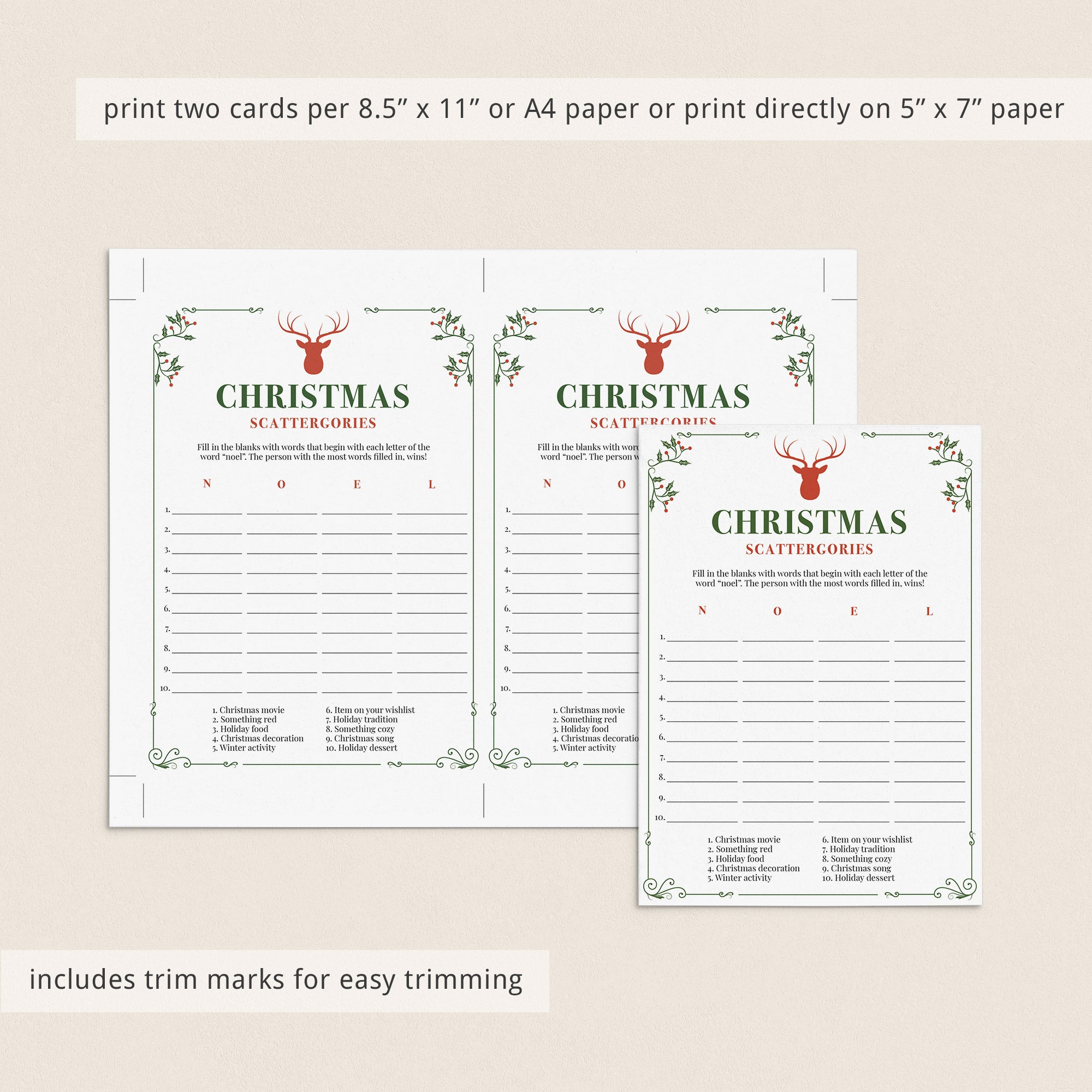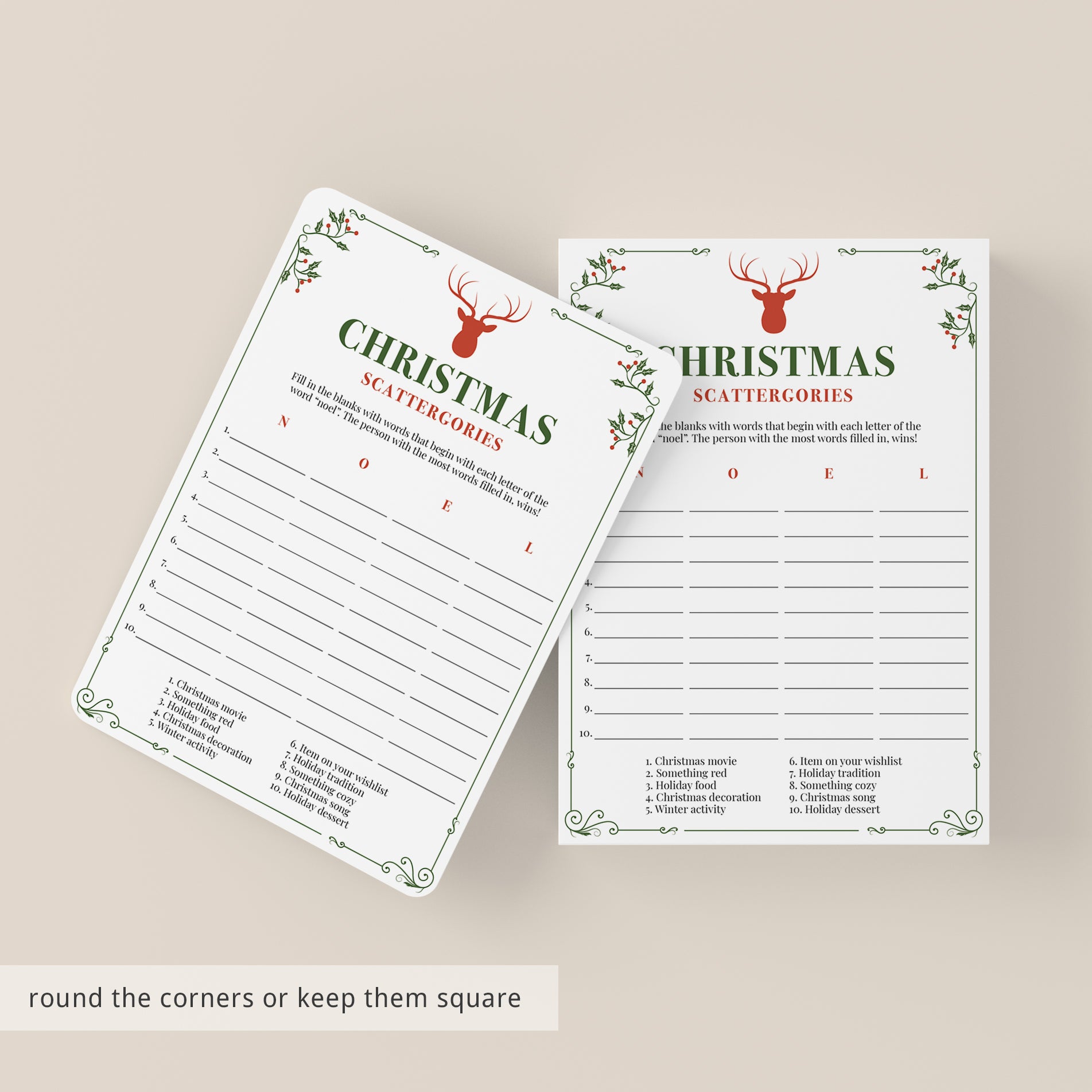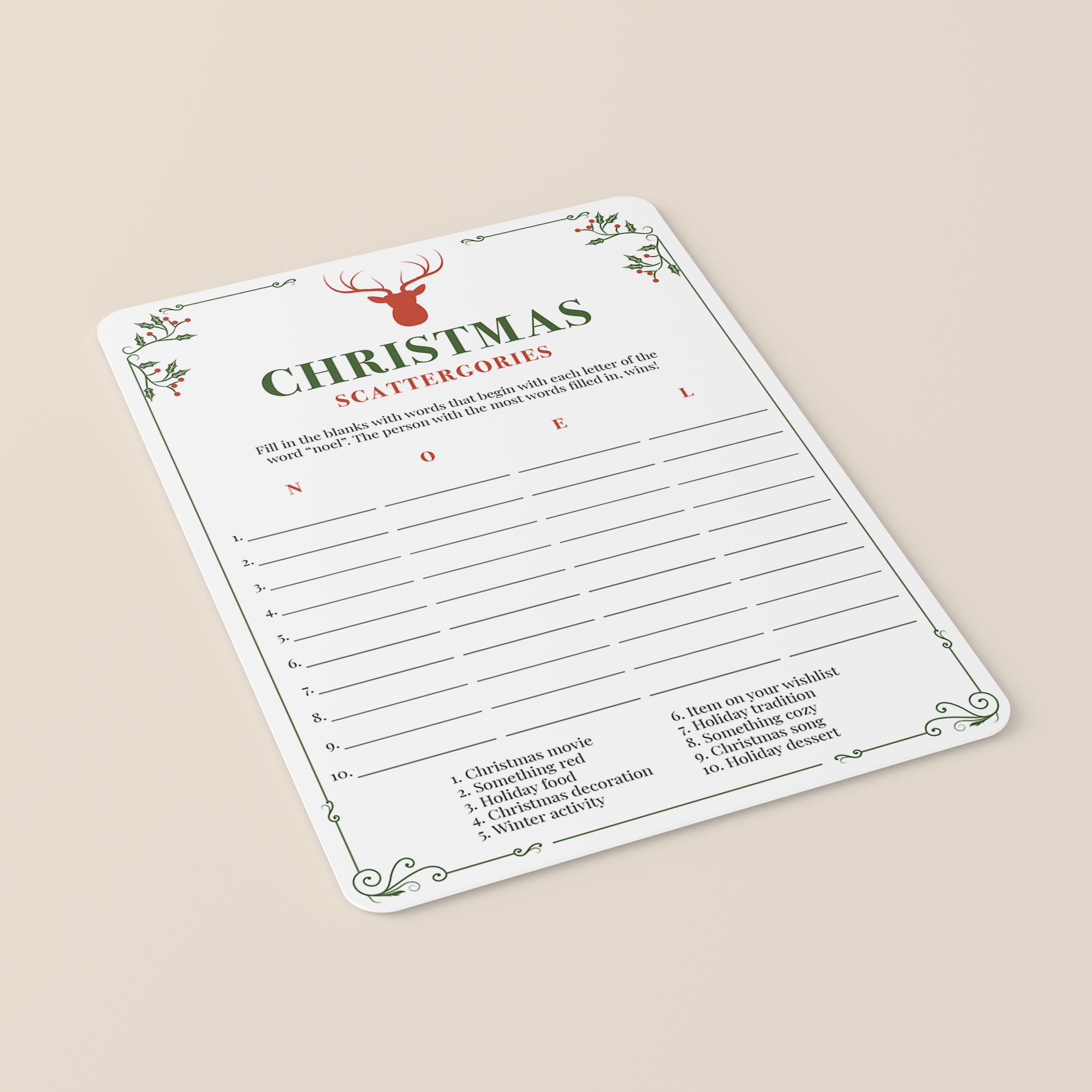 How to play the Christmas Scattergories game? Simply hand out one of these vintage Christmas game cards and a pen to your guests. They will have to come up with as many words related to the categories at the bottom of the sheet. The difficulty is that the words must begin with the letters in the word "NOEL". The person that gets the most words filled in within the set time, wins!