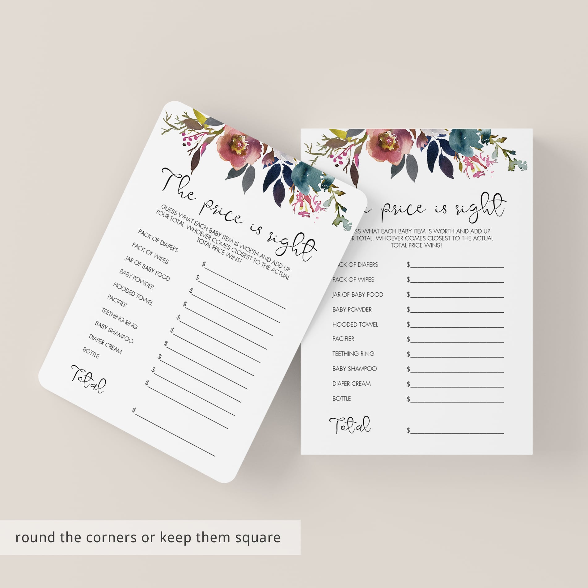 Play "the Price is Right" with these stunning vintage florals baby shower game cards. The watercolor cards would be perfect for any flower themed baby shower and will create an enjoyable moment for all of your guests.