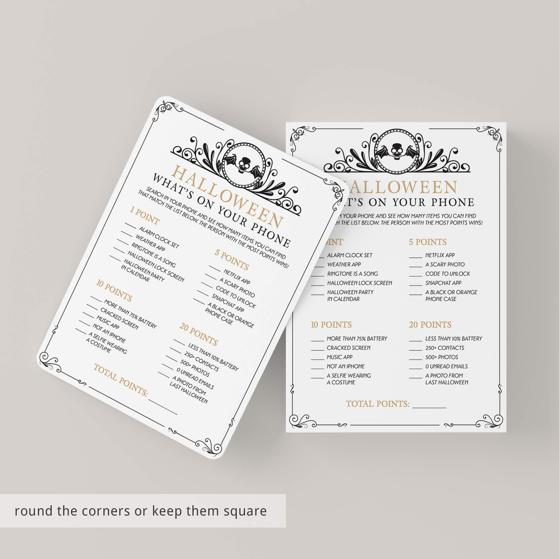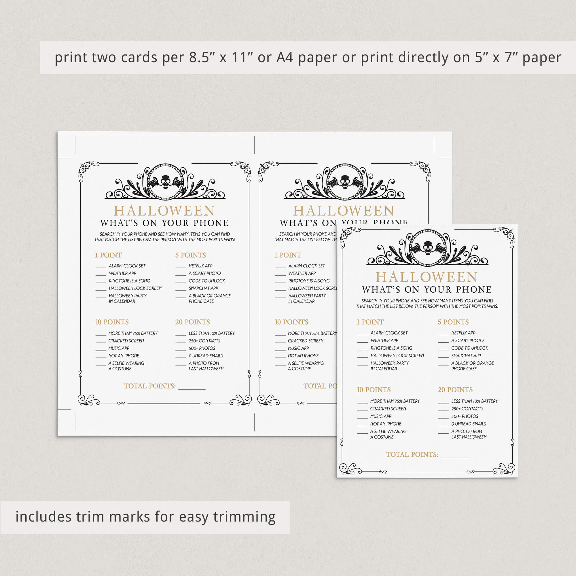 All guests need to play is a smartphone and one of these vintage Halloween What's On Your Phone game cards with black skull and gold details.