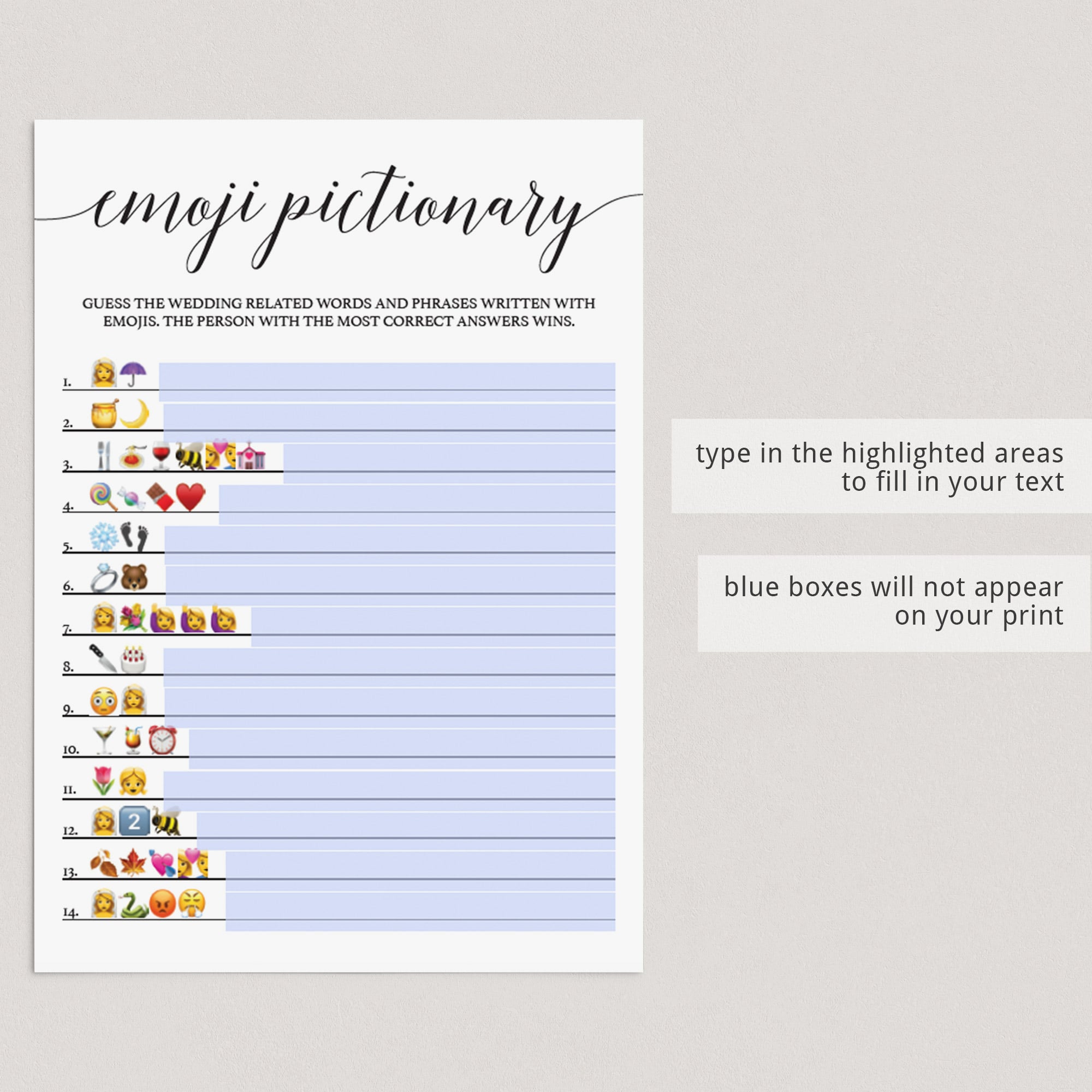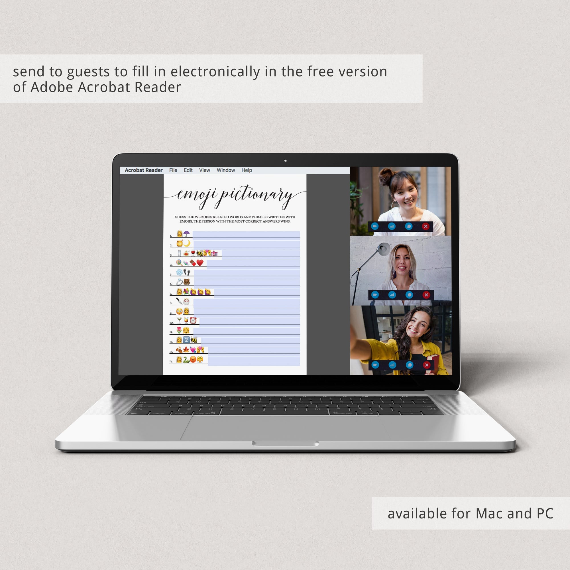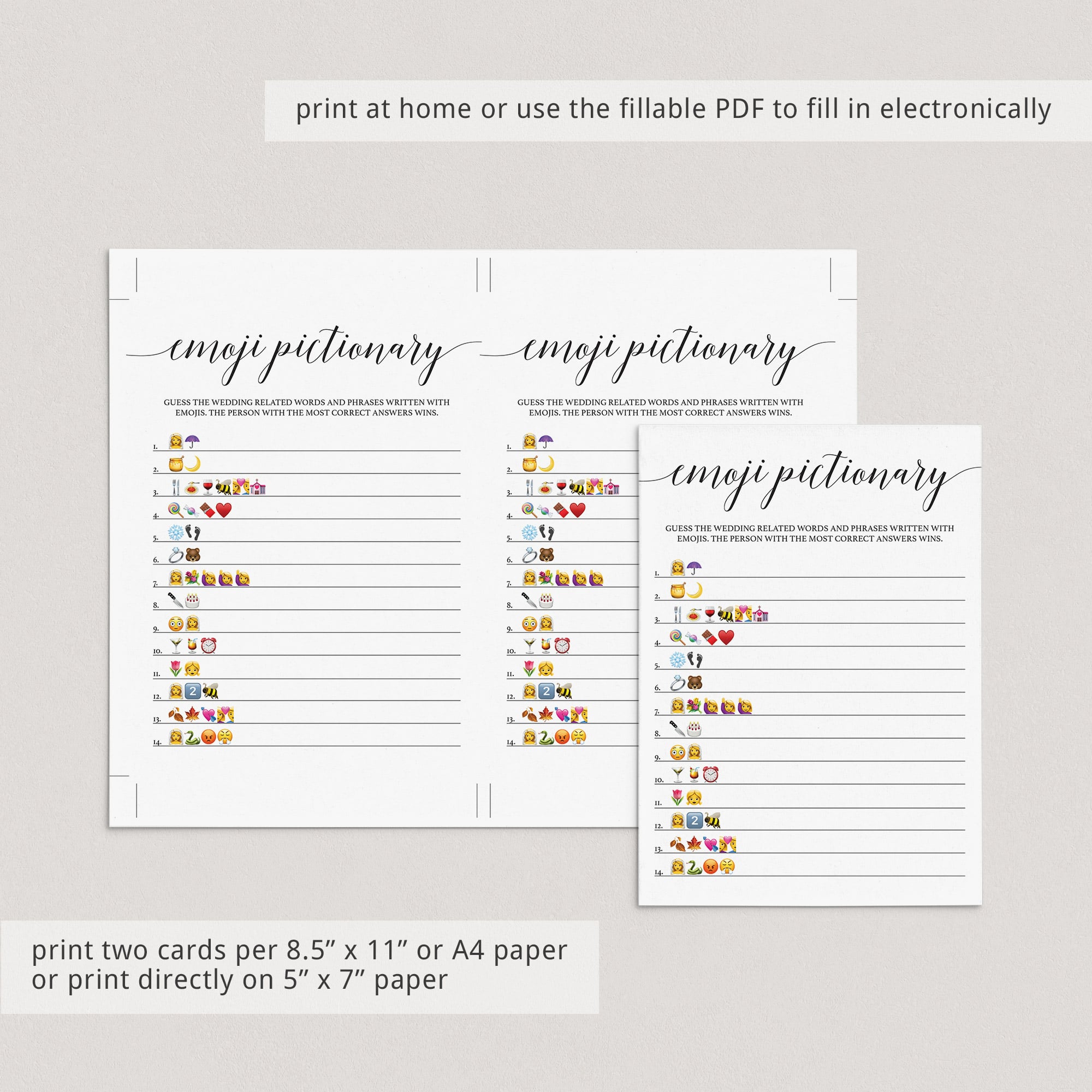 And if you are hosting a virtual bridal shower, you can email the Emoji game cards to friends and family and have them print the cards at home or fill in the answers electronically in the free version of Adobe Acrobat Reader.