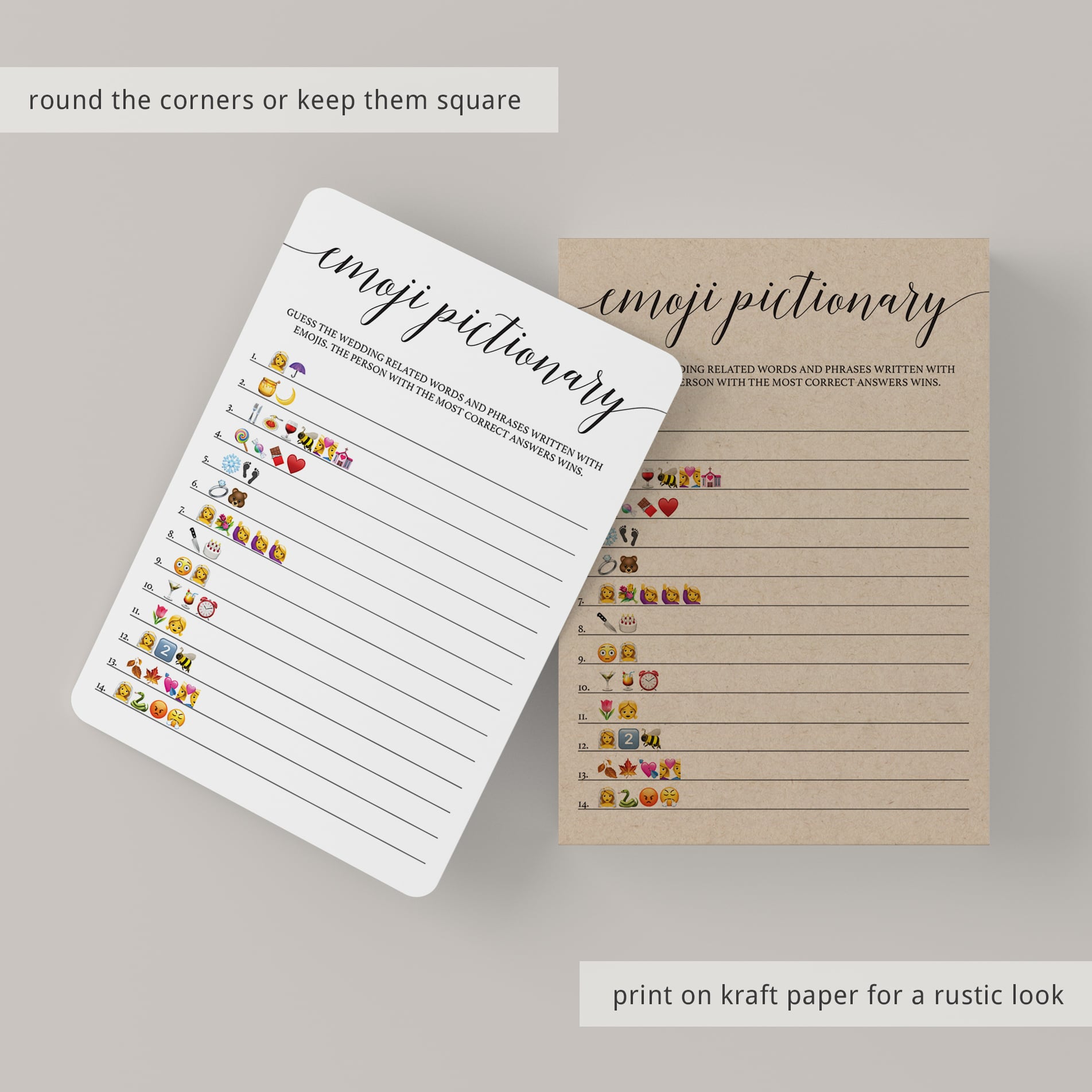 For an in-person bridal shower, you can download and print the cards as many times as you need. We recommend printing on a nice heavy card stock for highest quality feel. The game has been designed in black and white. You can print on kraft paper to create a rustic look or print on colored cardstock for beautiful results. Print right from your computer in a matter of minutes or have the cards printed at your favorite print shop.