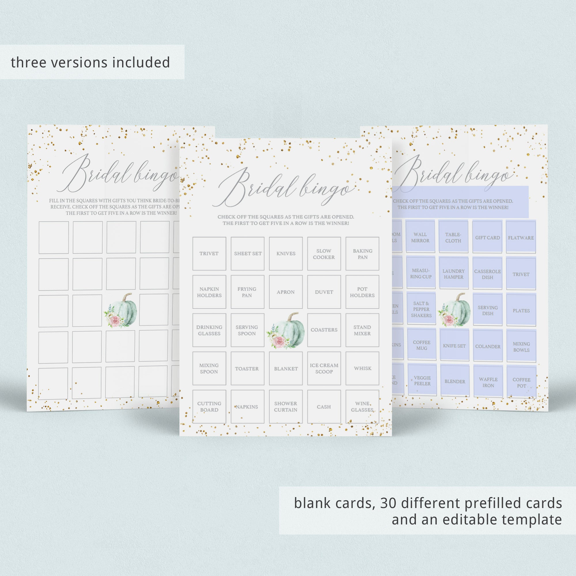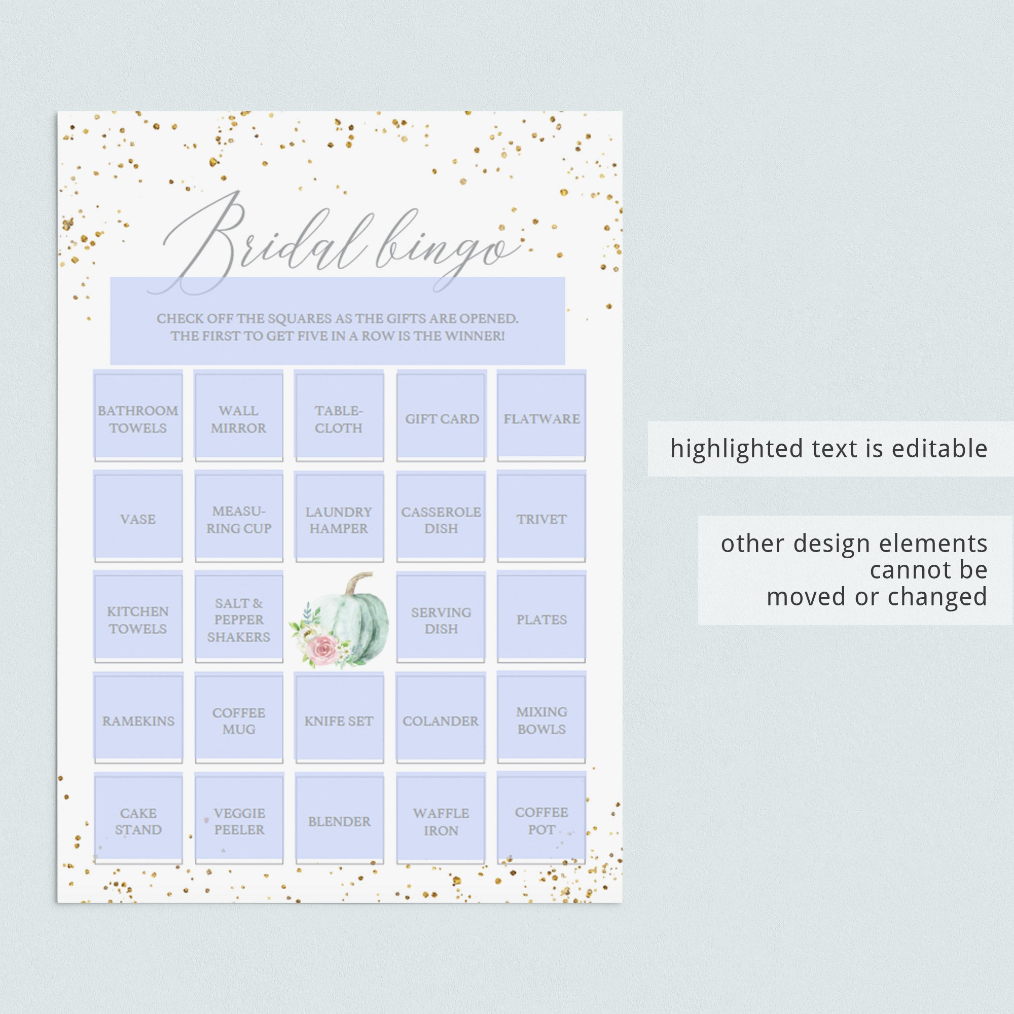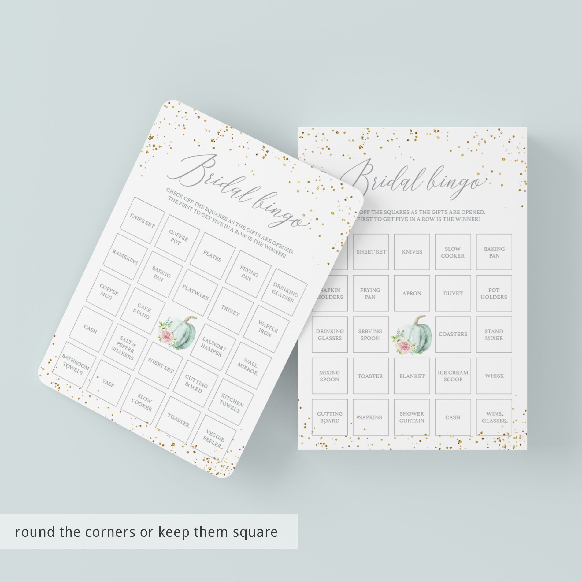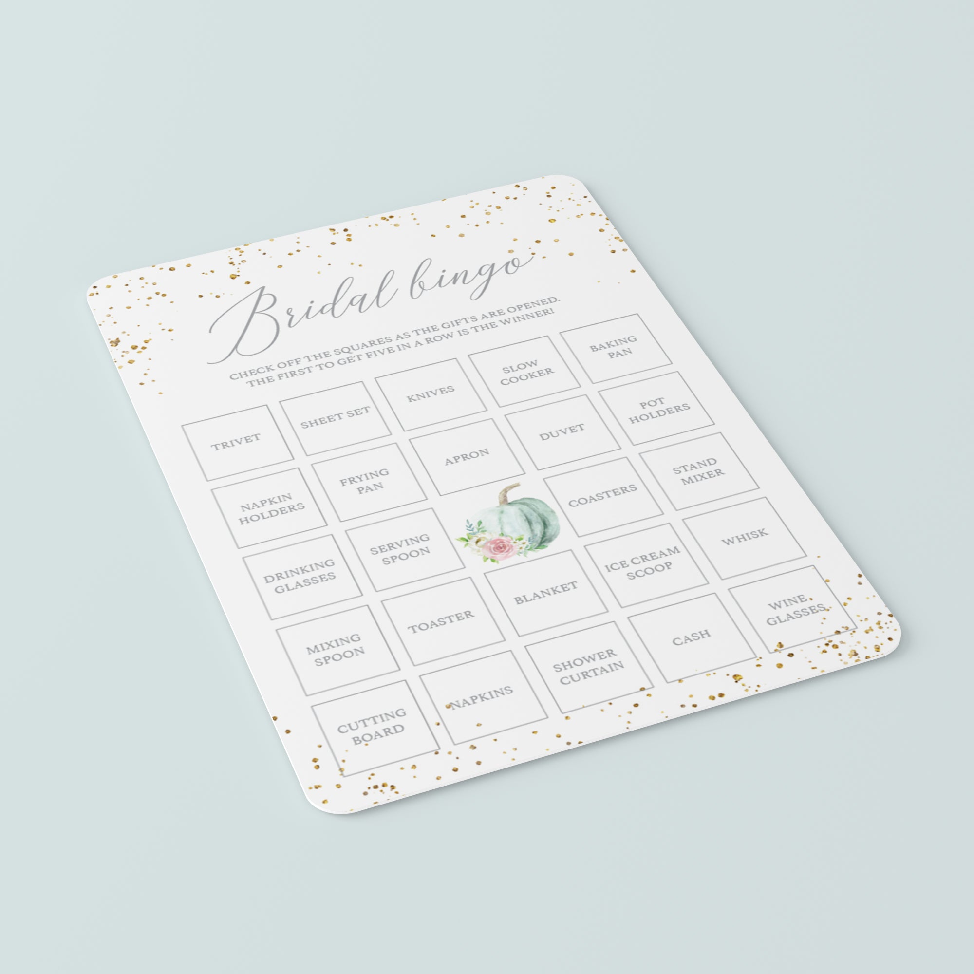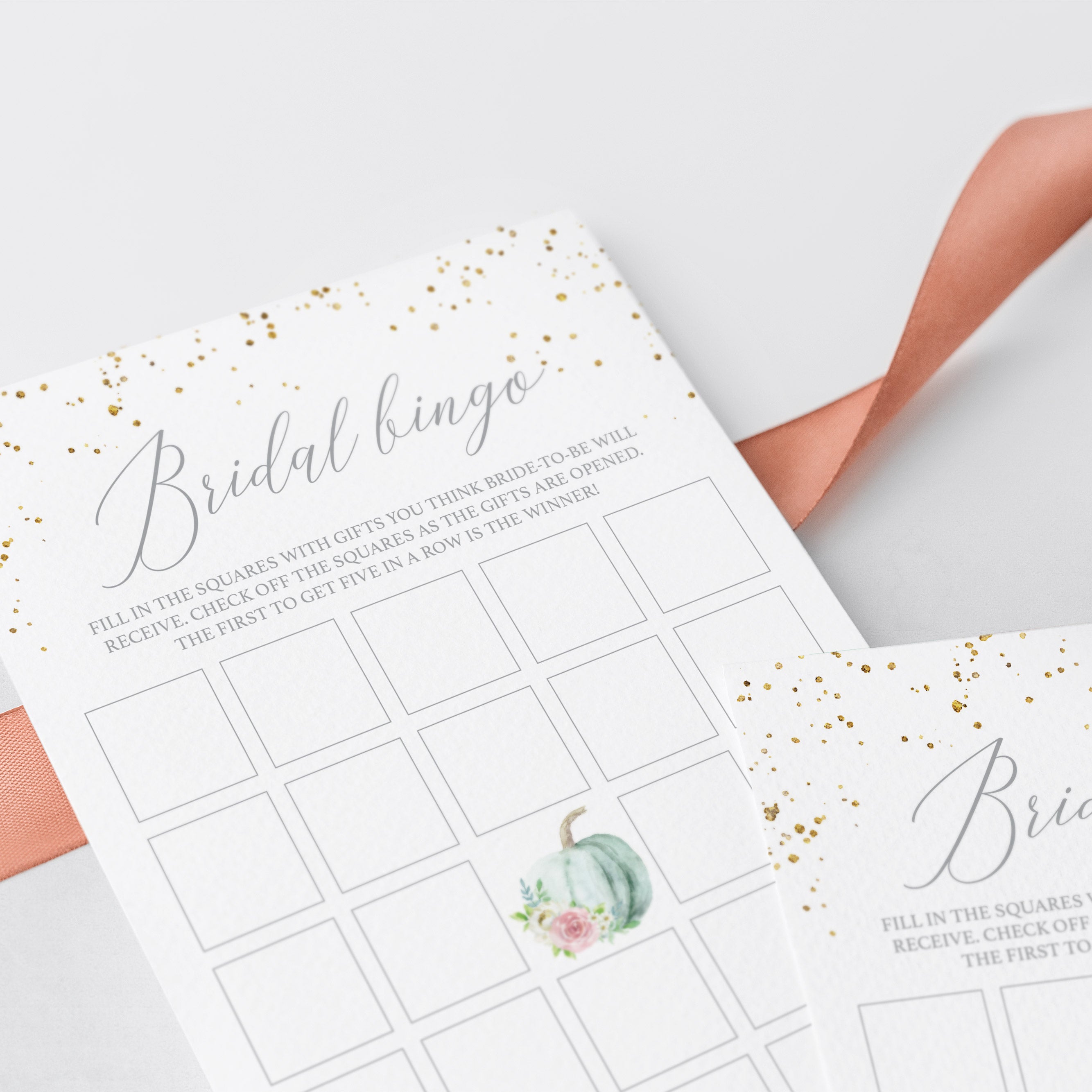 You think that unpacking the bridal shower gifts is the dullest moment of the party? Not with this beautiful bridal shower bingo cards with watercolor pumpkin! It's the perfect addition to your fall theme bridal shower.