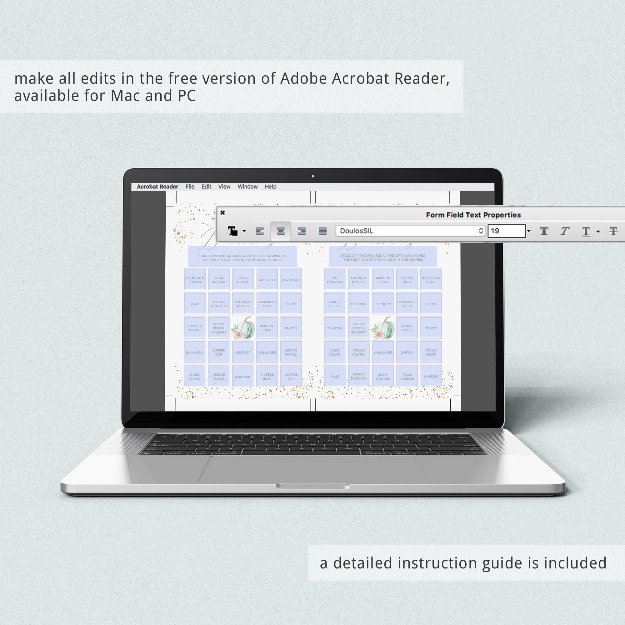 The bridal bingo cards are instant downloadable files that can be printed at home or ordered from a local or online print shop. We've included a detailed instruction guide to make the process even easier!