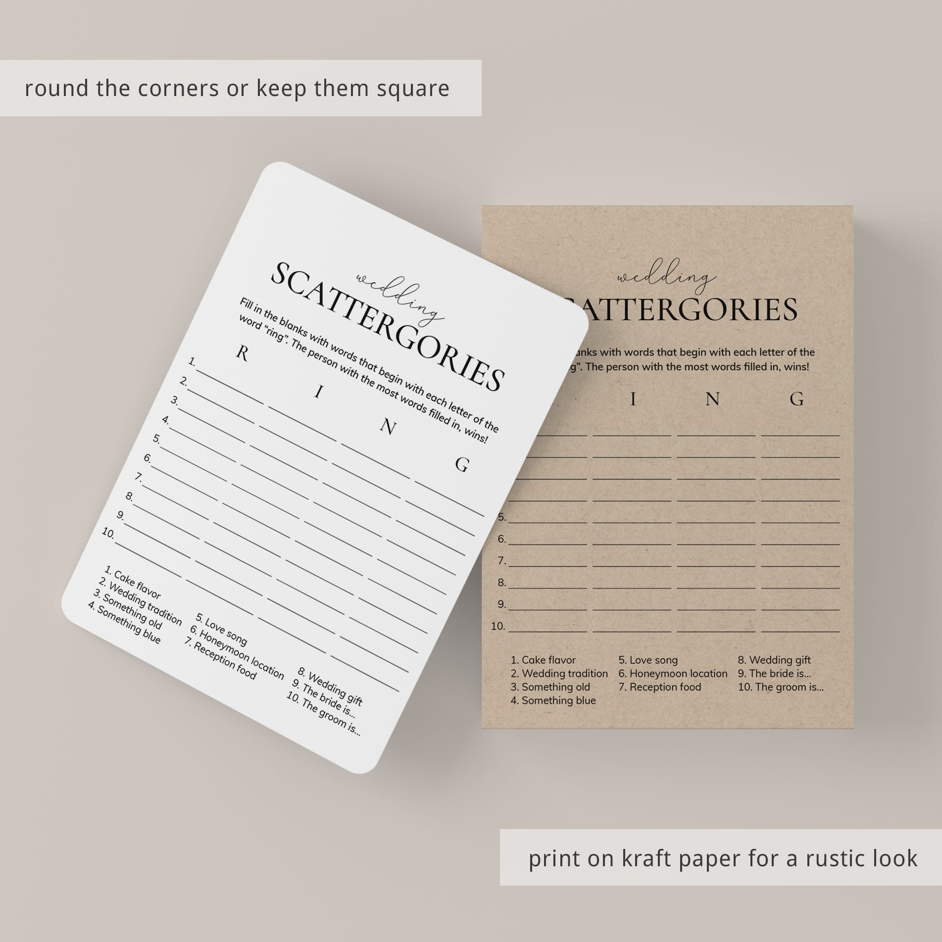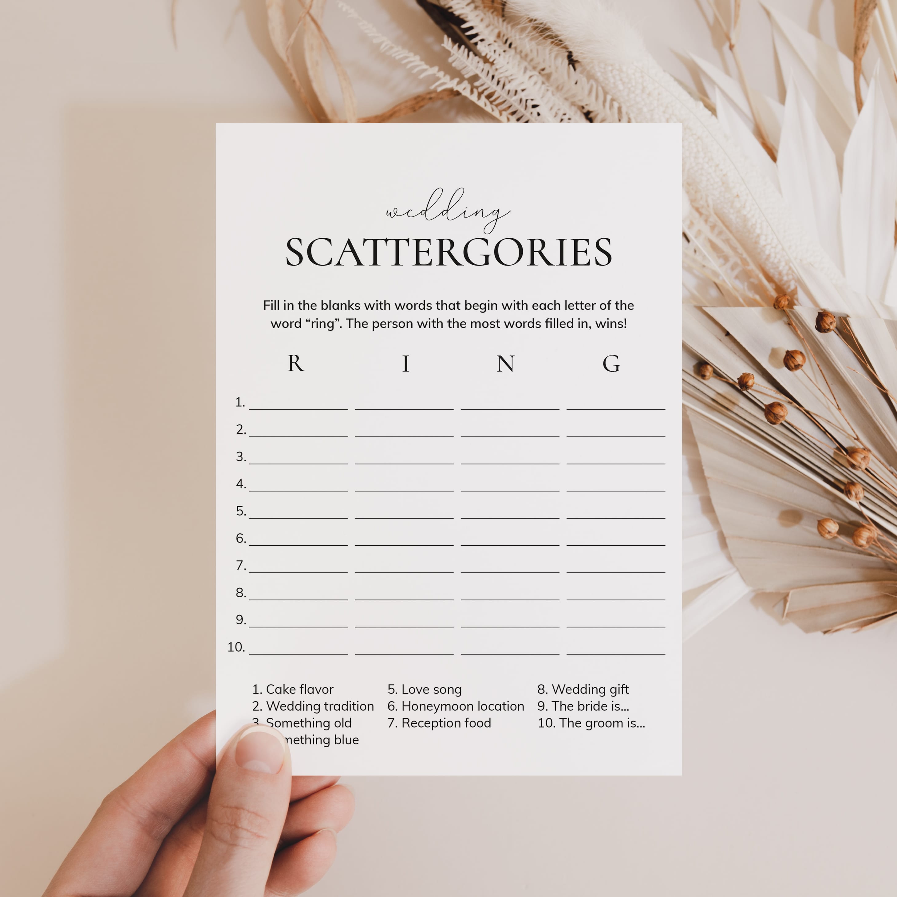 How many words can you fill in with the letters "R", "I", "N" and "G"? Play Wedding Scattergories at your couples shower or engagement party with these elegant minimalist game cards to ensure lots of... Read more