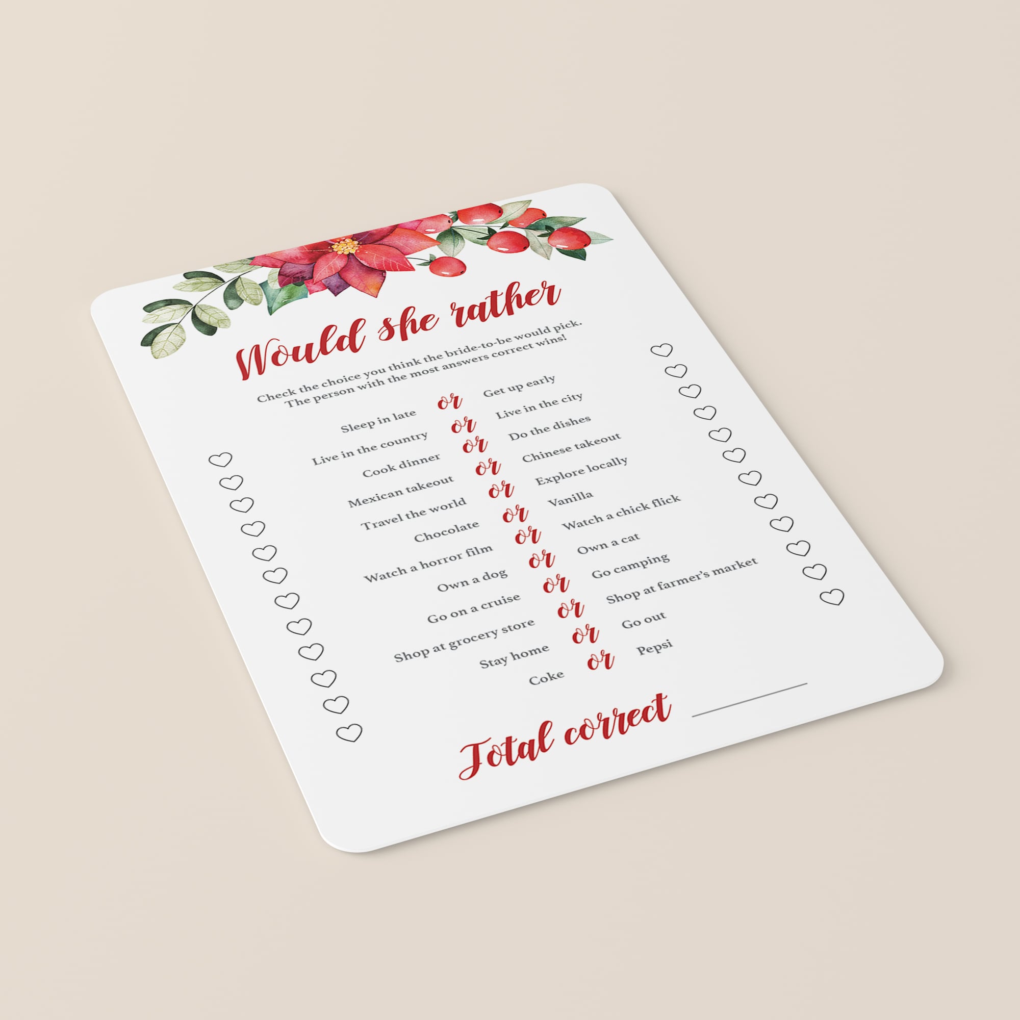 Who knows the bride-to-be best? Figure it out with this beautiful What Would She Rather bridal shower game with red flowers, berries and green leaves. These game cards with would be perfect for a winter floral or Christmas themed bridal shower.