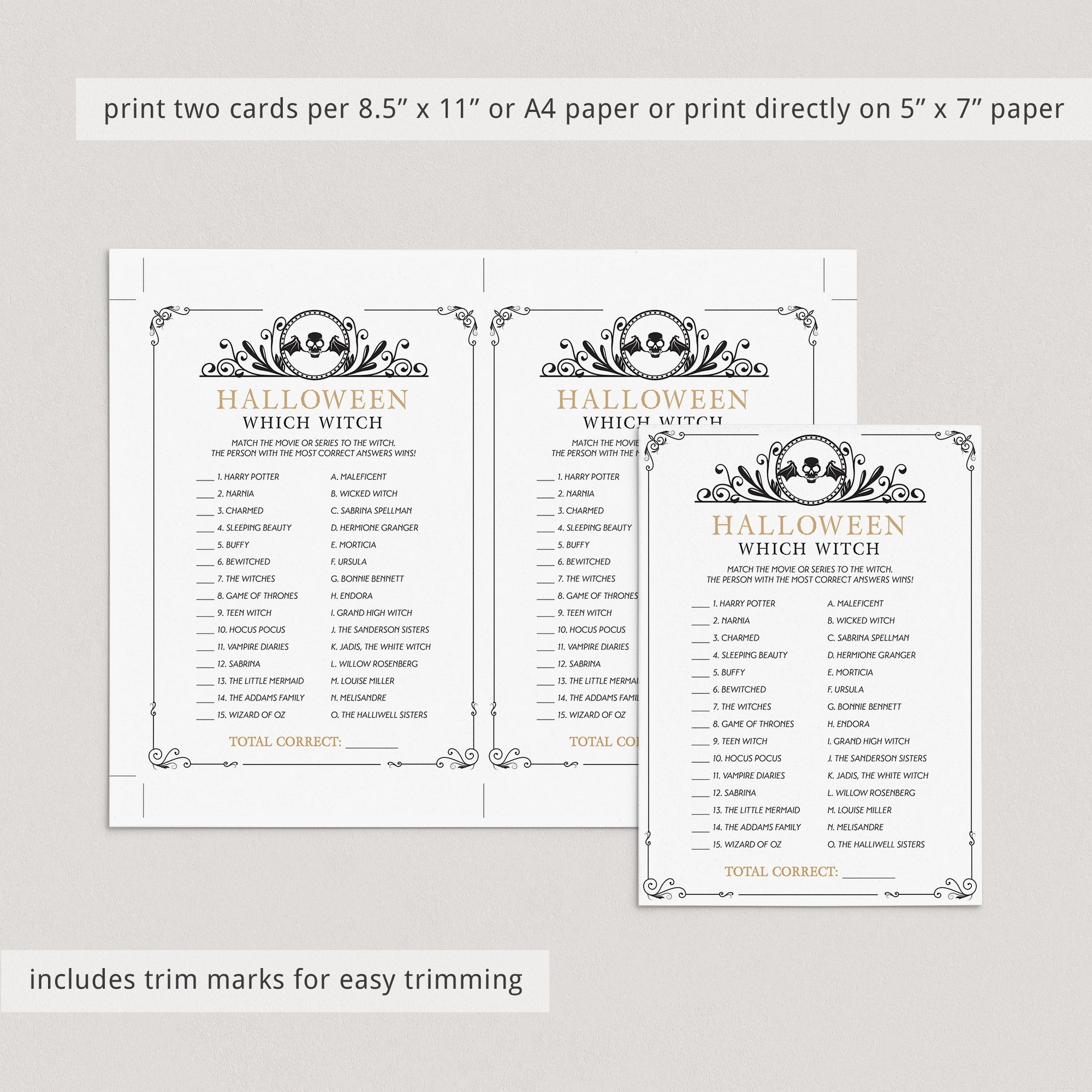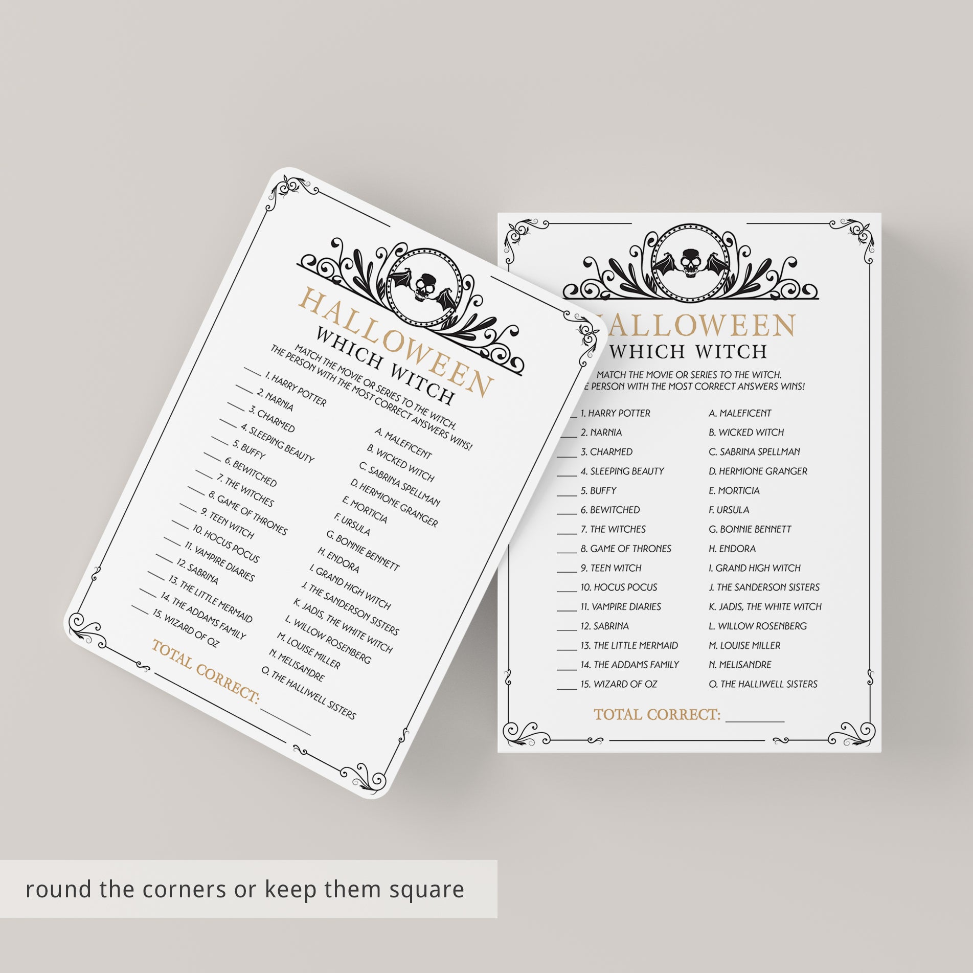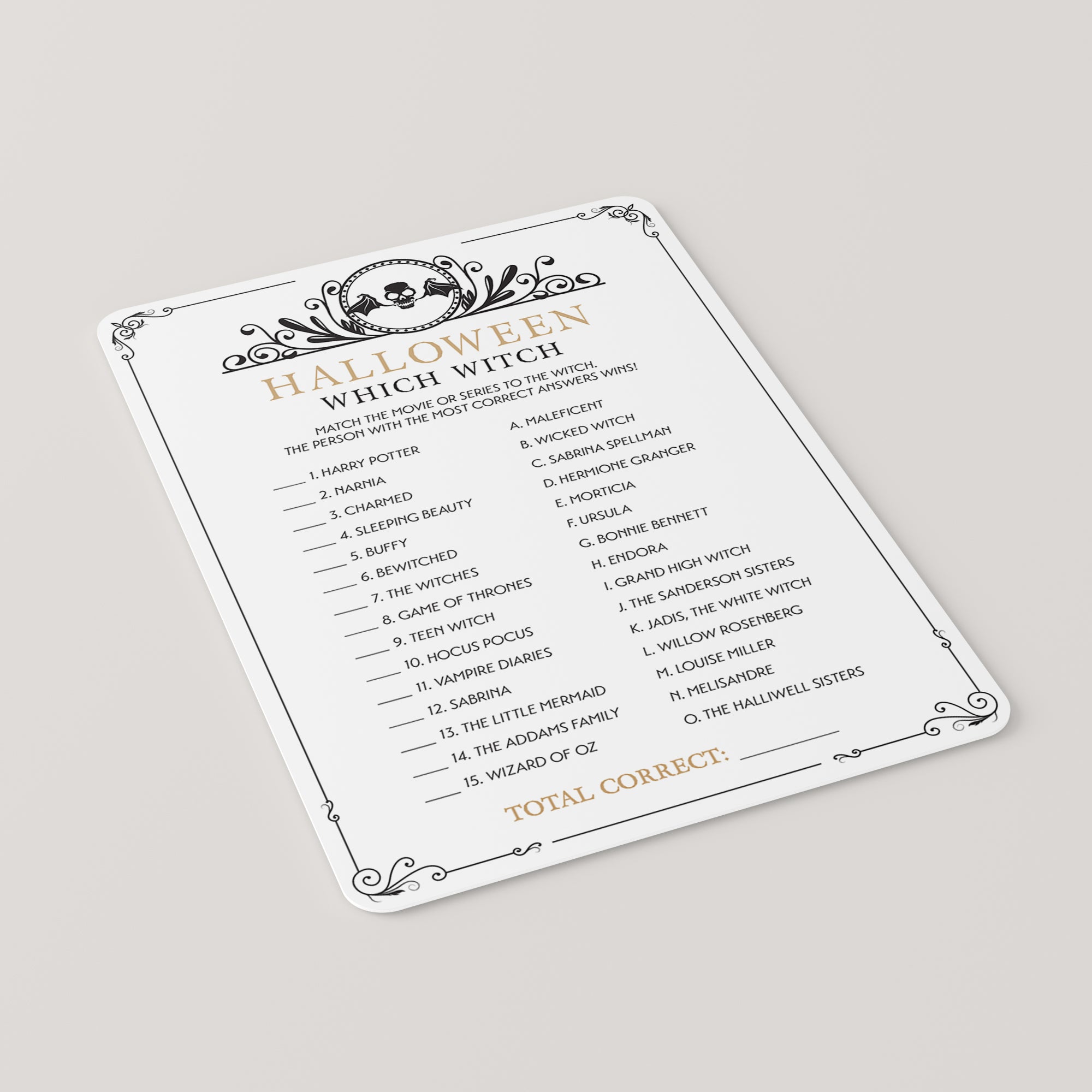 Are you hosting a Halloween bash? Use this vintage theme Halloween game with black skull to test your guests knowledge about witches. Match the movie or series to the witch. It’s a fun Halloween game to play at your Halloween office party or Halloween family night.