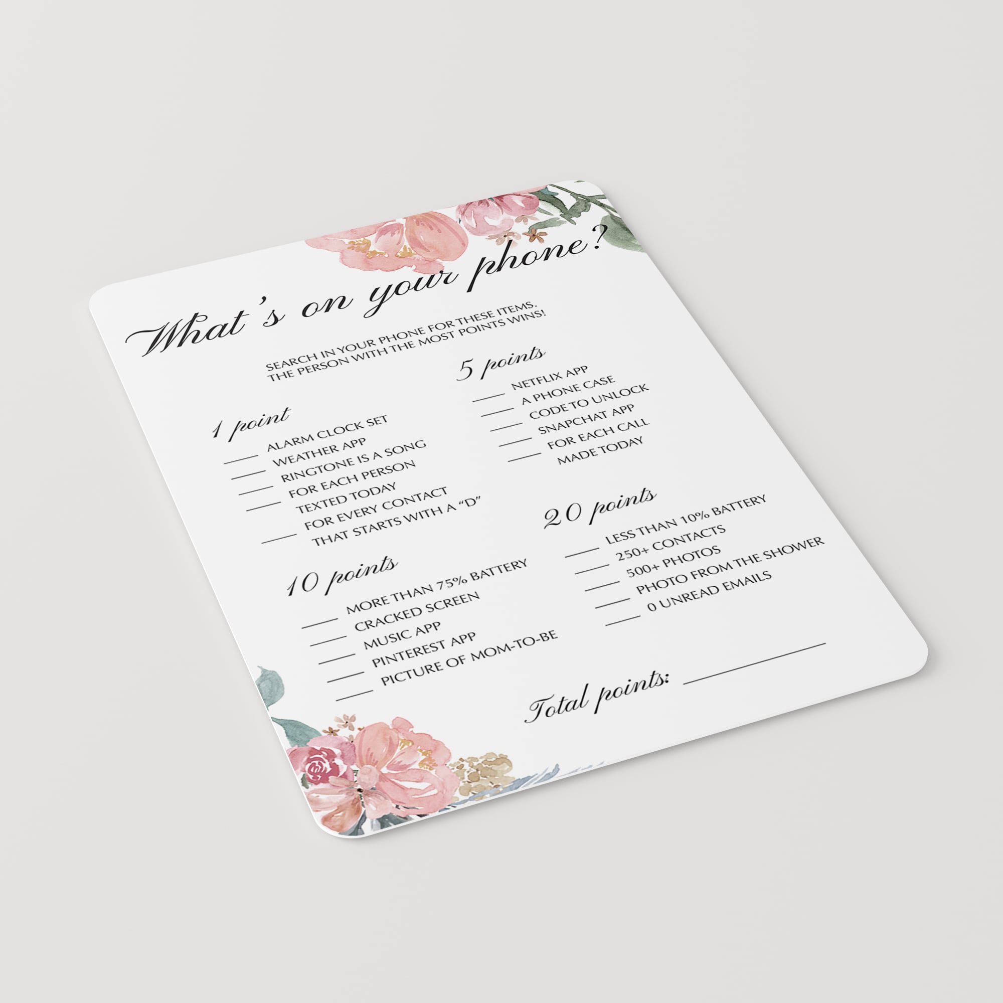 Bring your floral baby shower into the 21st century and entertain everyone with this fun icebreaker baby shower game What’s On Your Phone!