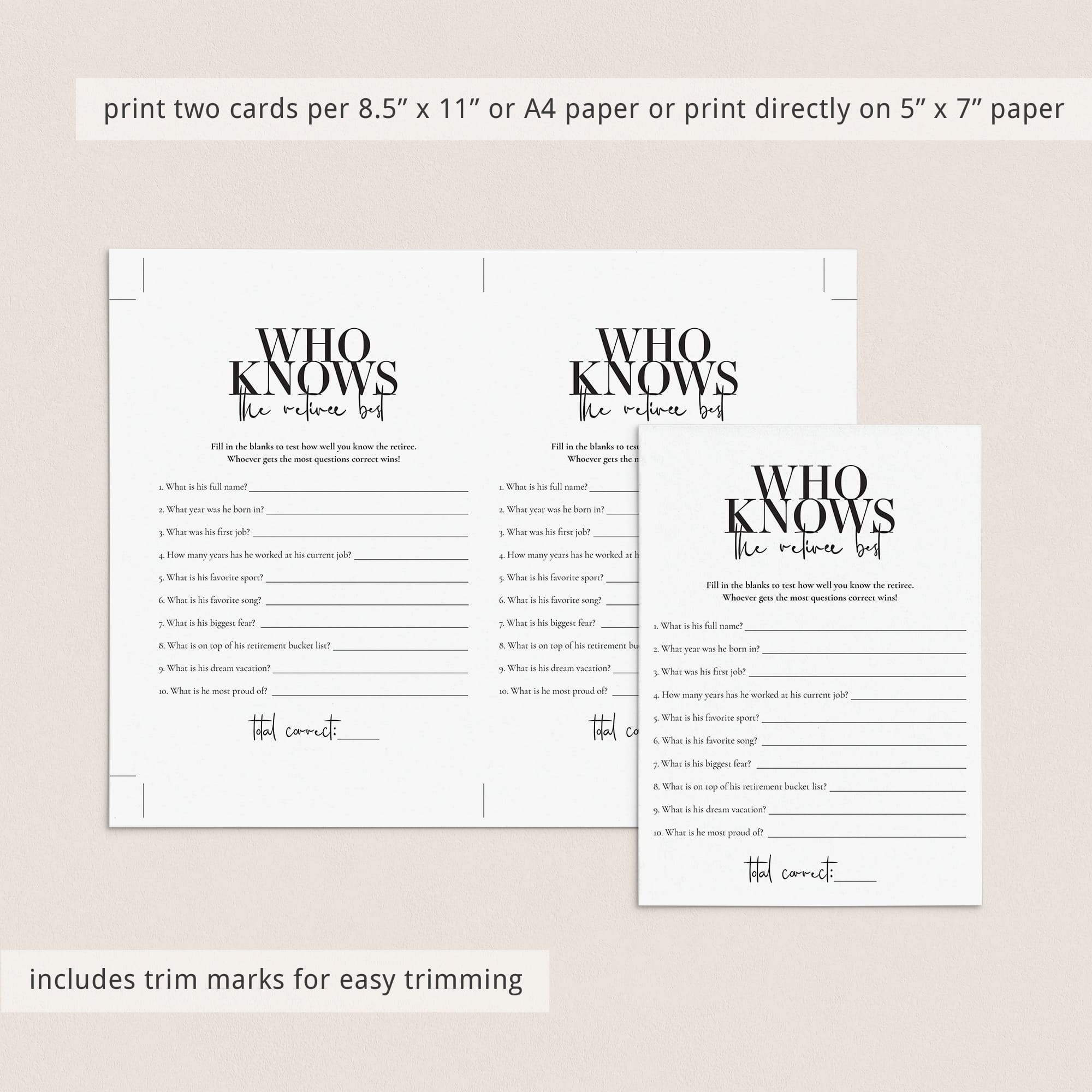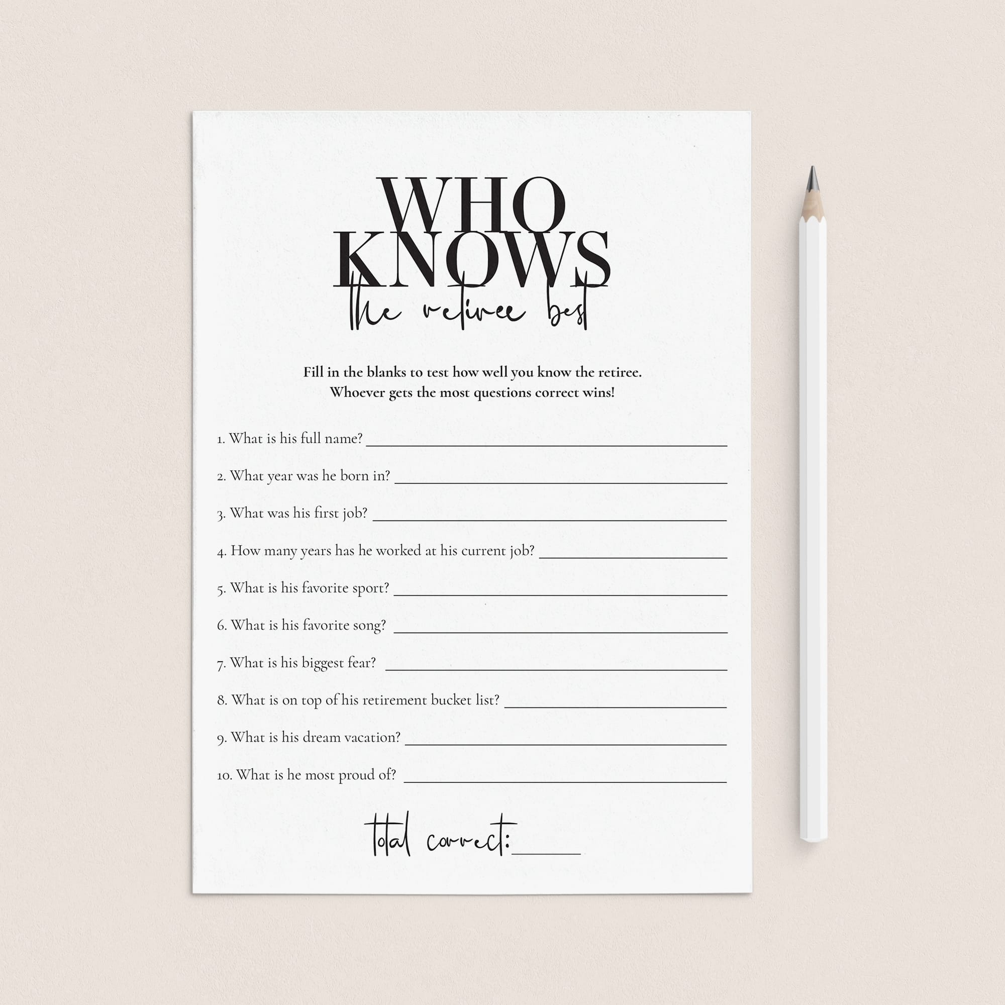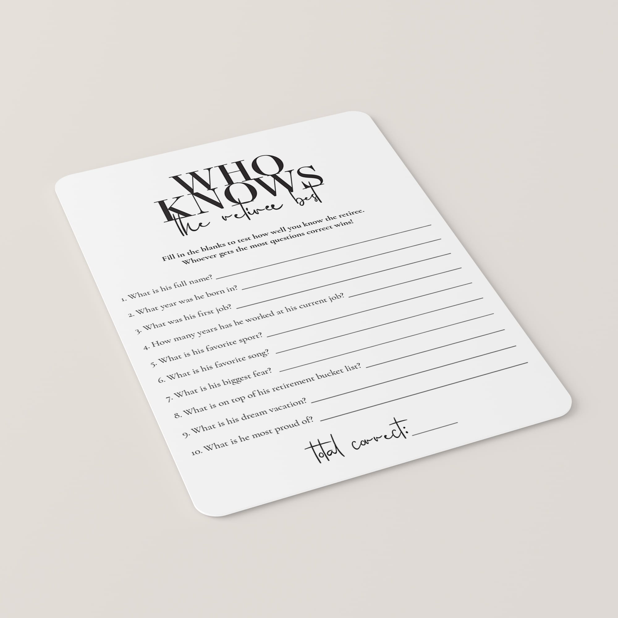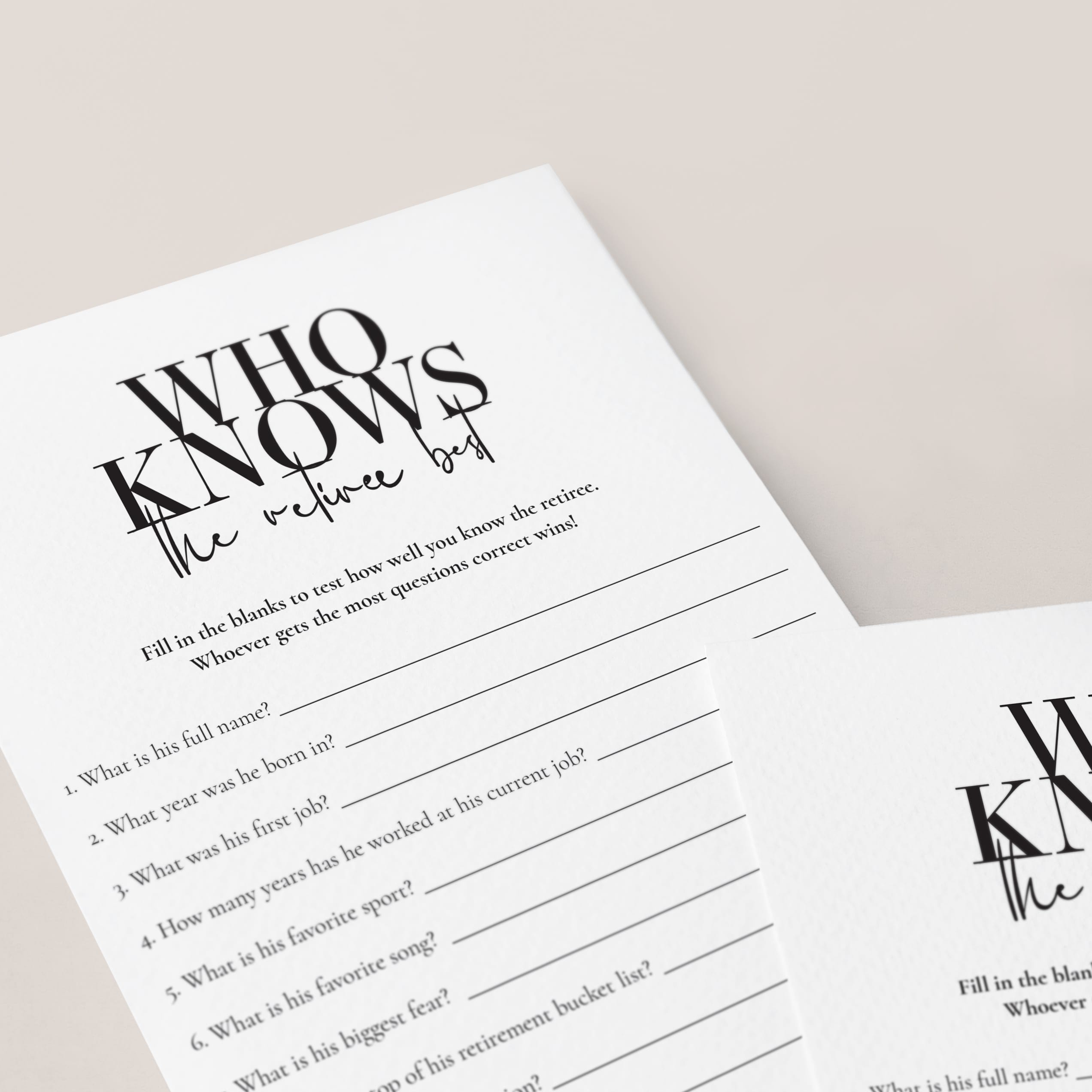 Test your retirement party guests how well they know the retiree and play 'Who knows the retiree best’ with this modern black and white retirement party game for him. This retirement party game is a great... Read more