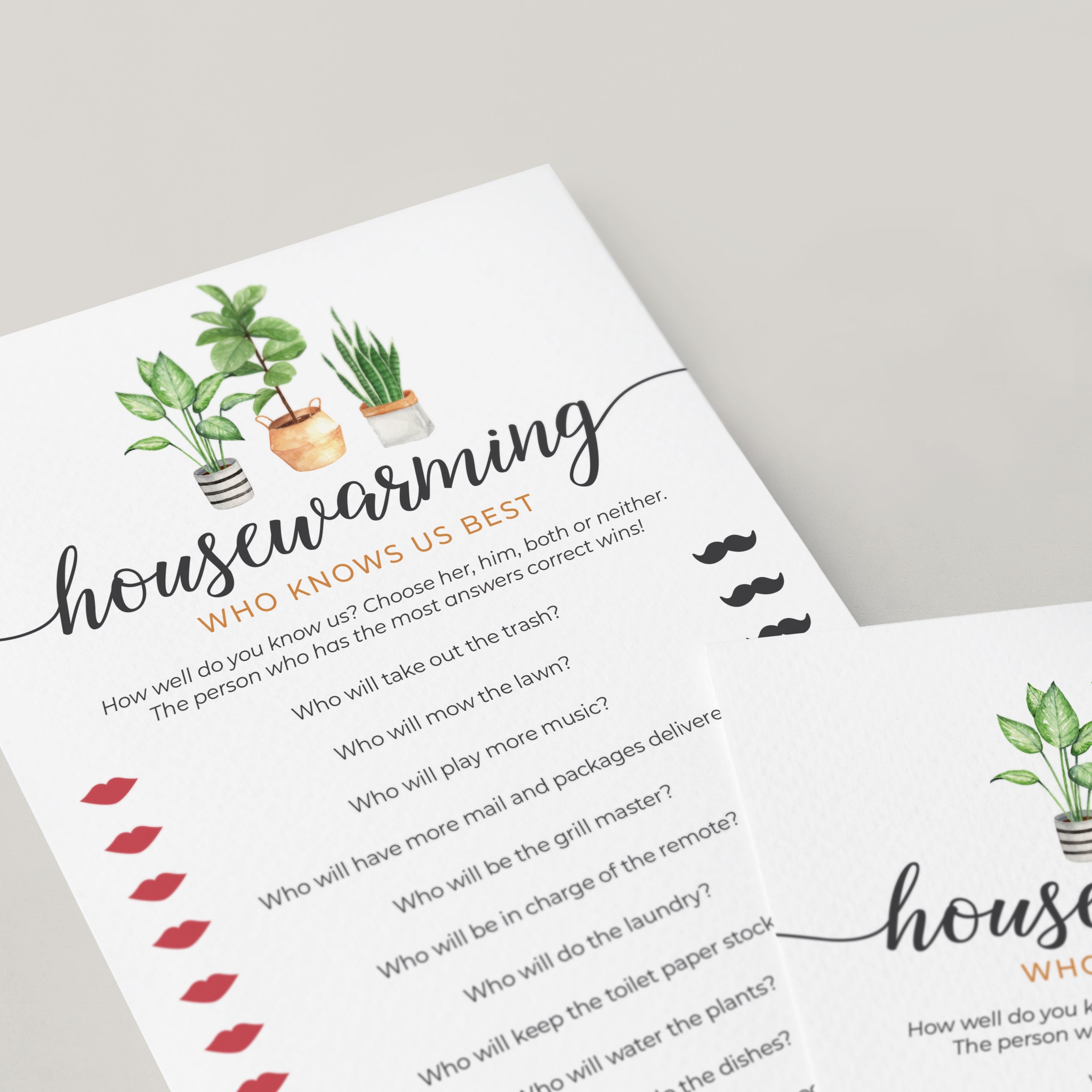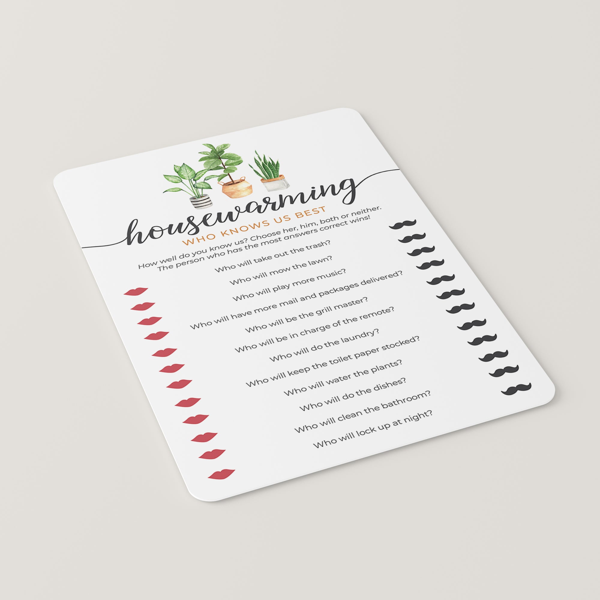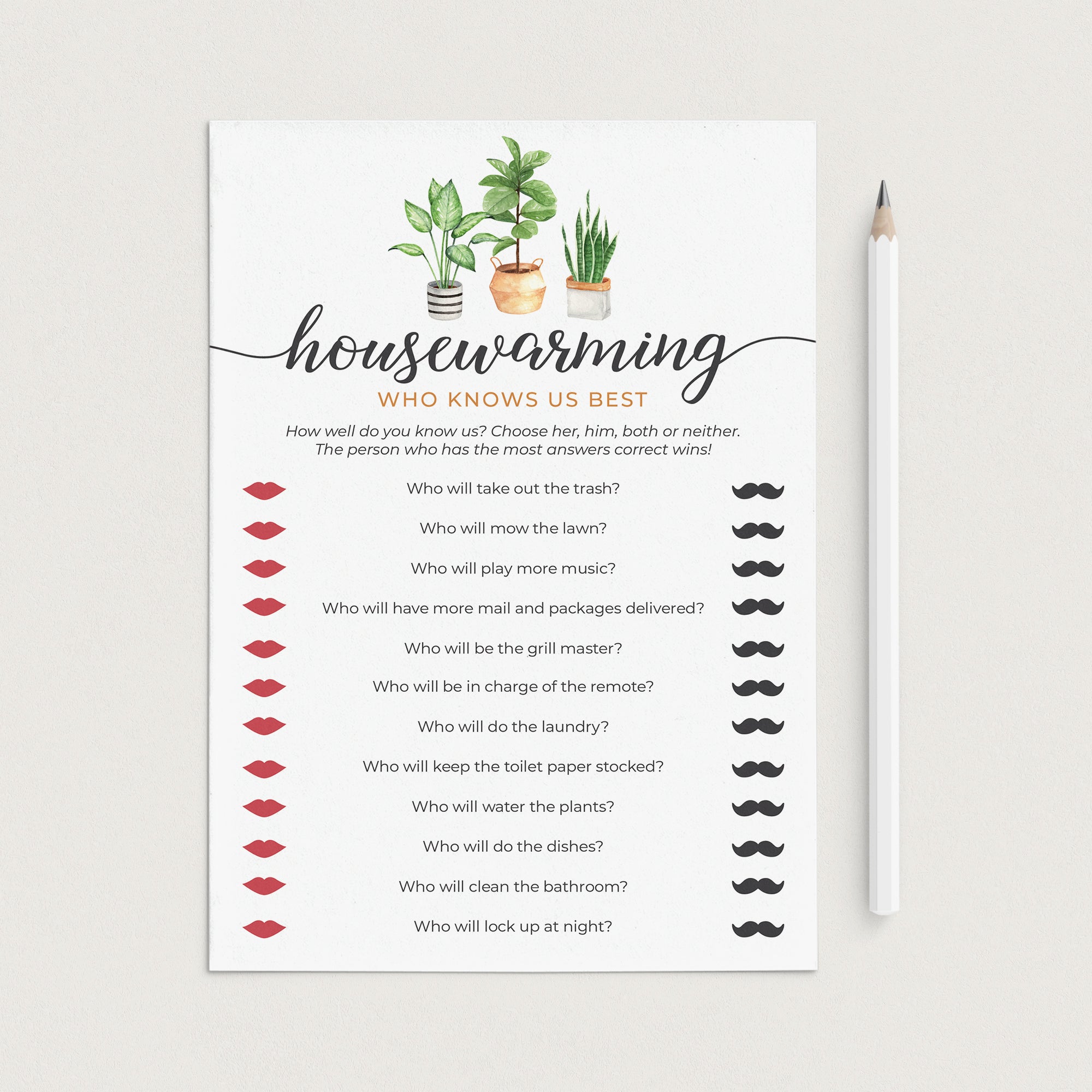Add some fun to your (First) Housewarming Party with this Who Knows Us Best quiz. The game with calligraphy script and watercolor house plants will fit any Housewarming Party theme.