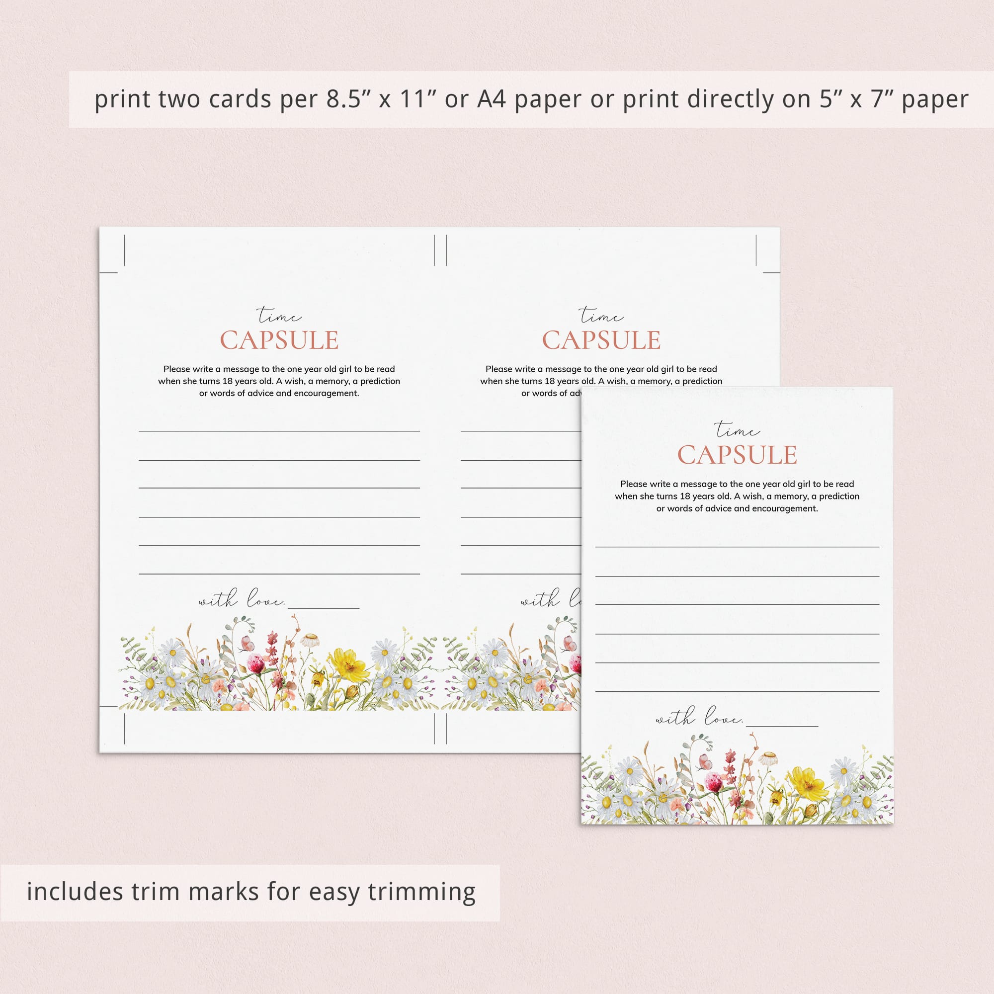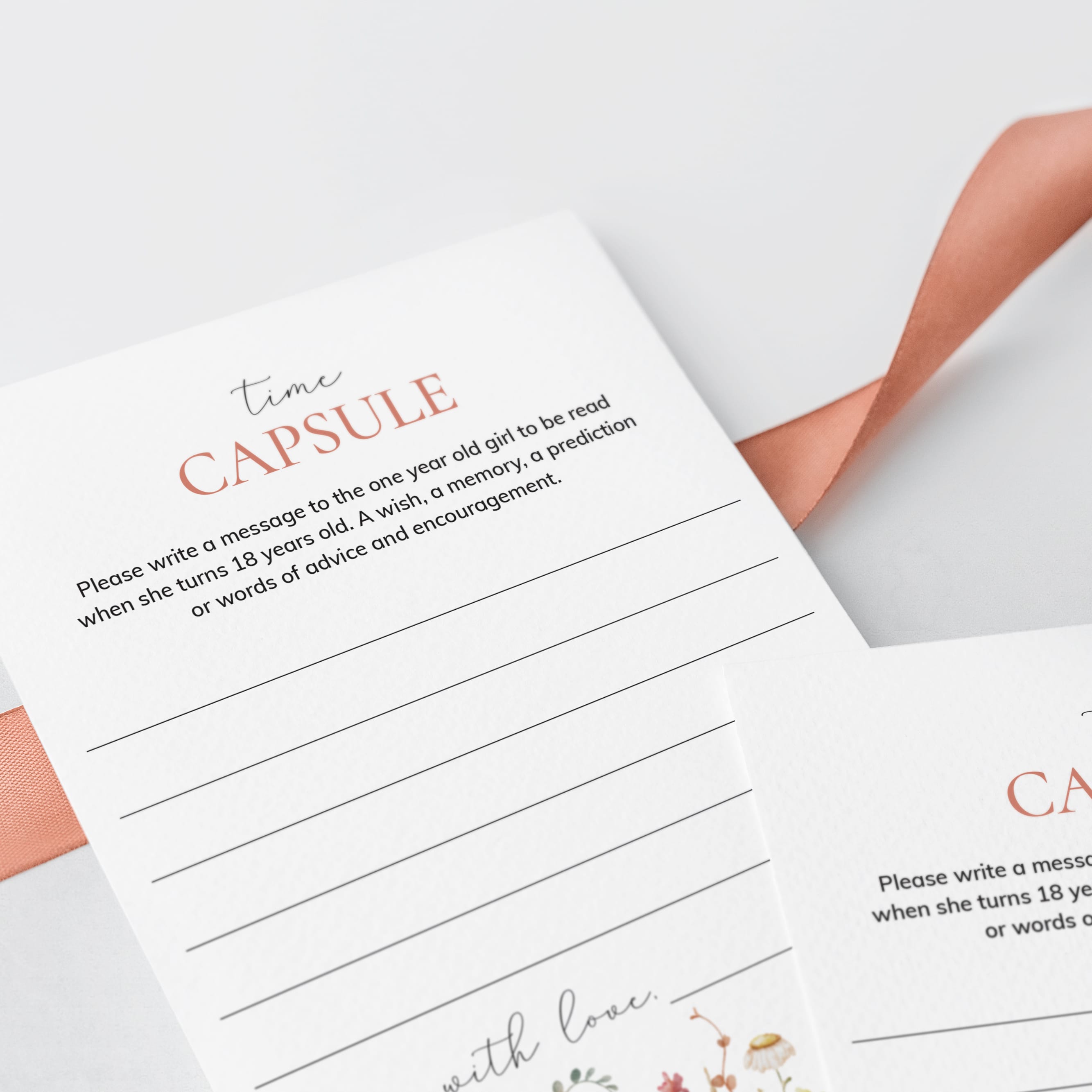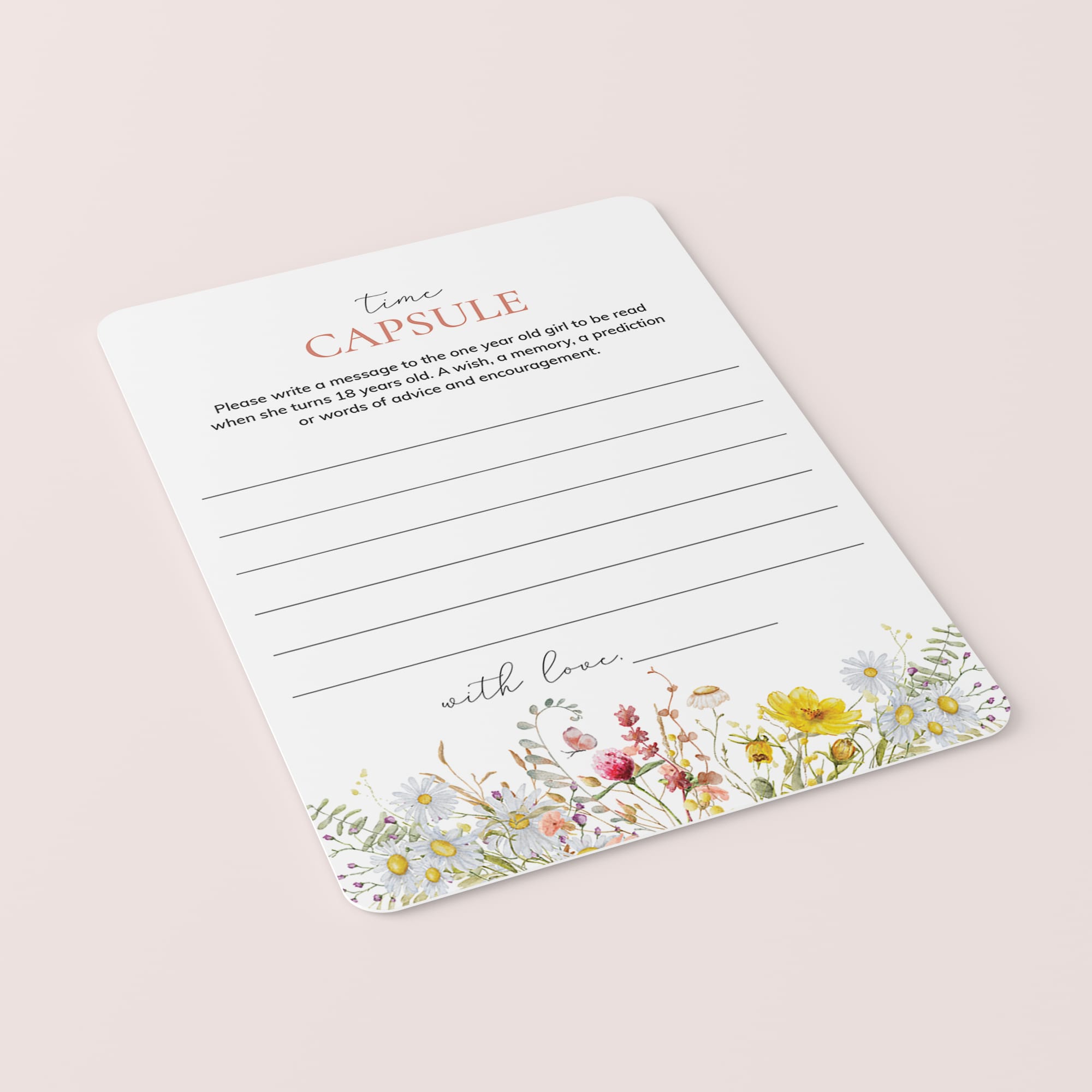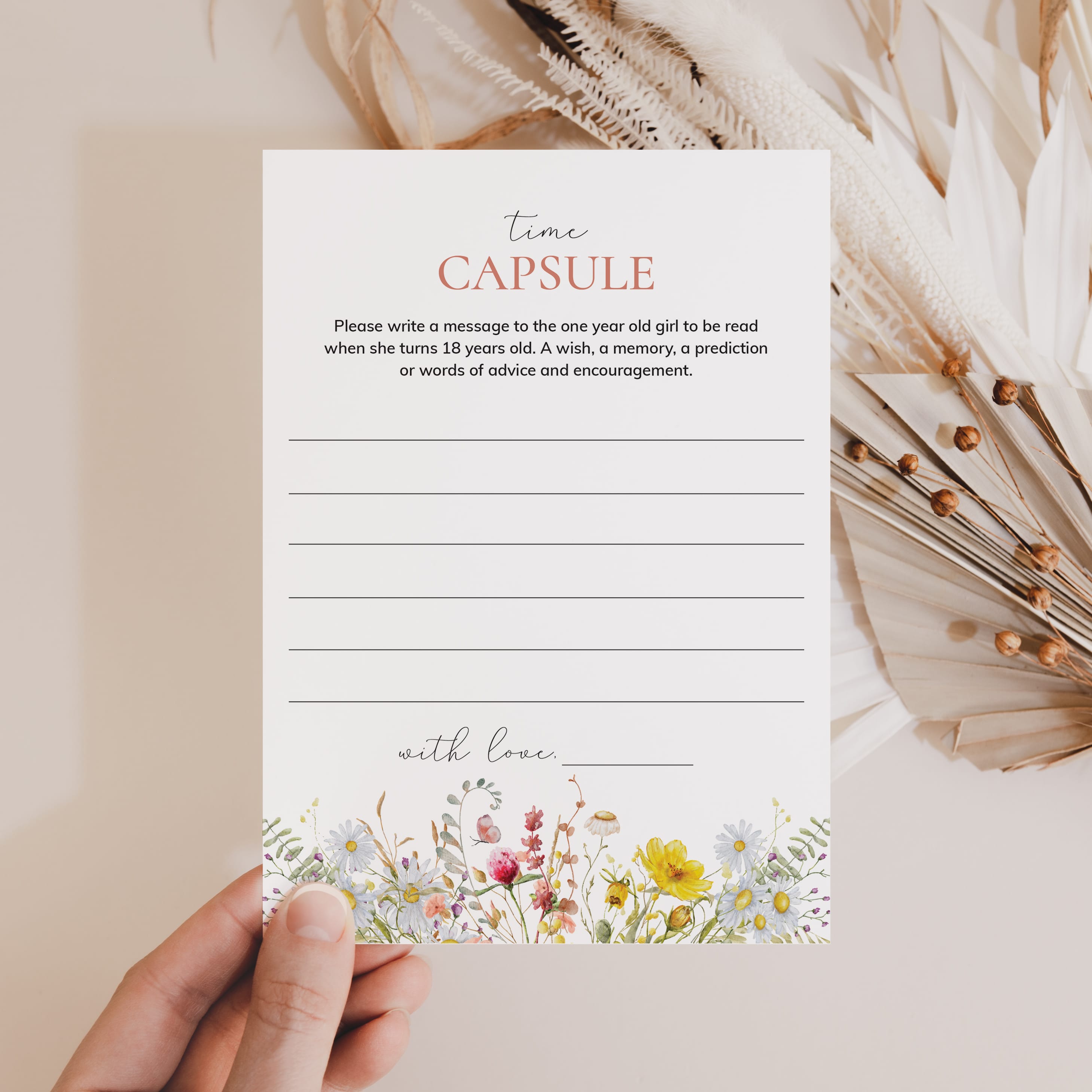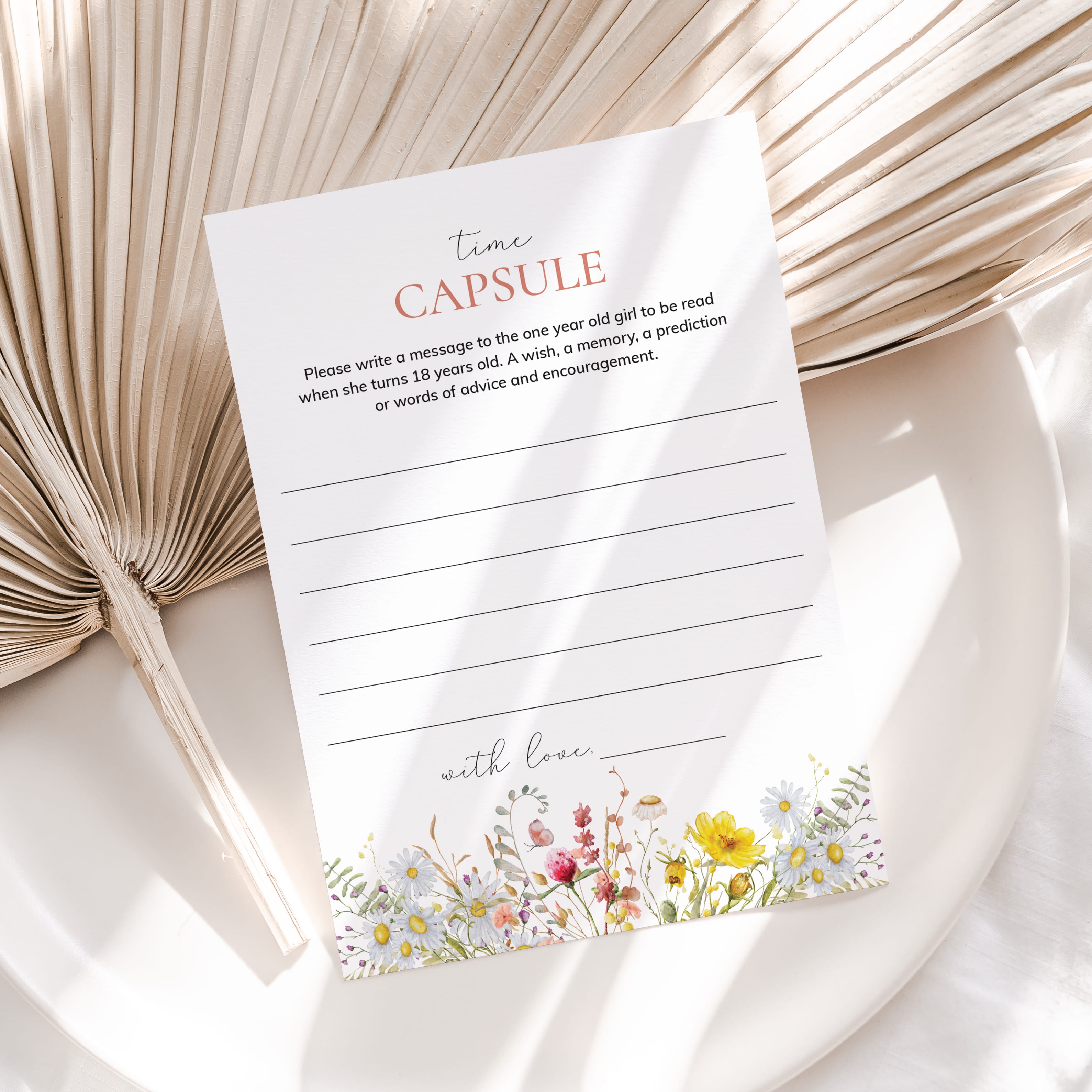 Are you looking for a meaningful keepsake for your baby girls' first birthday party? Have your guests leave a special message for your daughter to open on her 18th birthday. These beautiful wildflower Time Capsule cards will make a sweet and sentimental first birthday activity that makes a lasting keepsake for your little one.