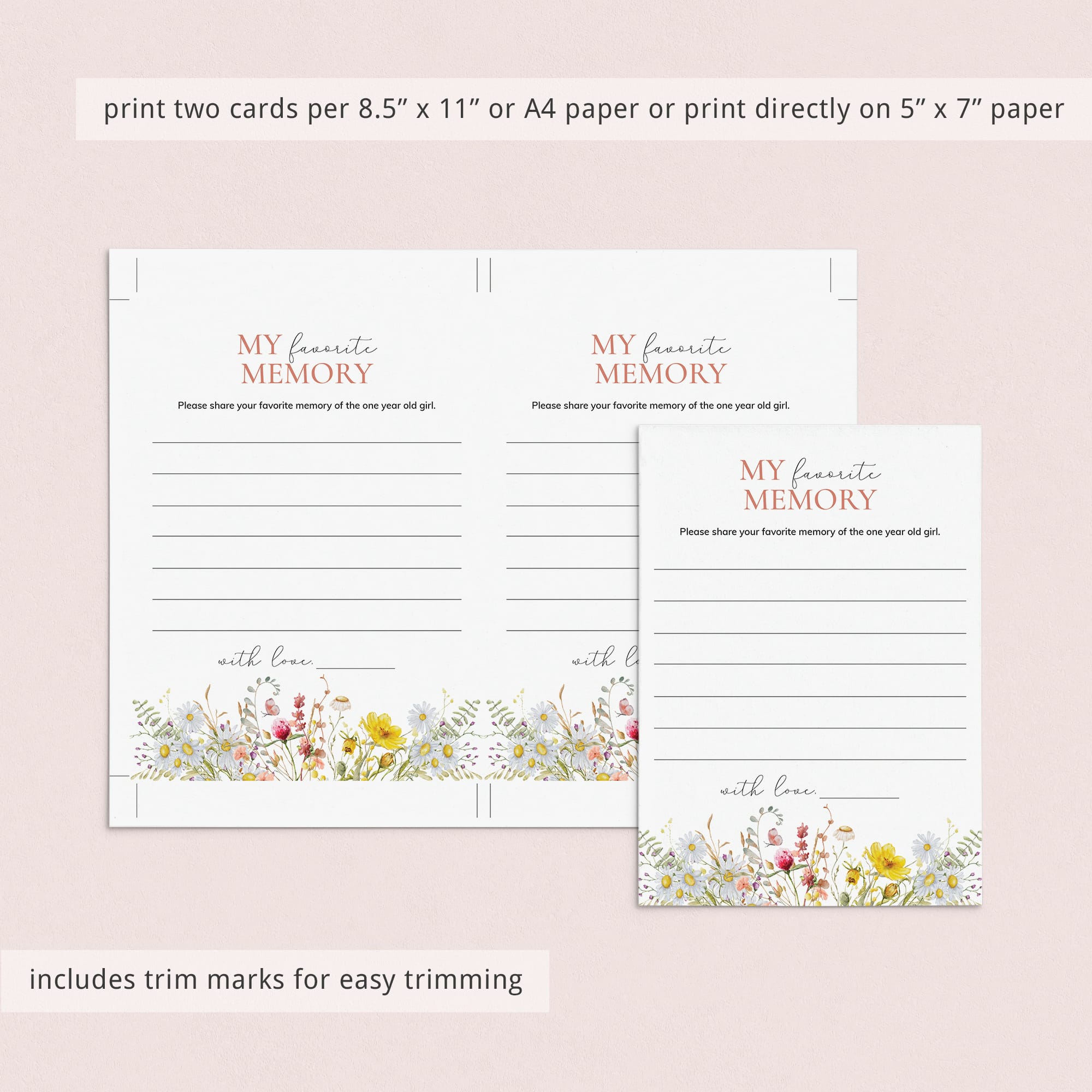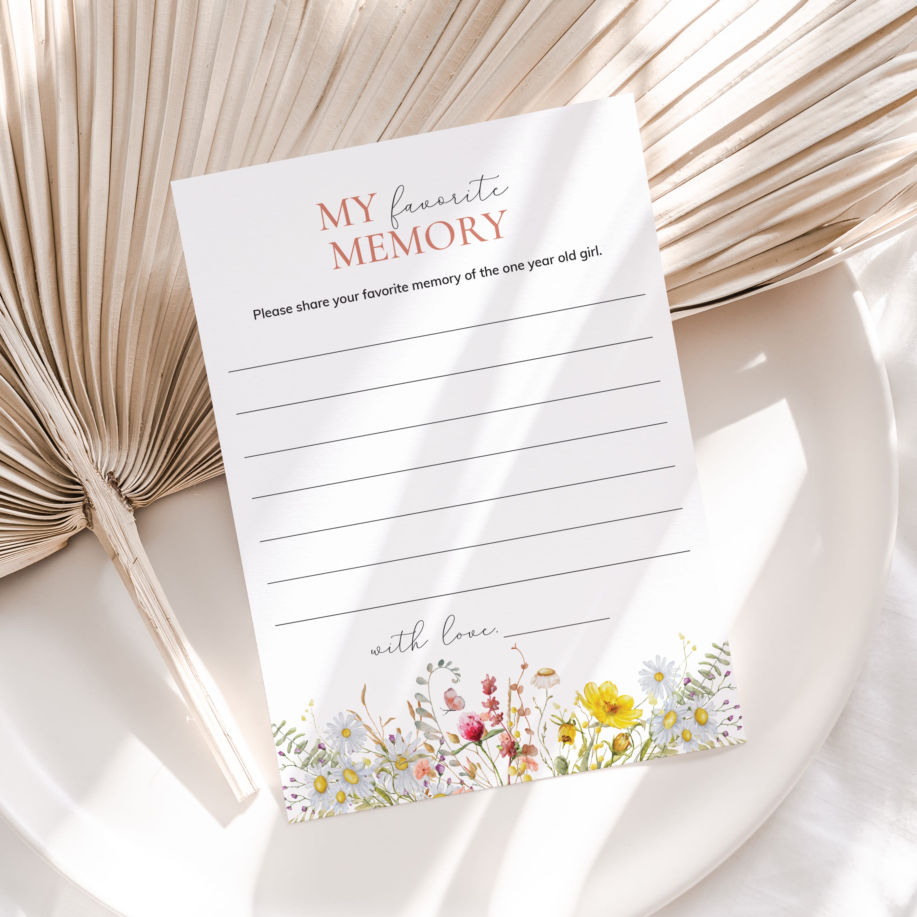 Are you looking for a memorable ice breaker game and keepsake for your girl's first birthday party? Have your guests share their Favorite Memory of The One Year Old Girl with these gorgeous birthday memory cards with watercolor wildflowers. It's the perfect addition to any baby girl's first birthday party and it's sure to be a hit!