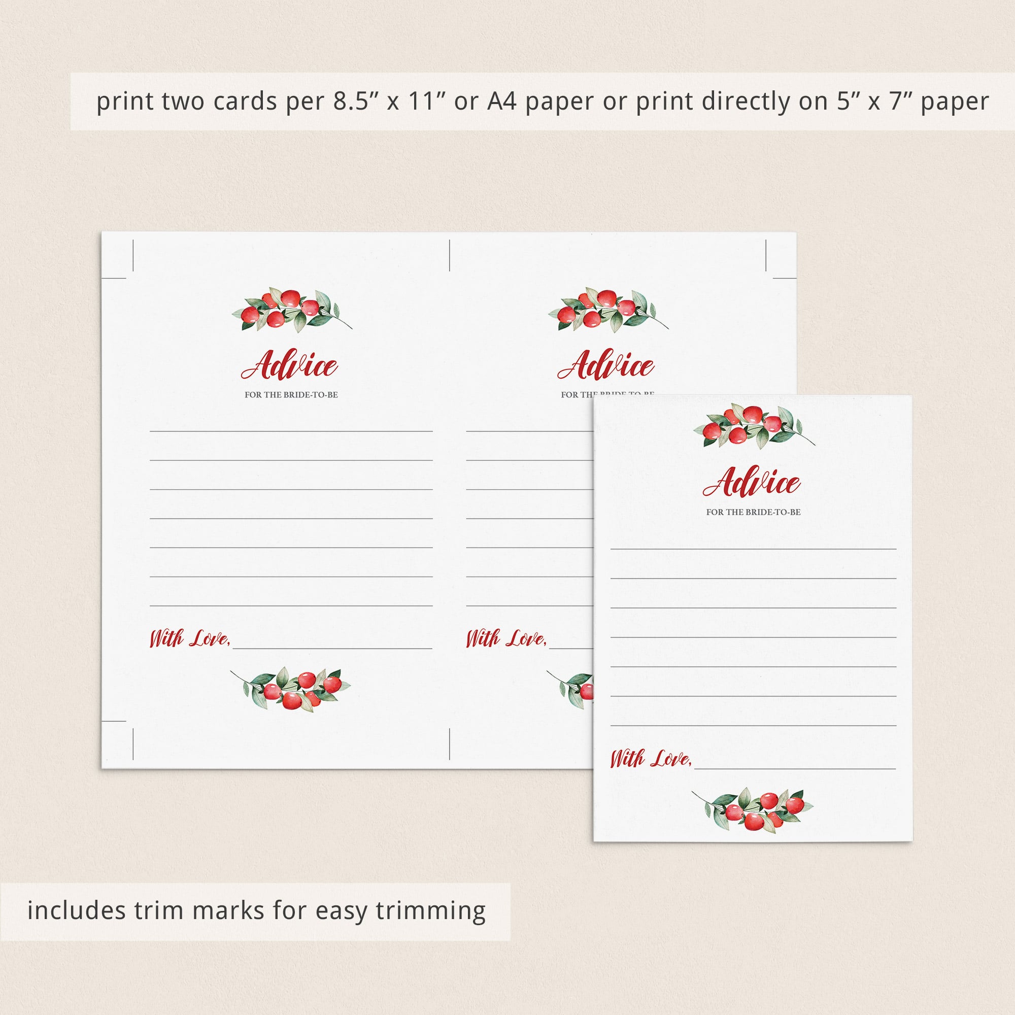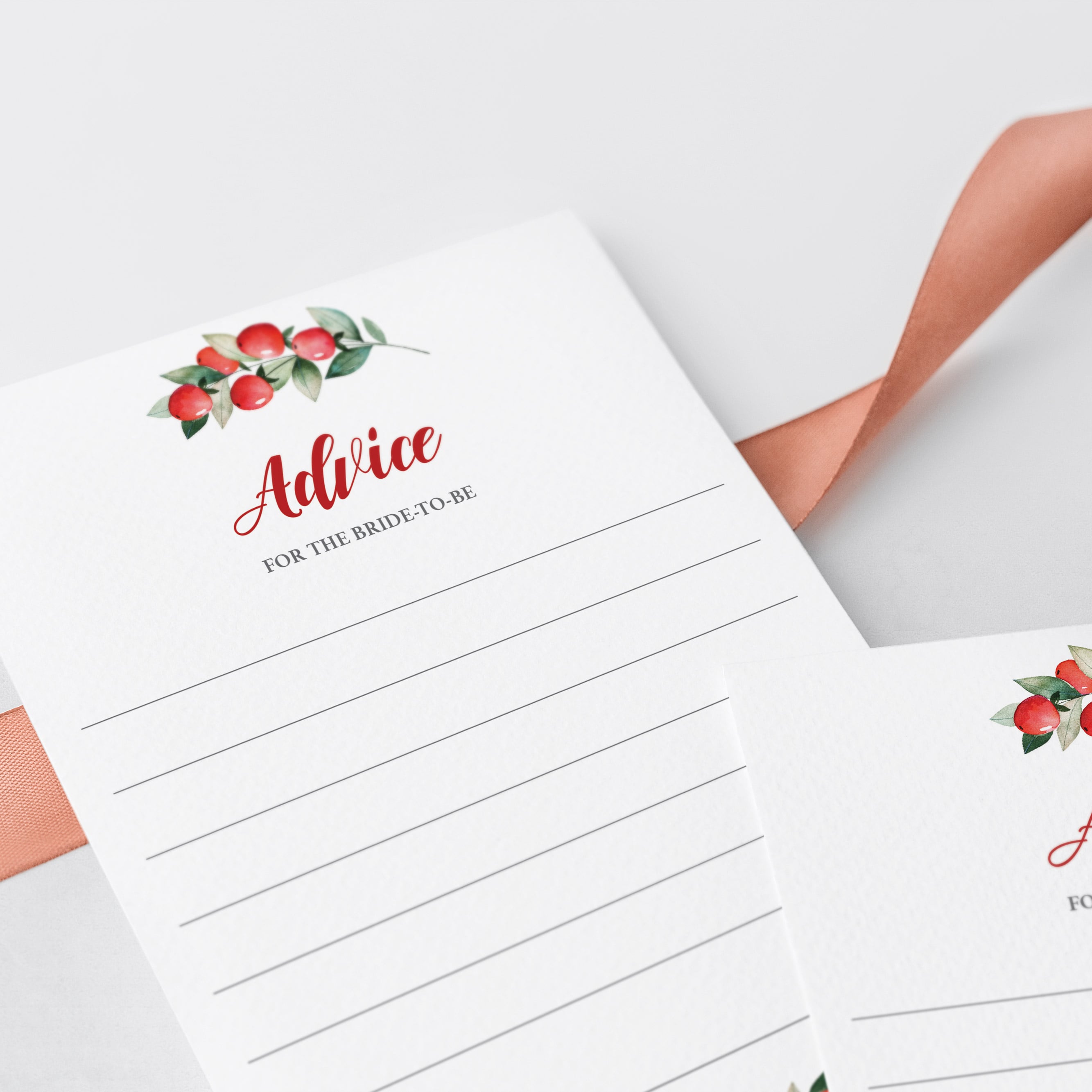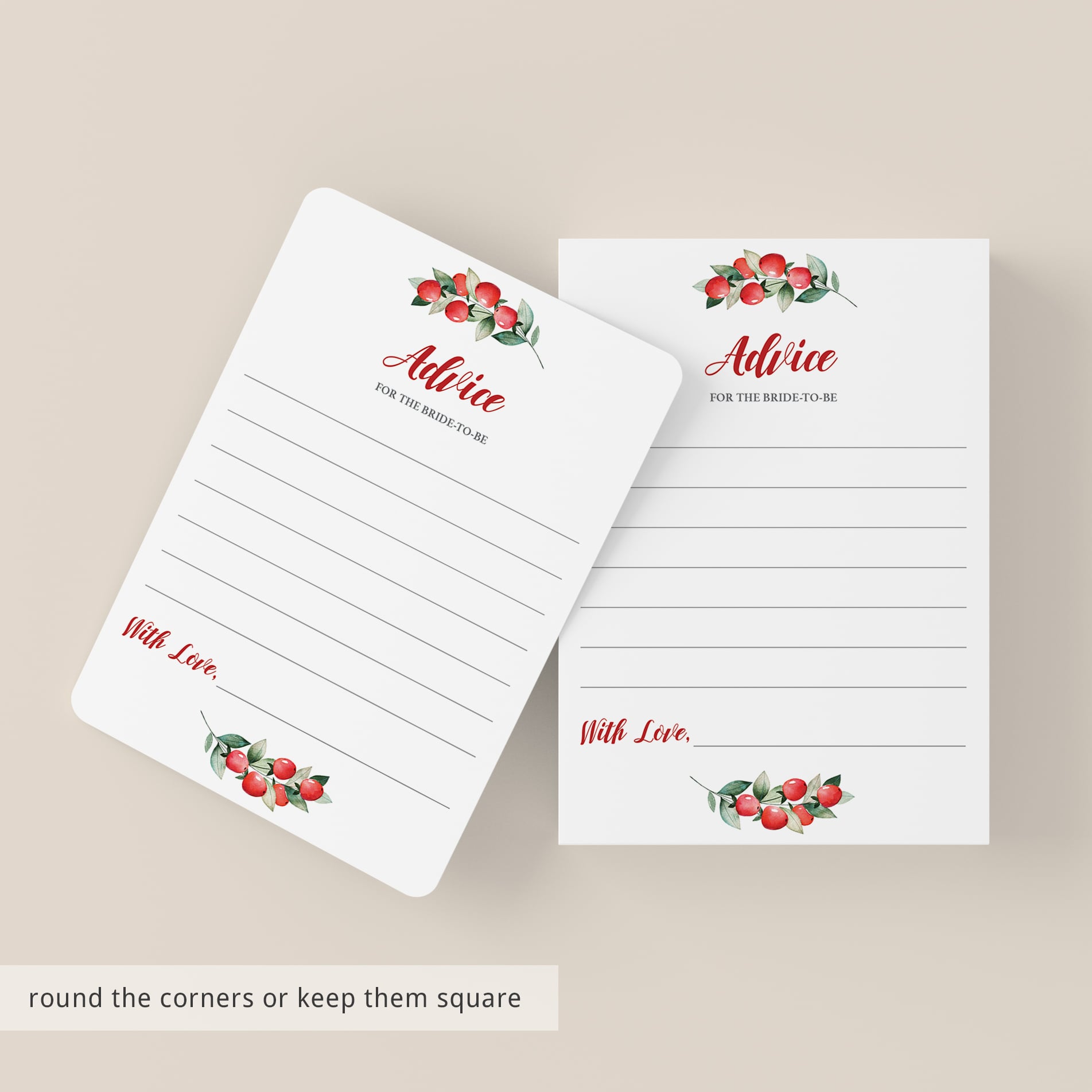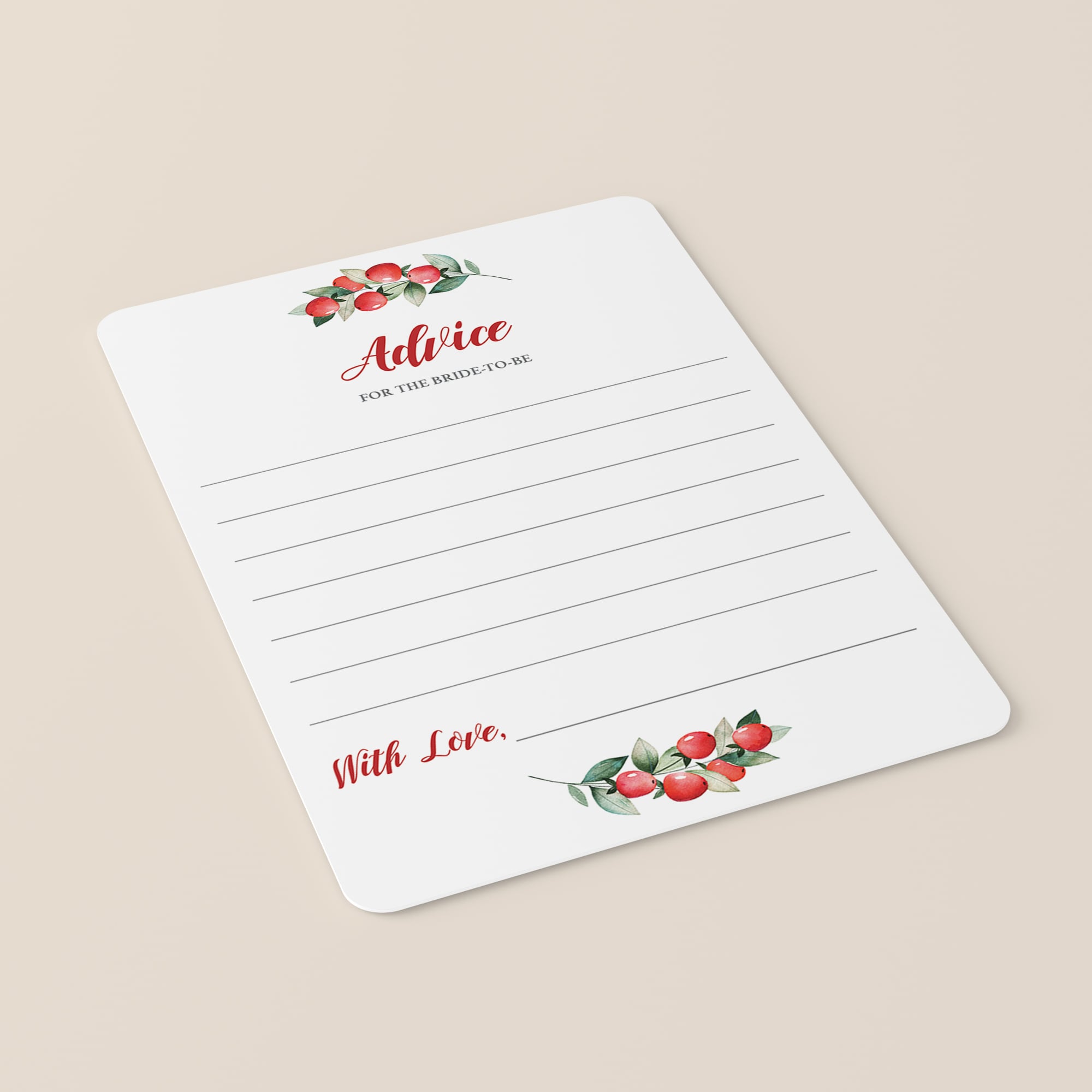 Create a meaningful keepsake for the bride-to-be with this winter bridal shower advice card with red berries and greenery. It's the perfect addition to a Christmas themed bridal shower. Let every guest write down their advice for the new bride and collect the cards for the lucky soon-to-be-Mrs.