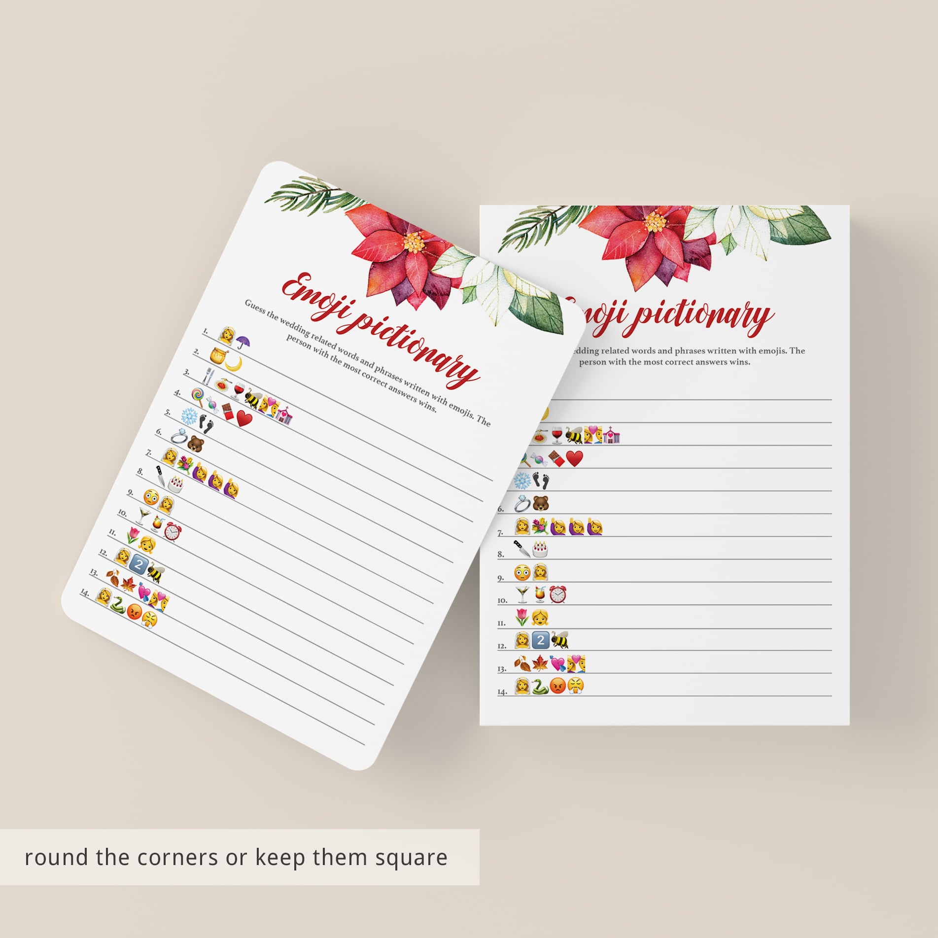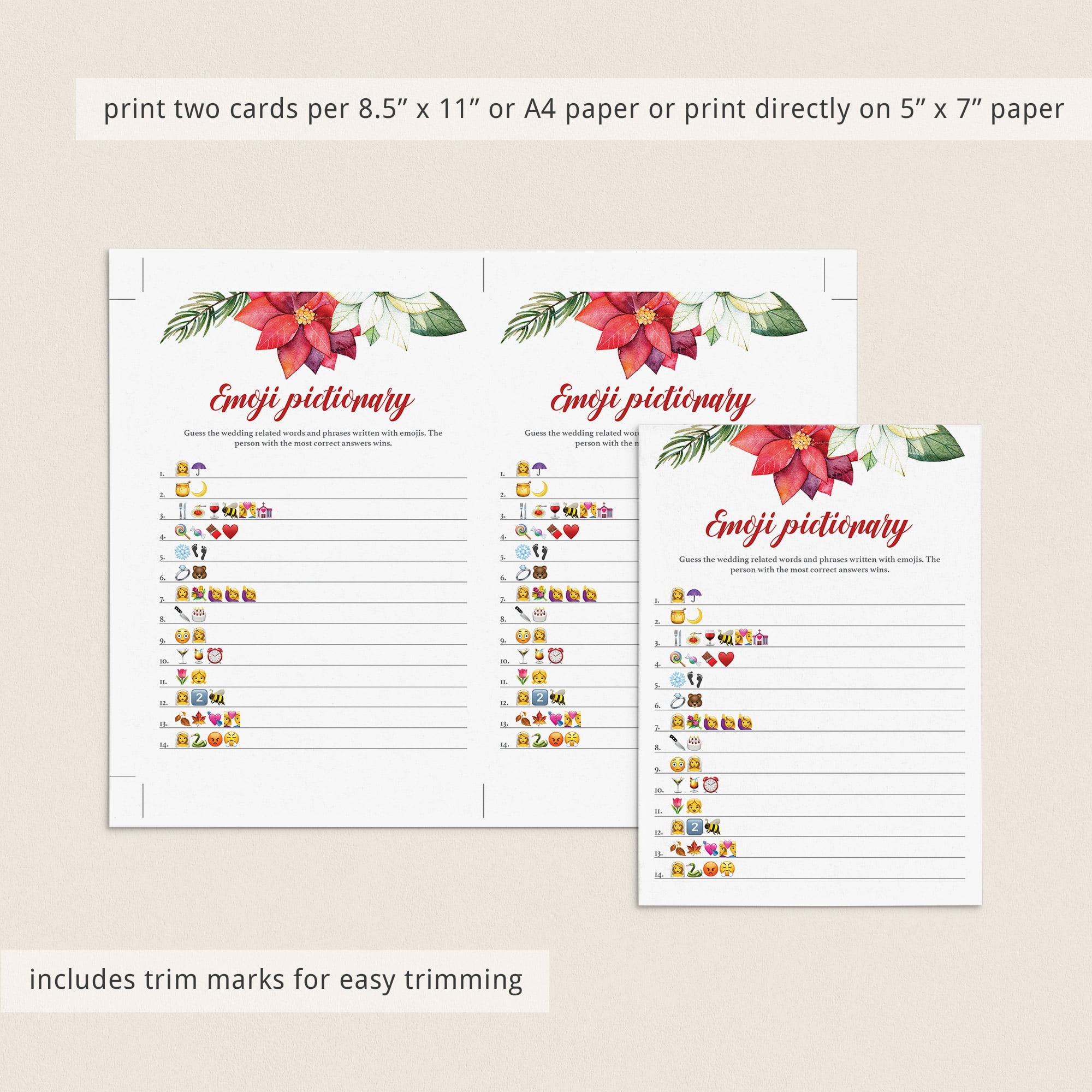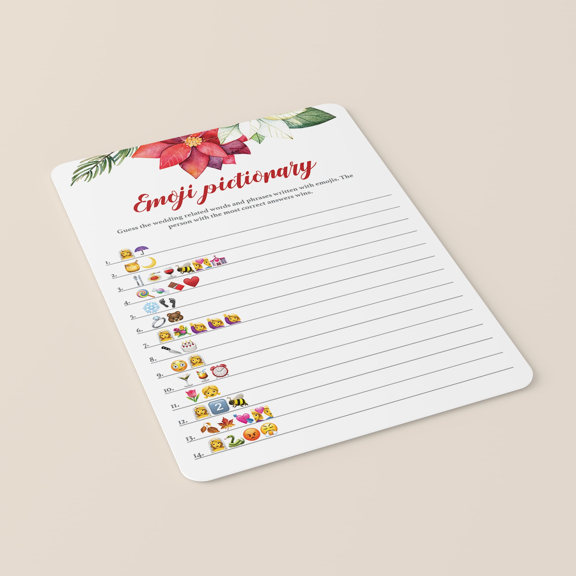 Are you looking for a unique game to play at your winter bridal shower? Play Emoji Pictionary with these beautiful winter floral game cards. The red and white flowers and green leaves will ensure that you have those special winter vibes at your party.