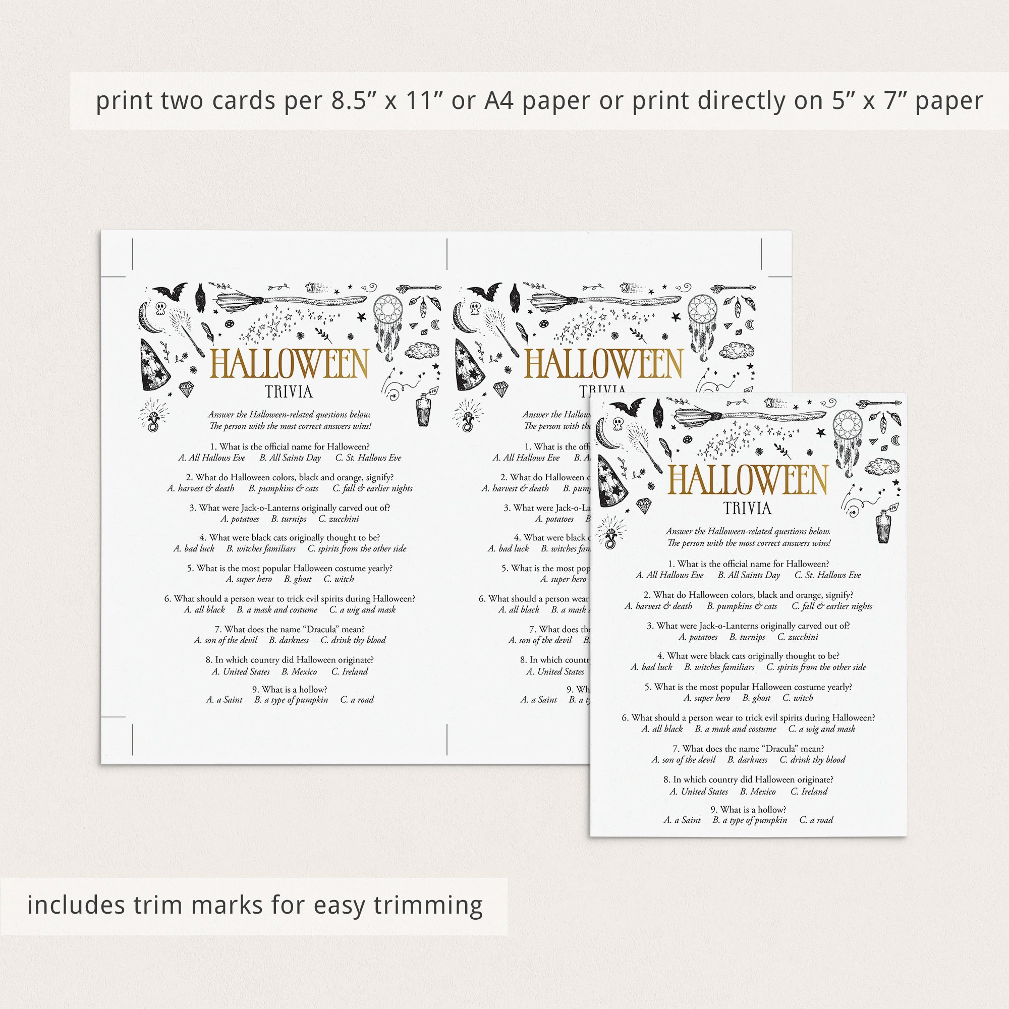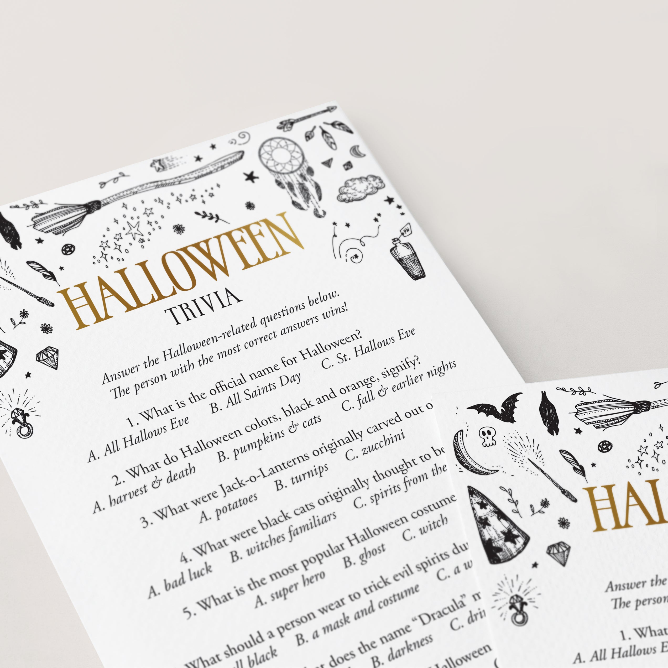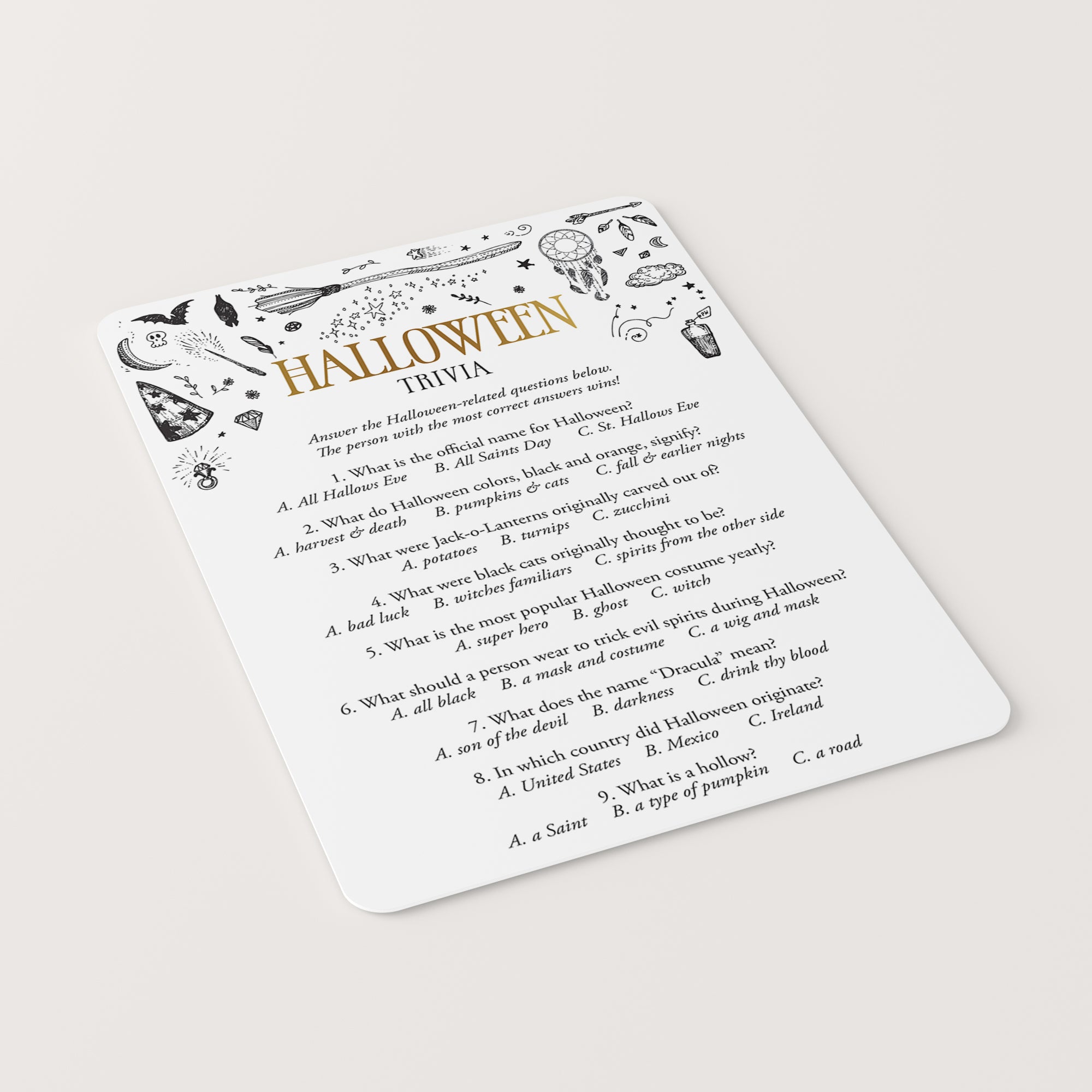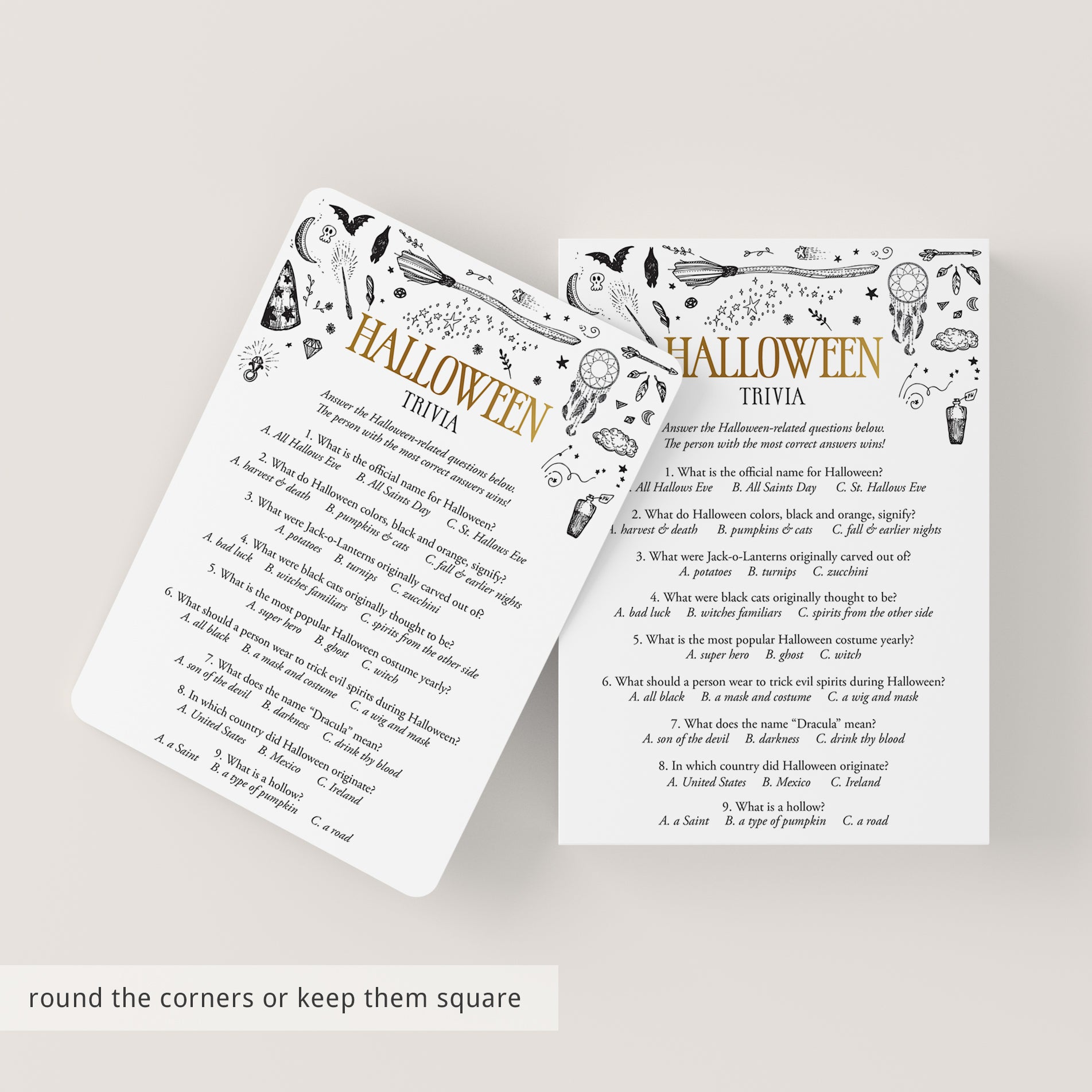 Are you hosting a Witchy Halloween party? Use this black and gold witchcraft Halloween Trivia Quiz to test your guests Halloween knowledge. What is the most popular Halloween costume? And what do the Halloween colors, orange and black, signify? Play this fun Halloween trivia game to find out! It’s a great challenging Halloween game to play at your Halloween office party or Halloween family night.