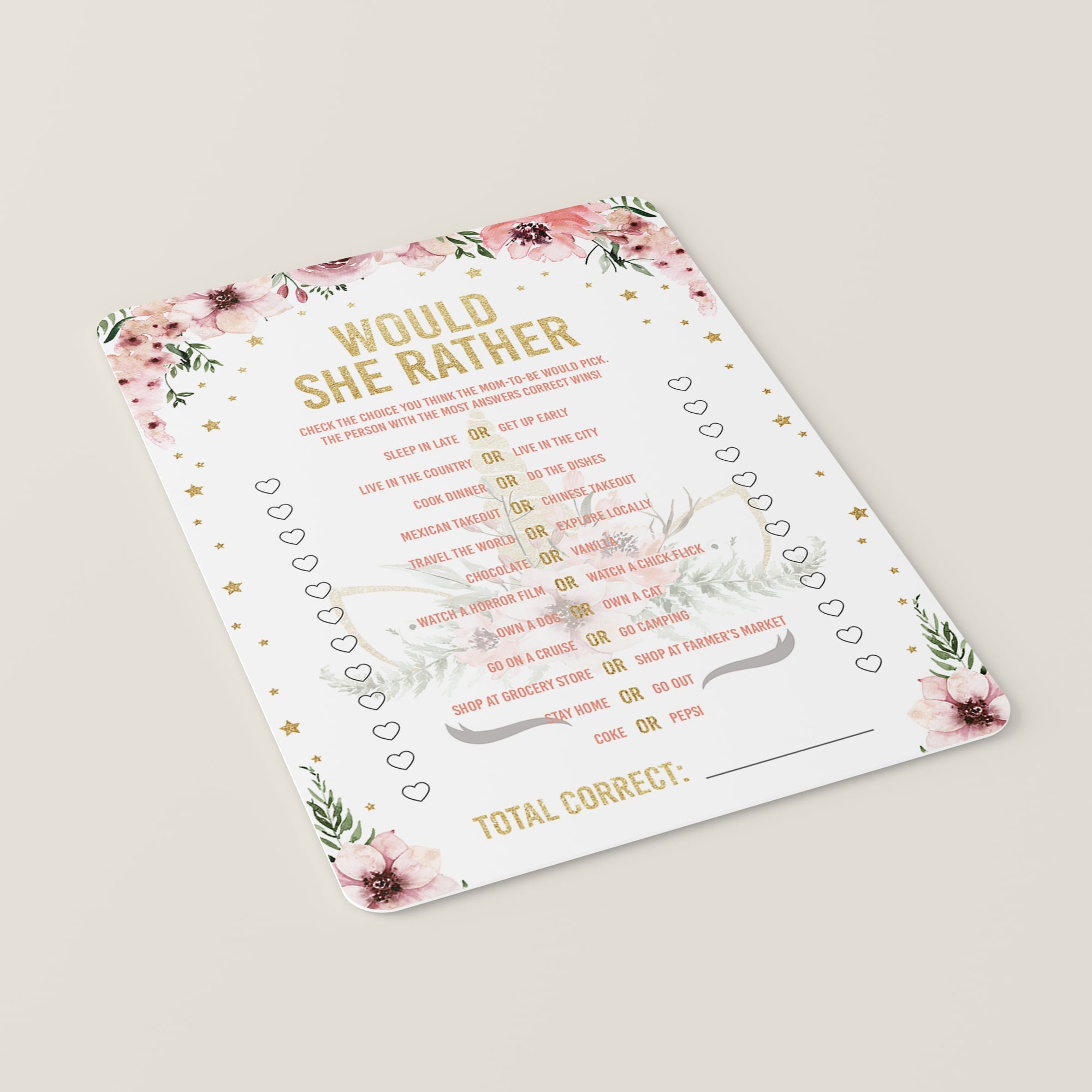Pink floral baby shower game card would she rather printable by LittleSizzle