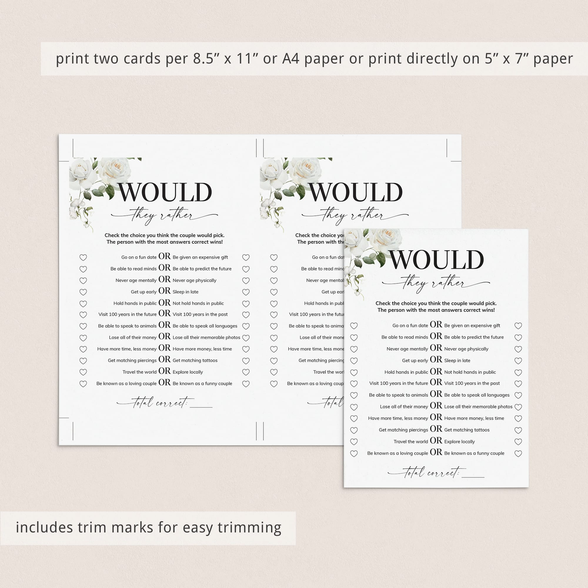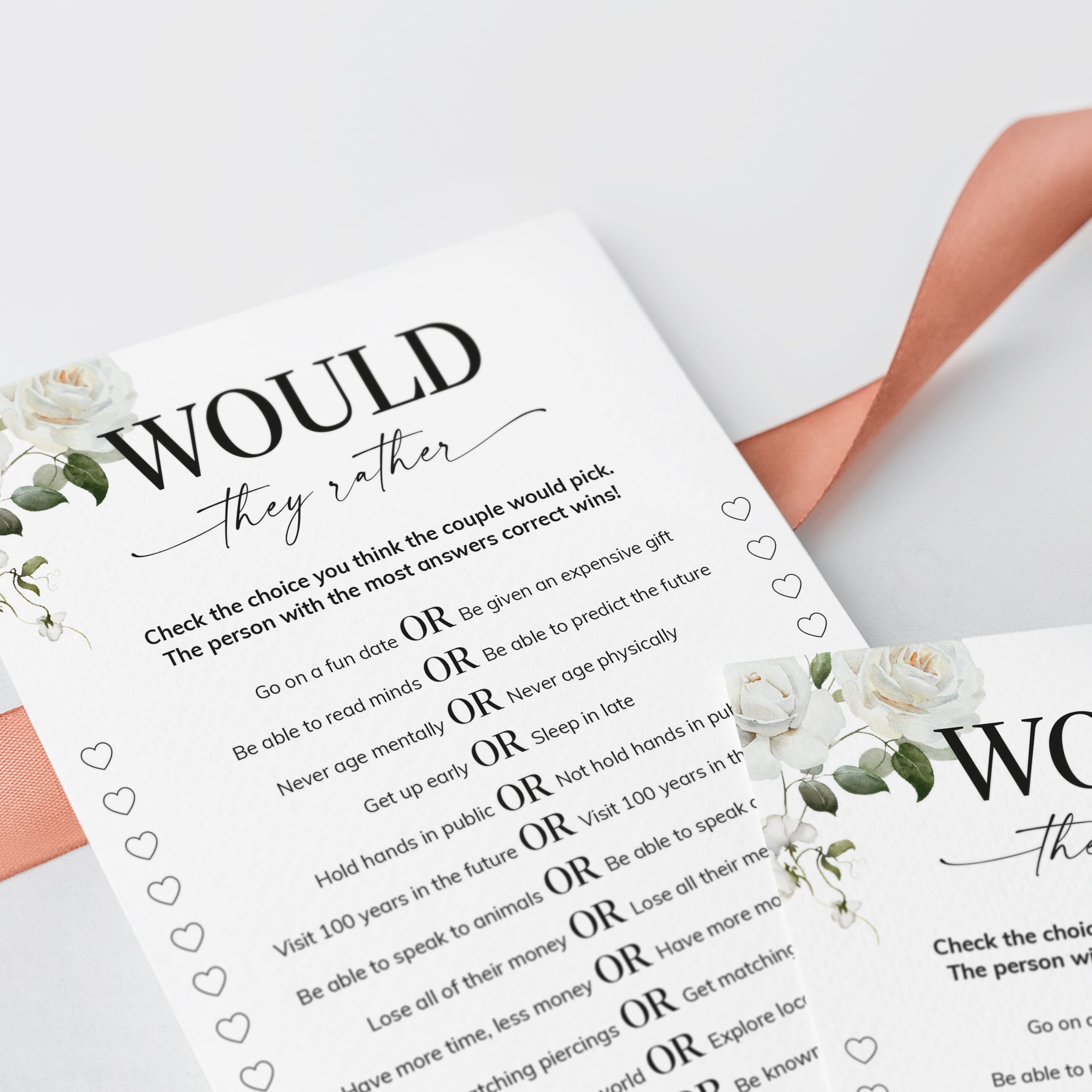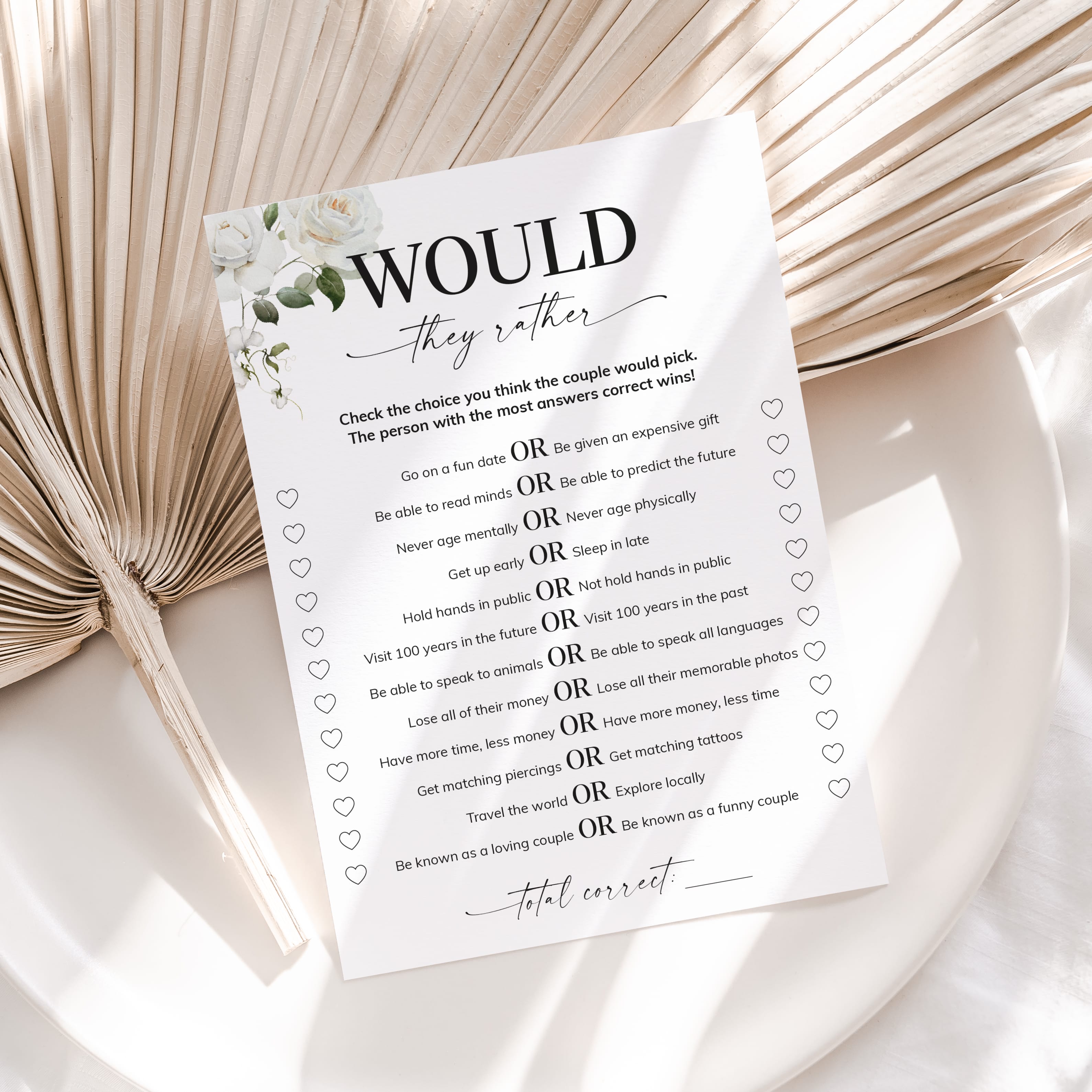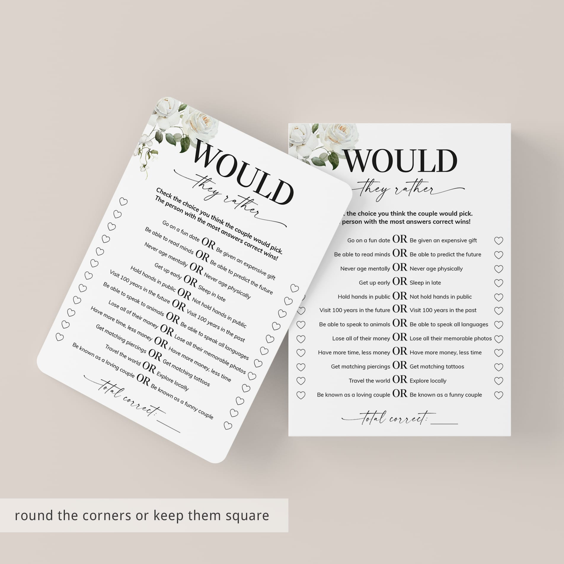 Test your guests how well they know the anniversary couple and play "Would they rather" with this elegant floral anniversary party game. It is a great way to bring disparate people together and to put them all in a party mood. It's the perfect addition to any anniversary party, no matter how many years you are celebrating.